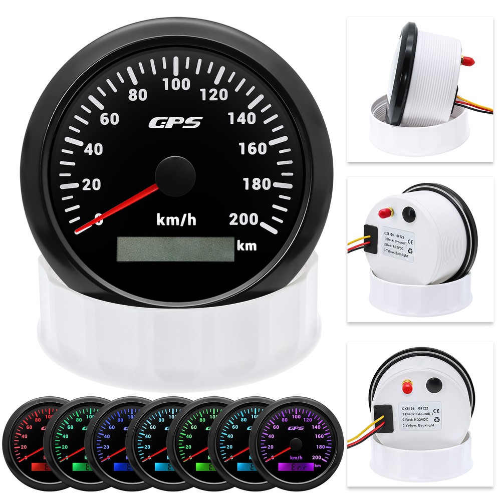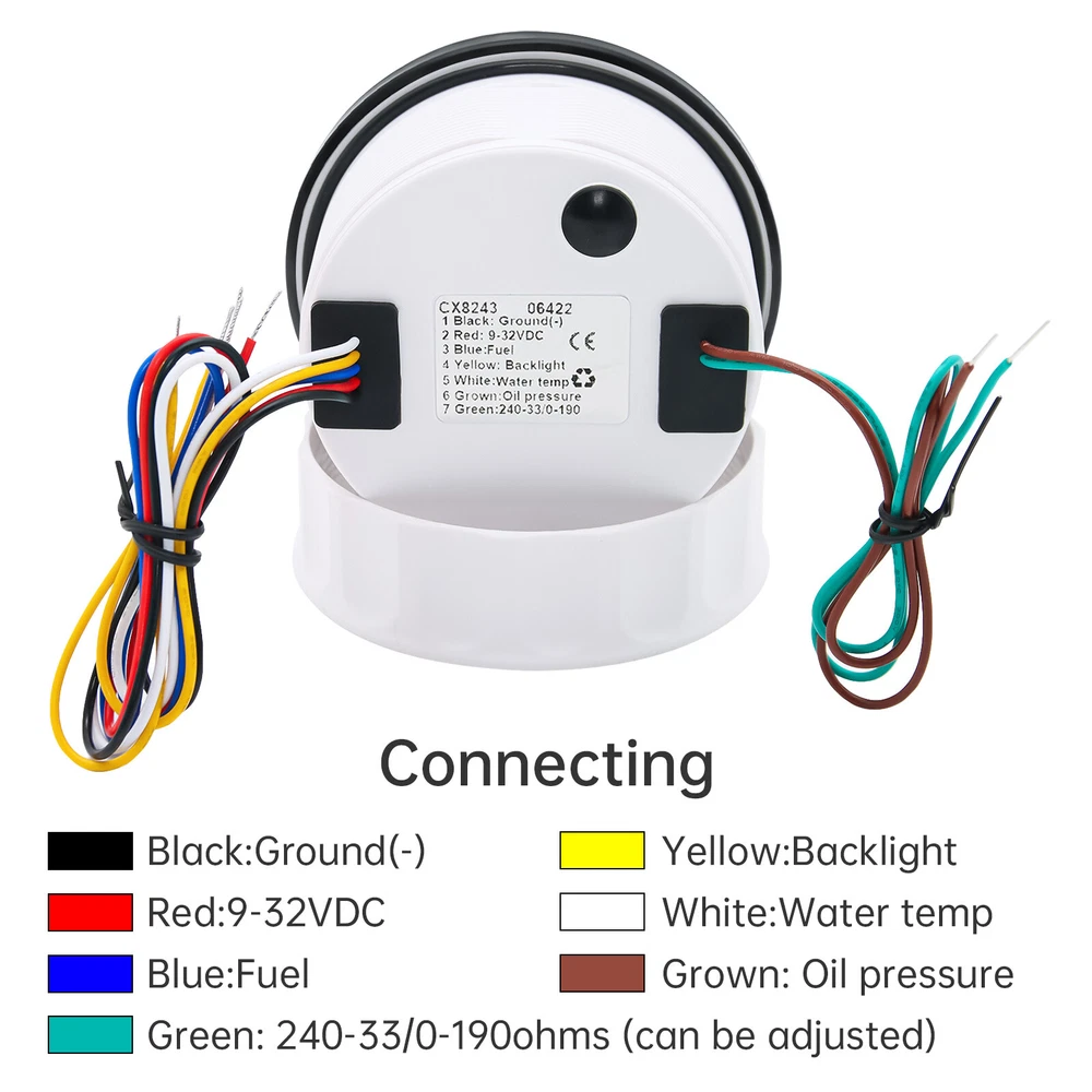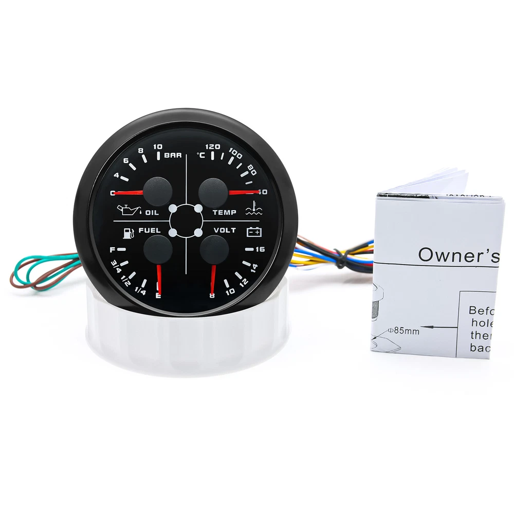 3 Gauge Set 85mm GPS Speedometer 200km/h Tacho 4000RPM & 4in 1 Gauge With Sender 3 Gauge Set With Sender 85mm GPS Speedometer 0-200Km/H Tachometer 4IN 1 Fuel Oil Volt Temp For Car Boat Feature: High-brightness LED backlight. 316 stainless steel for long-term use even in acid-base, humid environment. IP67 waterproof and dust-proof grade. With curved glass( with anti-fog function). Suitable for all kinds of vehicle modification. Using stepper motor drive pointer, accurate display of the engine speed, and with the LCD display clear display mileage. Gauges have many kinds backlight color (red,yellow,orange,green,blue,purple,white),customers can adjust any color that you like 4 IN 1 Gauge Input parameter Oil pressure sensor: 10~184ohms Temperature sensor: 301~22ohms Fuel level sensor: 0~190ohml240~30ohms(can be adjusted, default 0-190Ohms) Environmental Operating voltage: 9 to 32 Volts(DC) Power Consumption: <120mA Operating Temperature: -20~70degrees Storage Temperature: -30~80degrees Engine oil pressure: 0~10 bar Engine temperature: 40~120 ℃ Battery voltage: 8-16V Fuel level: 0~ 100% Degree of Protection lp67 1、Default input signal is 0~190ohm, when 7-Green connect to Ground, input signal change to 240~33ohm; 2、Default input signal is 240~33ohm, when 7-Green connect to Ground, input signal change to 0~190ohm. GPS Speedometer Specifications Dial: Black&Silver Material: Stainless Steel 316L Bezel + Anti-fog Glass Install Diameter: Φ85mm or 3-3/8" Signal: GPS Working Voltage: 9~32V DC Working Current: ≤100mA Operating Temperature: -30℃ ~ 75℃ Storage Temperature: -40℃ ~ 85℃ Size: 12x8x12cm / 4.72x3.1x4.75 inch IP67 waterproof and dustproof grade Indication Range: 0-200km/h Backlight:7 Colors Backligt Tachometer Specification: Size:85mm Engine hours: 0.0-99999.9H Working voltage: 9-32VDC Waterproof and dustproof grade IP67 Working current: <120mA Working temperature: -30-70℃ Storage temperature: -40-85℃ Backlight :7 Color backlight Indicating Range: 0~8000RPM Color:Black&Silver Signal: Pulse Package Included: 1X 85mm Tachometer 1X 85mm GPS speedometer 1X 85mm 4 in 1 Multifunctional Gauge 1X GPS Cable 1X Fuel Sender 240-33ohms 1X Water temp sensor 1/8NPT 1X Oil pressure sensor 1/8NPT 1X Tacho sensor 3X Cable 3X Installation Instruction