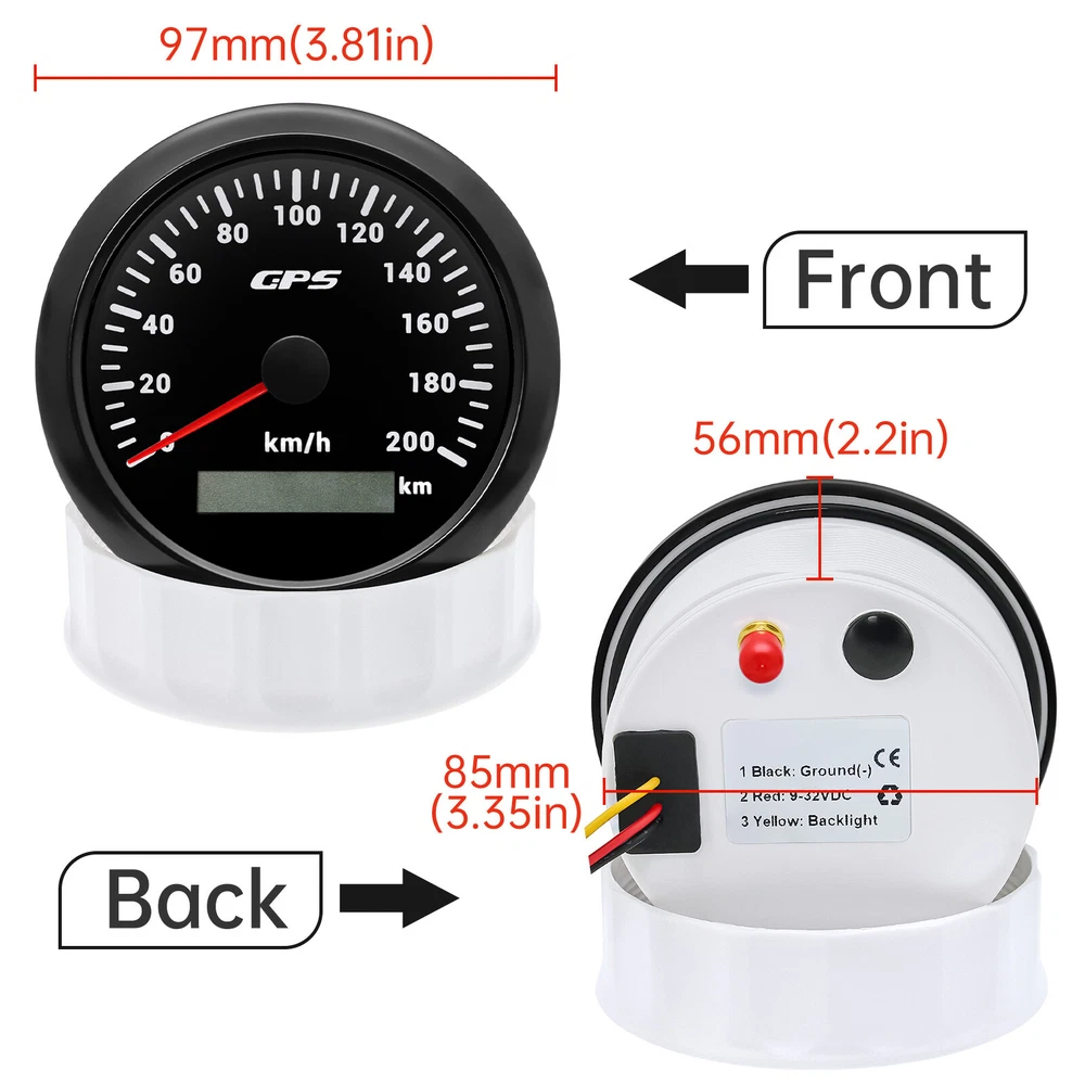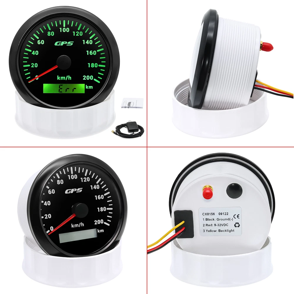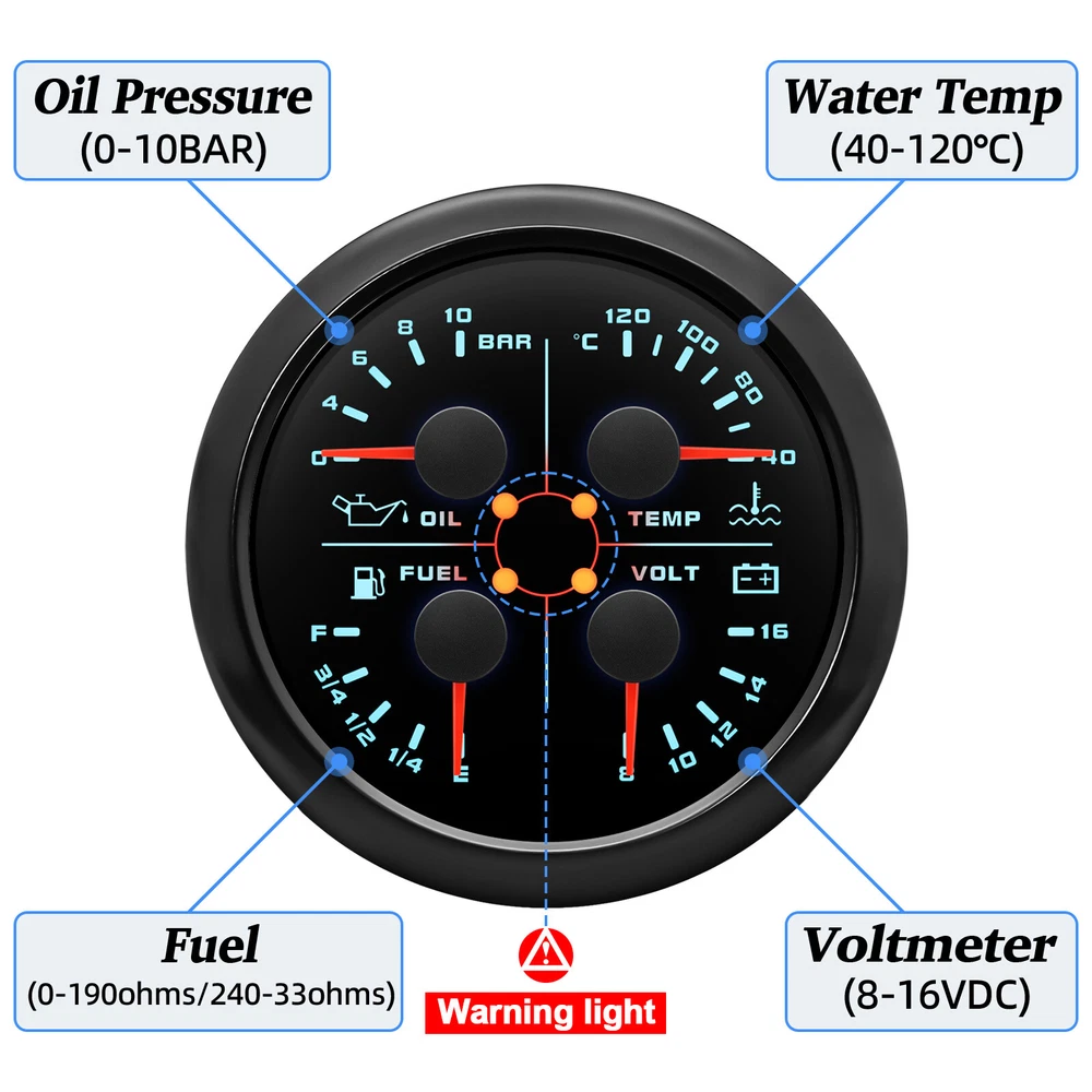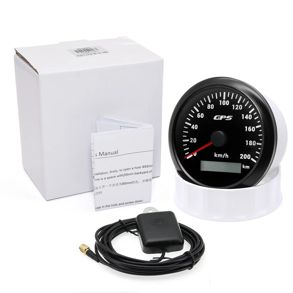 3 Gauge Set 85mm GPS Speedometer 200km/h Tacho 4000RPM & 4in 1 Gauge With Sender 3 Gauge Set With Sender 85mm GPS Speedometer 0-200Km/H Tachometer 4IN 1 Fuel Oil Volt Temp For Car Boat Feature: High-brightness LED backlight. 316 stainless steel for long-term use even in acid-base, humid environment. IP67 waterproof and dust-proof grade. With curved glass( with anti-fog function). Suitable for all kinds of vehicle modification. Using stepper motor drive pointer, accurate display of the engine speed, and with the LCD display clear display mileage. Gauges have many kinds backlight color (red,yellow,orange,green,blue,purple,white),customers can adjust any color that you like 4 IN 1 Gauge Input parameter Oil pressure sensor: 10~184ohms Temperature sensor: 301~22ohms Fuel level sensor: 0~190ohml240~30ohms(can be adjusted, default 0-190Ohms) Environmental Operating voltage: 9 to 32 Volts(DC) Power Consumption: <120mA Operating Temperature: -20~70degrees Storage Temperature: -30~80degrees Engine oil pressure: 0~10 bar Engine temperature: 40~120 ℃ Battery voltage: 8-16V Fuel level: 0~ 100% Degree of Protection lp67 1、Default input signal is 0~190ohm, when 7-Green connect to Ground, input signal change to 240~33ohm; 2、Default input signal is 240~33ohm, when 7-Green connect to Ground, input signal change to 0~190ohm. GPS Speedometer Specifications Dial: Black&Silver Material: Stainless Steel 316L Bezel + Anti-fog Glass Install Diameter: Φ85mm or 3-3/8" Signal: GPS Working Voltage: 9~32V DC Working Current: ≤100mA Operating Temperature: -30℃ ~ 75℃ Storage Temperature: -40℃ ~ 85℃ Size: 12x8x12cm / 4.72x3.1x4.75 inch IP67 waterproof and dustproof grade Indication Range: 0-200km/h Backlight:7 Colors Backligt Tachometer Specification: Size:85mm Engine hours: 0.0-99999.9H Working voltage: 9-32VDC Waterproof and dustproof grade IP67 Working current: <120mA Working temperature: -30-70℃ Storage temperature: -40-85℃ Backlight :7 Color backlight Indicating Range: 0~8000RPM Color:Black&Silver Signal: Pulse Package Included: 1X 85mm Tachometer 1X 85mm GPS speedometer 1X 85mm 4 in 1 Multifunctional Gauge 1X GPS Cable 1X Fuel Sender 240-33ohms 1X Water temp sensor 1/8NPT 1X Oil pressure sensor 1/8NPT 1X Tacho sensor 3X Cable 3X Installation Instruction