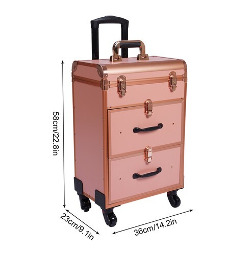 Application This rolling make-up case is suitable for professional make-up artists, hairdressers, nail technicians, and beauticians in beauty centers, salons, private homes, parties, and other occasions. Specification Number of Layers: 3 Color: Gold Material: Aluminum Alloy Frame and Plastic Fireproof Board Panel Shape: Rectangular Processing Method: Frosted Rolling Wheel Style: Universal Wheel Carrying Parts: Retractable Handle Gross Weight: 9kg/ 19.8lbs Net Weight: 7.5kg/16.5lbs Package Size: 57*42*32cm/22.4*16.5*12.6inch Product Size: 36*23*58cm/14.2*9.1*22.8in Maximum Load: 50kg/110.3lbs Package Included 1 x Makeup Case 4 x Universal Wheels 2 x Keys Notes Please allow the slight color difference caused by the shooting light and 1-3cm error due to manual measurement 3 Layers Rolling Makeup Train Case Cosmetic Trolley Makeup Storage Organizer Description This is a movable multi-layered makeup case designed for professional beauty artists to make up anytime and anywhere. This rolling makeup case is constructed of high-quality aluminum alloy that is sturdy and durable. It has extra large capacity compartments and multi-layer drawers. This case is ideal for all people who love beauty or nail art. Key Features High-quality Materials: The frame of the makeup case is wrapped with high-quality aluminum alloy, which will not easily rust and fade. And the thicker, all-aluminum drawbar makes the case more stable, refusing to shake. Large Capacity: This makeup case has 3 layers, the top layer can store nail polish or lipstick; the bottom two drawers can store full-size cosmetics and beauty appliances, such as perms, manicure machines and light therapy supplies. This multifunctional product can meet your storage needs. Excellent Weight-bearing Capacity: The rectangular construction and aluminum alloy frame give the case a superb load-bearing capacity (up to 110.3 lbs). You can safely put all your hair and beauty tools on it. Sorted Storage: Beauty products with different functions and sizes are stored in the corresponding drawer and compartment, making the tools ranged orderly, so it is convenient for you to quickly find the tools you want. Easy to Move and Carry: The universal wheels are easy to move and very convenient, especially for nail salons and beauty salons that have a lot of tools and need to move frequently. And it comes with a telescopic pull bar ( maximum length is 32.7inchs ) and a top handle, which is easy to carry on trips and business trips. Stylish Appearance: This rolling make-up case gives a stylish and exquisite look with its simple construc tion and stylish gold . Such a retro make-up case will decorate your dressing room well and make a good impression when you are working outside. Secure & Reliable: The metal locks of the case protect the contents securely and the lockable design ensures security and privacy. Worry-free Service: We have been working hard to provide better service and quality for our customers, which is our goal. If there is any quality problem with our products. Please contact us in time. Details Transparent Storage Bag: The transparent storage bag on the inside of the lid allows for wet and dry storage, for example, you can store wet beauty eggs and powder puffs to avoid cross-contamination. Rounded Edges: The top of the cosmetic case has been designed with rounded corners rather than sharp edges to avoid scuffing. Reinforced Lock: Reinforced lock not only makes it convenient for you to open and close, but also does not affect the appearance, and solves the embarrassment of bursting when going out. Application This rolling make-up case is suitable for professional make-up artists, hairdressers, nail technicians, and beauticians in beauty centers, salons, private homes, parties, and other occasions. Specification Number of Layers: 3 Color: Gold Material: Aluminum Alloy Frame and Plastic Fireproof Board Panel Shape: Rectangular Processing Method: Frosted Rolling Wheel Style: Universal Wheel Carrying Parts: Retractable Handle Gross Weight: 9kg/ 19.8lbs Net Weight: 7.5kg/16.5lbs Package Size: 57*42*32cm/22.4*16.5*12.6inch Product Size: 36*23*58cm/14.2*9.1*22.8in Maximum Load: 50kg/110.3lbs Package Included 1 x Makeup Case 4 x Universal Wheels 2 x Keys Notes Please allow the slight color difference caused by the shooting light and 1-3cm error due to manual measurement, and make sure you do not mind before you order. Payment Delivery details Terms of sales About us Contact us Payment We accept ebay payment 。 Fees such as import duties, taxes are not included in the item price or shipping costs. These charges are the buyer's responsibility. Delivery details Shipping: 2-9 working days to: USA Terms of sales We maintain high standards of excellence and strive for hundred percent customer satisfaction. Feedback is very important to us. We hope that you contact us immediately before you give neutral or negative feedback, so that we can address your concerns. It is impossible to address issues if we do not know about them! About us Your satis faction is our ultimate goal. We work hard to earn your trust and future business. Our certified technicians have tested each item before shipping. The unit comes with 1 year limited warranty on all manufacturing defects. a) If you receive a defective item, you may return it or ask for a discount. Please contact us within 14 days after you receive the package. b) What you returned must be intact and in its original packaging as re? u. Customer is responsible for shipping costs of the returned item. c) We will cover the cost of shipping back t with the shipping rate indicated in the registration page. We will send you a new unit or refund the full payment you paid. Thank you. Contact us Business Hour Business Hour: Monday To Friday: 8:30 AM to 5:00 PM (Beijing China time) Due to time zones, our reply to your questions may not be immediately. But within above working time, we will reply your email within 24 hours. If it's non-wor