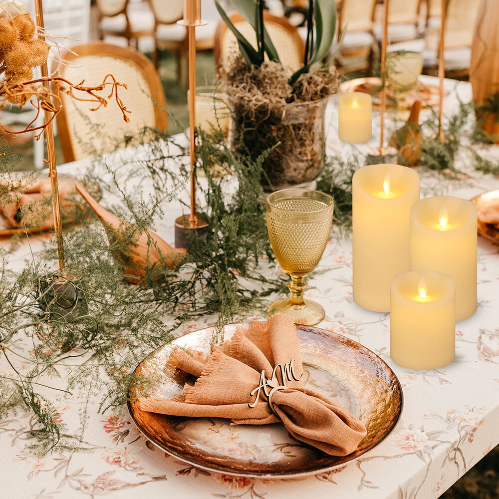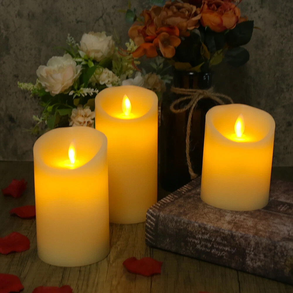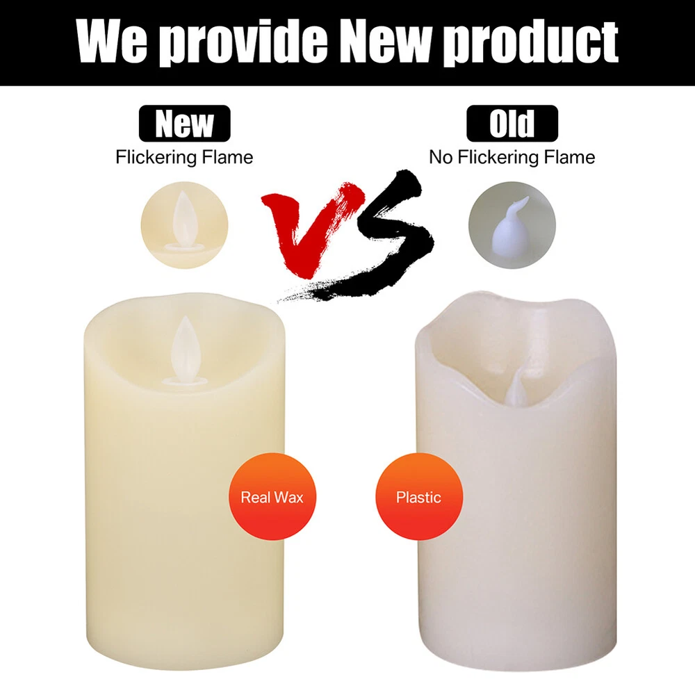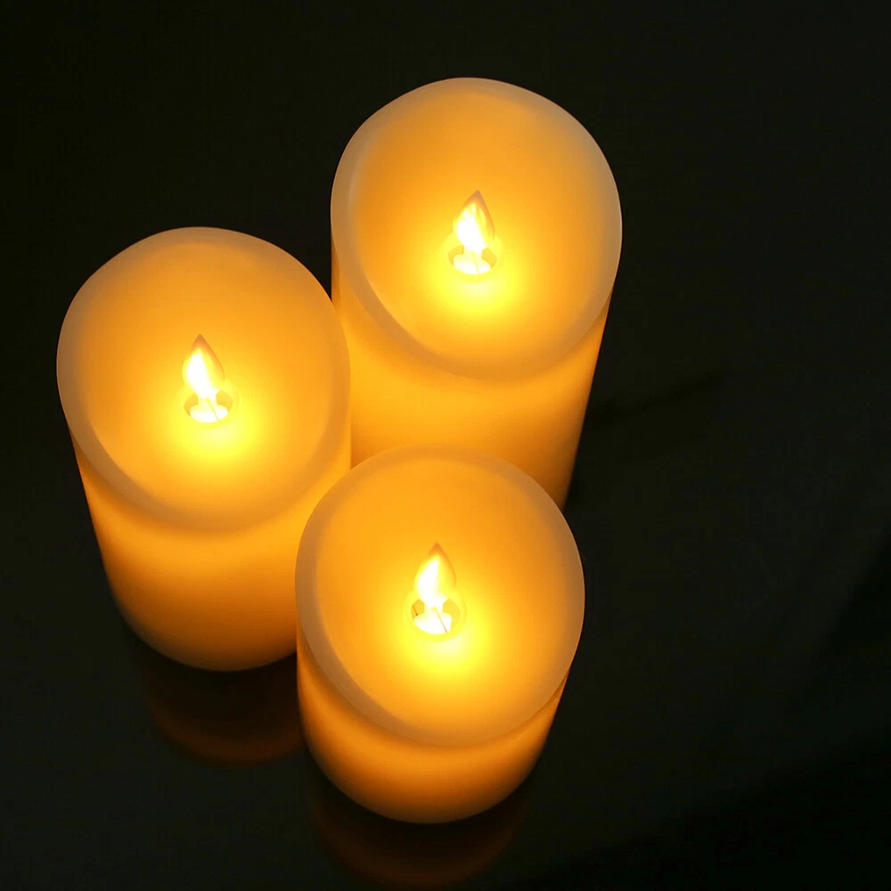 Descriptive: 3 LED Flameless candle (Size: Φ 7.5cm x H 10/12.5/15cm / Φ 2.9" x H 4"/5"/6"), 1 remote control,. Batteries are NOT include This big diameter and 3 different heights flameless candles can decorate your happy time! Safe To Use Around Children and Pets:Light is created by LED, The LED flameless candles without real fire, never worry about fire-related accidents again. Each LED bulb delivers 50,000 hours of lamp life. Use of 2 high-grade AA batteries that will provide 300 hours of continuous ambience 10-KEY REMOTE CONTROL with 16.4-foot range lets you display candles in hard-to-reach places. Timer feature lets you schedule your candles in 2-, 4-, 6- and 8-hour increments, cycling every 24 hours SMOKELESS AND DRIPLESS CANDLES with smooth, classic ivory color are ideal for bookshelves, bedrooms and as safe focal points in holiday wreaths and centerpieces These decorative moving wick candles can be widely applied to birthday, Christmas, home decorations, bars, hotel, parties, holidays, wedding, or other occasions. Specification: Product: LED Candle Lamp Material: ABS Color: Ivory Size: Φ 3" x H 4"/5"/6" On-Off Button: Illuminating the Candle On=Off (Note:Before you use the Remote Control, switch the ON-OFF button to ON at the bottom of the LED candles). How to illuminating the Candle: Move the OFF-ON switch on the bottom to ON. The candle will illuminate until you manually move the switch to OFF. ON-OFF button: Illuminating the Candle On=Off (Note:Before you use the Remote Control, switch the ON-OFF button to ON at the bottom of the LED candles). TIMER: set On/Off Automatic Time feature, set to 2Hours/4Hours/6Hours/8Hours. Mode: Candle-Flickering Lights; Light-Non-Flickering Lights. Brightness Control: Left button to lower the brightness Right button to increase brightness. Package Included: - 1 x LED Candles (Size: D 2.9" x H 4") - 1 x LED Candles (Size: D 2.9 " x H 5") - 1 x LED Candles (Size: D 2.9 " x H 6") - 1 x 10 Key Remote Control More Tips: 1. This candle is made of real wax and is flammable. Do not attempt to light this candle. 2. Keep out of direct sunlight, away from heat sources and out of extreme temperatures or your candle may soften or melt. 3. Constant use of the timer however may considerably reduce battery life.