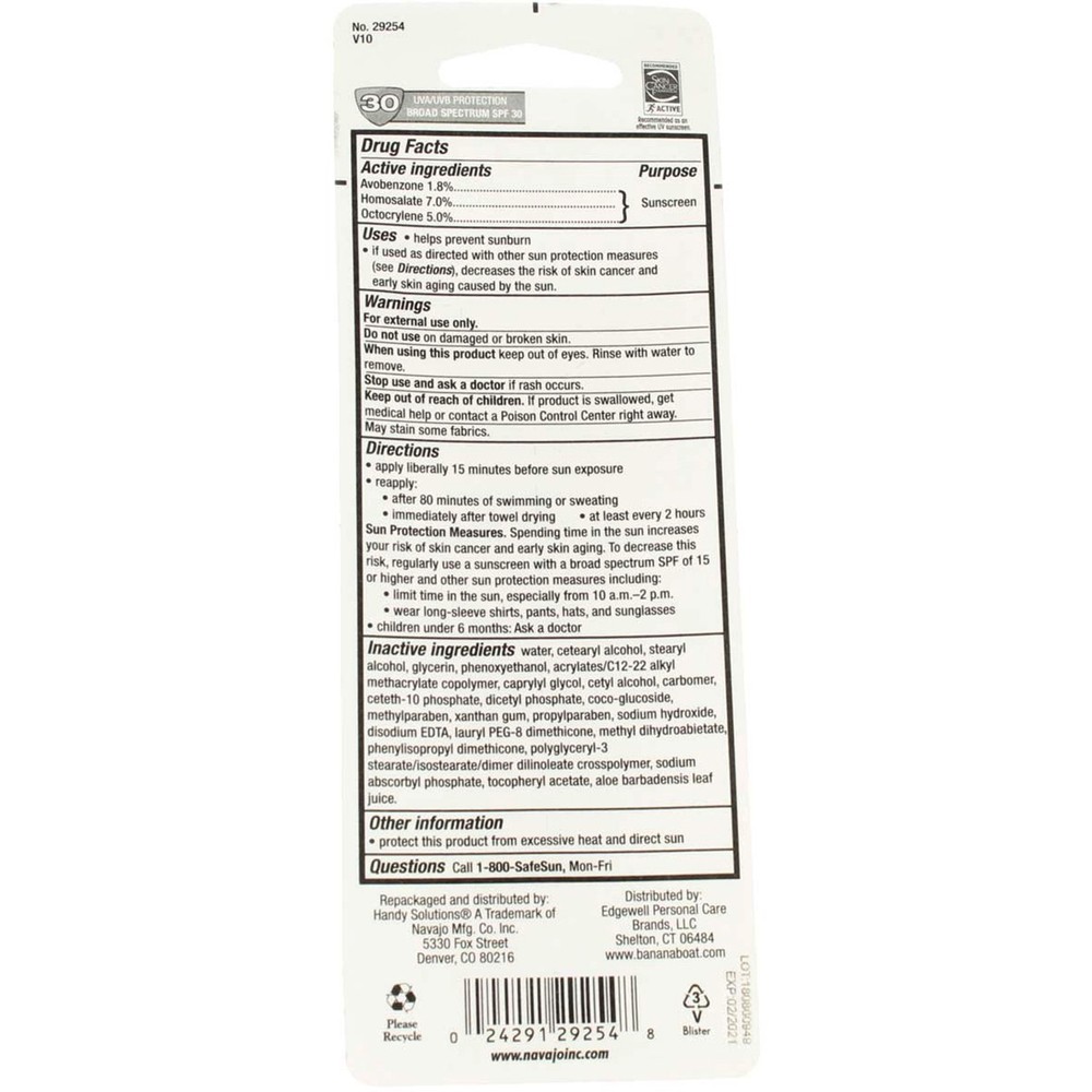 Product Description Banana Boat® Sport Performance® Sunscreen offers long-lasting protection that stays on in 7 conditions. The non-greasy lotion provides powerful protection that absorbs quickly and won't run into eyes. Specifically designed for sports enthusiasts and active sun lovers who don't want to be slowed down when playing outside. This travel size lotion tube is perfect for on the go protection from the sun's harmful rays! 1 ounce per bottle Sold in increments of 6 bottles Convenient travel size Blister card packaging SPF 30 Broad-spectrum UVA and UVB protection Water-resistant and sweat-resistant for up to 80 minutes Lightweight feel, non-greasy Won't run into eyes Fast absorbing No added fragrance Product Description Banana Boat¬Æ Sport Performance¬Æ Sunscreen offers long-lasting protection that stays on in 7 conditions. The non-greasy lotion provides powerful protection that absorbs quickly and won't run into eyes. Specifically designed for sports enthusiasts and active sun lovers who don't want to be slowed down when playing outside. This travel size lotion tube is perfect for on the go protection from the sun's harmful rays! 1 ounce per bottle Sold in increments of 6 bottles Convenient travel size Blister card packaging SPF 30 Broad-spectrum UVA and UVB protection Water-resistant and sweat-resistant for up to 80 minutes Lightweight feel, non-greasy Won't run into eyes Fast absorbing No added fragrance Disclaimer The product descriptions and instructions provided by vitabox.com are for informational purposes only and are qualified in their entirety by the information available from manufacturers of the products. You should carefully read all product packaging, and contact the manufacturer with any questions before using a product. While we endeavor to ensure that product descriptions are current, manufacturers sometimes change their products. We are not liable for inaccuracies or misstatements about products. We do not provide medical advice or recommendations. You should not use the information provided by vitabox.com for diagnosing or treating a health problem or disease. If you have or suspect that you have a medical problem, immediately contact your health care provider. Information and statements regarding dietary supplements have not been evaluated by the Food and Drug Administration or any other government agency and are not intended to diagnose, treat, cure, or prevent any disease.