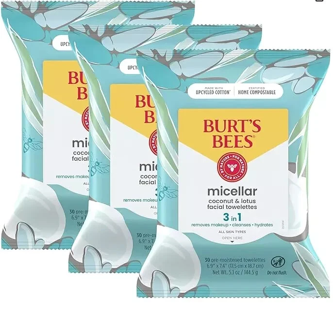 Brand New (SEALED) NOURISHING INGREDIENTS: Three 30 ct. packs of Burt's Bees Micellar Facial Towelettes With Coconut and Lotus 3-IN-1 WIPES: Facial cleansing wipes made with upcycled cotton hydrate skin and remove pore-clogging dirt, oil and makeup without the need for harsh scrubbing REFRESHING SCENT: Facial wipes leave skin feeling soft and clean with the fresh scent of coconut and lotus water FOR ALL SKIN TYPES: Makeup remover wipes designed for normal, oily or acne-prone skin types EASY TO USE: Gently wipe face with face cleanser wipe to remove impurities; no need for rinsing NATURAL ORIGIN: Formulated without parabens, phthalates, petrolatum or SLS, the 99.5% natural origin face care formula nourishes and revitalizes skin; Leaping Bunny Certified (never tested on animals) Gently remove makeup, cleanse and hydrate your skin using Micellar Facial Towelettes With Coconut and Lotus. Designed for all skin types, including sensitive skin, these 3-in-1 facial cleanser wipes help to hydrate your skin and remove pore-clogging dirt, oil and makeup in one simple step. The towelettes leave skin feeling soft, refreshed and clean with no greasy or oily residue left behind. These 99.5% natural origin towelettes are formulated without parabens, phthalates, petrolatum or SLS. Each plant-based towelette is made with at least 60% upcycled cotton and is Certified Home Compostable to help close the loop on waste. Simply wipe your face with the makeup remover cloths to remove impurities; theres no need for scrubbing or rinsing. Pair the facial wipes with other Burts Bees facial skin care products, including facial cleansers, facial toners and facial creams. Burts Bees is the No. 1 dermatologist-recommended natural skin care brand (1). 30 Count package of wipes total. (1) Based on a September 2021 NielsenIQ national survey of U.S. Dermatologists