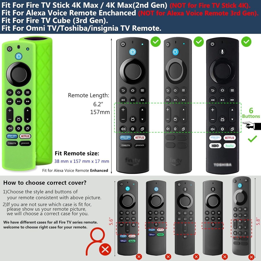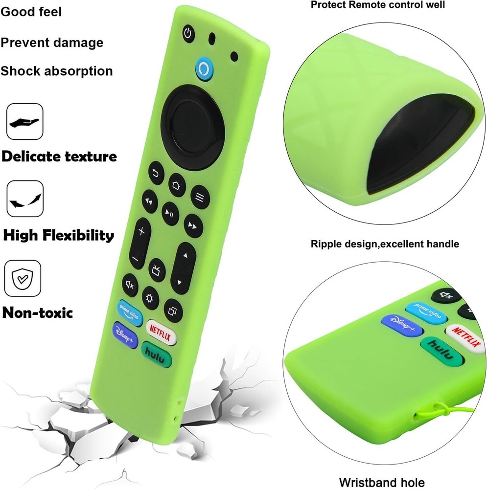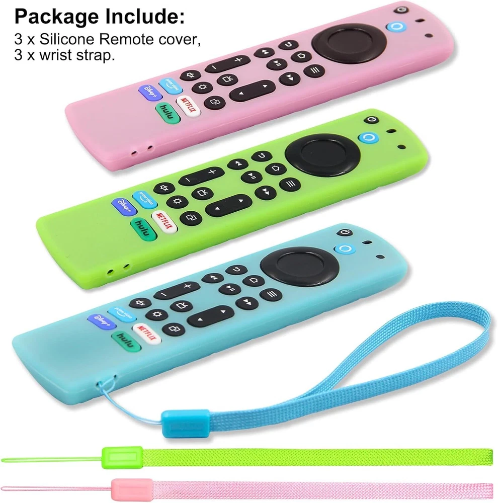 3 Pack Firestick Remote Cover, glow in the dark w Alexa Voice, 4K Max/Insignia/Pioneer/Omni(Green+ Turquoise+ Pink) [COMPATIBLE WITH] - silicone case was Designed for 6.2" Fire TV Edition Alexa Voice Remote Enhanced, for Fire TV Stick 4K Max Remote (NOT for Fire TV Stick 4K remote). Television Version Included: Fire TV 2-Series 2023, Fire TV Cube (3rd Gen), Fire TV Omni QLED Series 2022 / 2023, Insignia Fire TV 2020 / 2021 / 2022, Fire TV Omni Series 2021, Pioneer Fire TV 2021, M550 Series Fire TV). (NOT fit Alexa Voice Remote 3rd Gen / 2nd Gen, Lite 1st / 2nd Gen). [PREMIUM SILICONE] - Insignia Fire TV remote covers were made of friendly silicone material, harmless to kids & pets, washable, comfortable and durable. Texture grip design on the back of the case provides a nice grip, makes the remote easier to hold. Attention: For Fire TV Stick 4K Max Remote (NOT for Fire TV Stick 4K remote) [EASY TO FIND YOUR REMOTE] - Great fit for your Fire TV Alexa Voice Remote Enhanced, Dress up for your precious remote with eye-catching color, makes it much easier to find remote, make you to locate your remote quickly when you have multiple remotes mixed together. Colors help keep in correct room. And these covers can glow in the dark. (Note: Please expose it under strong lights for 5-10 minutes if it doesn't glow in the darkness.) Attention: For Fire TV Stick 4K Max Remote (NOT for Fire TV Stick 4K remote) [NO MORE DROPPING YOUR REMOTE] - With the Remote Sleeve on, you can hold the remote in hand without sliding out of hand whilst trying to change a channel etc. The fit is very snug, provides a comfortable and secure grip, protects your remote from accidental drops and scratches. It comes with a wrist cord so it get hung on wall by TV, so it doesn’t really get lost anymore. Attention: For Fire TV Stick 4K Max Remote (NOT for Fire TV Stick 4K remote) [DON'T WORRY ABOUT LOSING YOUR BATTERY] - The remote covers are made of soft silicone, durable, safe for your pets, children and families., Fits well, stays on, keeps the back of the remote on, protects the controller from normal separation of the rear panel and batteries if it is dropped on the floor, which gives the maximum protection of your streaming device voice remote. Attention: For Fire TV Stick 4K Max Remote (NOT for Fire TV Stick 4K remote) 1.6 inches x 6.3 inches x 0.4 inches. Weight: 2.29 oz Item model number EC605GRTUPK Connectivity technologies Infrared Color Green Turquoise Pink All Glow Product Dimensions 6.3 x 1.6 x 0.4 inches Country of Origin China Item Weight 2.29 ounces Shell Type Soft Special features Lightweight, Anti-Slip Form Factor Sleeve