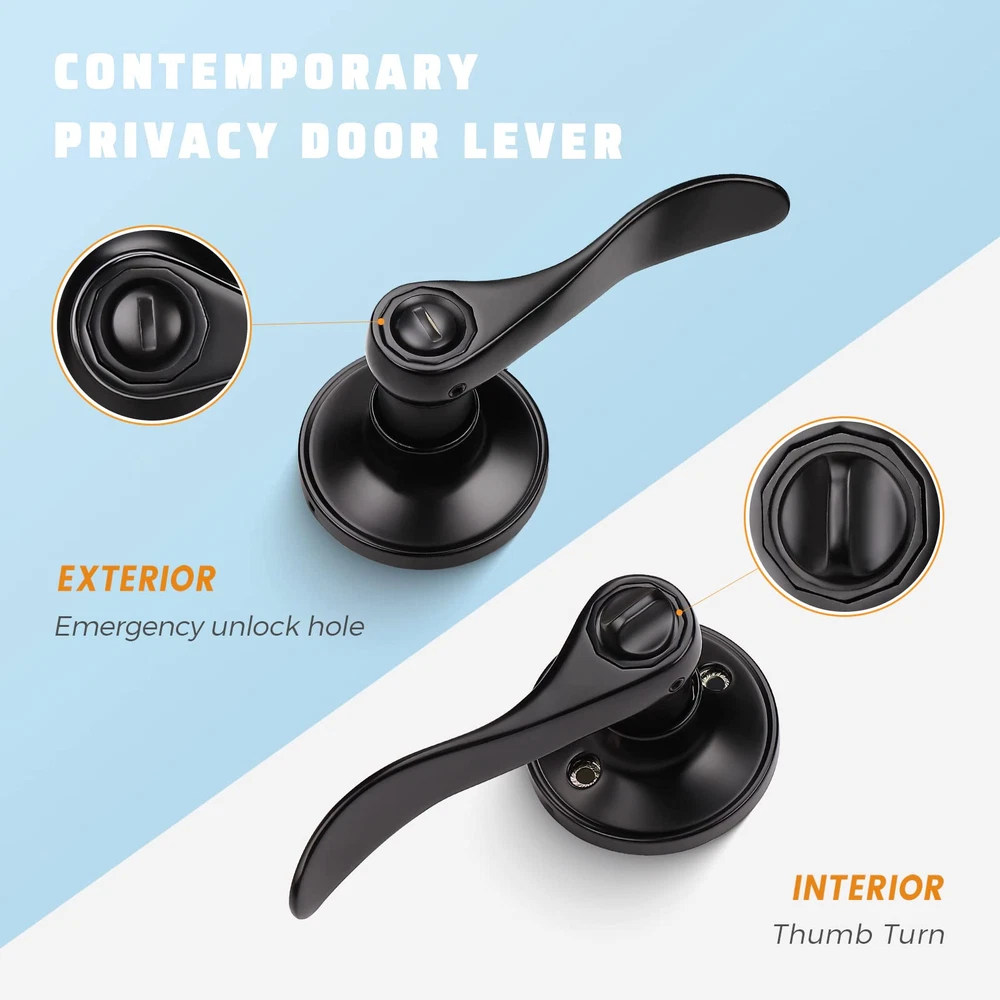 EASY INSTALLATION: Install your lockset in 10 mins. We now provide 3 long screws(1 with short screws and 2 are with bolts inside), no worry about missing parts. With the help of the detailed installation file, our children can make it. PRIVACY FUNCTION(LOCK WITH NO KEY): The black door knob can be locked inside with Thumb Turn and opened outside in emergency(with flat-tip tools like coin or screwdriver). Use it for your guest room, bedroom, bathroom, interior locking door and other place where privacy needs; made of premier Zinc Alloy, together with the long-lasting Matte Black finish, this door handle will enhance the look and feeling of our home ONE SIZE FITS MOST: This black door handle fits 1-3/8" to 1-3/4"(35mm to 45mm) doors with adjustable latch 2-3/8" or 2-3/4"(60mm or 70mm); Rosette Diameter: 2-3/5"(65mm); Lever Length: 4-7/10"(120mm); Reversible for both left handed and right handed doors. (Notice: The latch plate is unremovable.) QUALITY IS BUILT IN: Strong internal structure, smooth door lever edge, and advanced paint technology, the black interior door handle is not only comfortable to use for all people, but also last long enough under different condition(passed 72h salt spray test); exceeds 250,000 cycles, the door latch is thick enough and will not be easily bent out of shape after years of use 365 DAYS GUARANTEE: stands behind our products. High-quality door hardware is not only your persuit, but also our top priority. Your shared experience/feedback is welcome. We offer 1 year trial. If there is any problem or worry, please feel free to let us know.