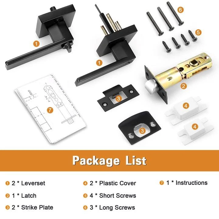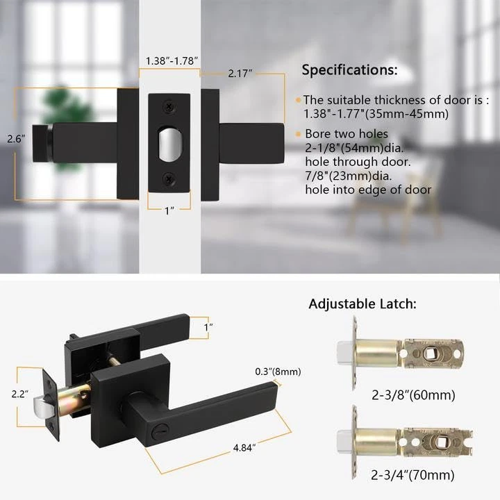 【Privacy】:3 Lock Per Package(for 3 door). Privacy door lever with elegant matte black finish. Confirm with ANSI Grade 3, Exceeds 200,000 cycles (4 kind of plates for standard doors) 【Function】: Privacy function, without keys. When locked from inside, the lock could be opened from outside with aemgency tool, such as a coin. Best use for bathroom or bedroom door 【Steel Adjustable Latch】: It has adjustable universal latch - 2-3/8" or 2-3/4", Fits doors 1-1/4 inch to 1-3/4 inch 【Easy Installation 】: Easy to install with all accessories included. The easy installation makes for a one-person project. It fits both right and left handled doors 【Dimensions】 : Lever Length: 4.84"(123mm) , Rosette Diameter: 2.56"(65mm). Note : The square plate of the latch is non-removable
