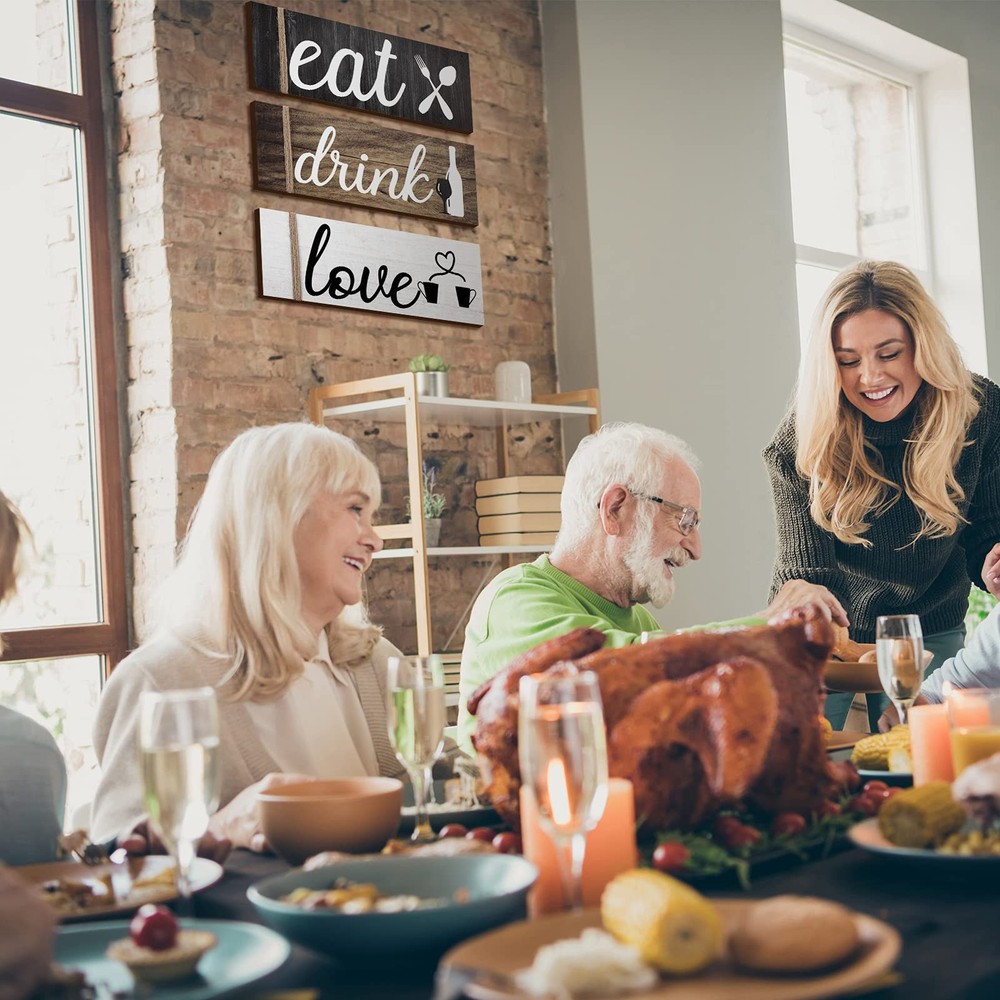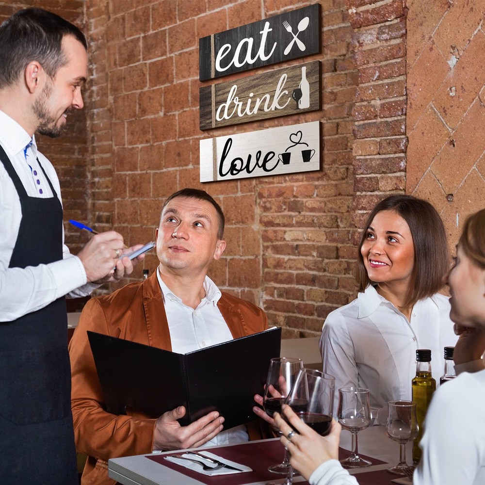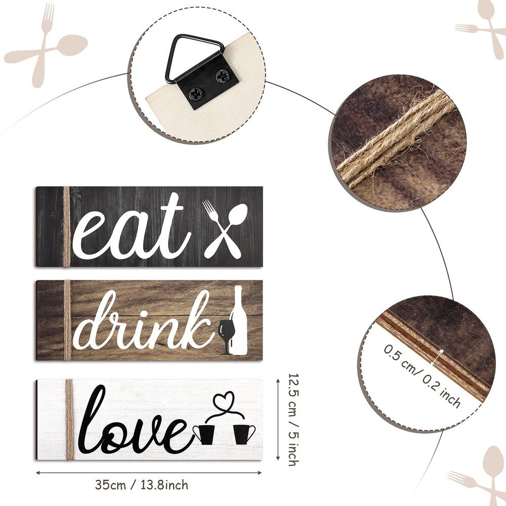 Features: Durable and long-lasting: These rustic wooden kitchen wall decor is made of natural wood, non-toxic, no smell, lightweight but durable, bright color matching not easy to fade, and will not break from the middle, which can be applied for a long time. Easy to blend with your home decor: These eat drink love signs can be hung in your house or office, living room, bedroom, kitchen, classroom, dorm or apartment, dining room, living room, bar, cafe, restaurant and so on. Suitable for rustic, farmhouse, shabby, vintage, traditional or modern home decor. Specifications: Material: wood Size: 35 x 12.5 cm/ 13.8 x 5 inch Thickness: 5 mm/ 0.2 inch Package includes: 3 x Rustic wood home signs Notes: Manual measurement, please allow slight differences in size. Because of the nature of the wood itself, wood knots and other markings in the wood are natural and not imperfections. What you get: the package comes with 3 pieces of wood home signs, one decorated with eat and a pair of spoons and forks, one decorated with drink and a bottle of red wine and a goblet, and one decorated with love and a pair of lovers' cups; Each piece is tied with twine on the left and is carefully designed Sturdy material: these rustic wooden kitchen wall decor is made of natural wood, non-toxic, no smell, lightweight but durable, bright color matching not easy to fade, and will not break from the middle, which can be applied for a long time Appropriate size: each wood home sign measures approx. 35 x 12.5 cm/ 13.8 x 5 inch, and the thickness is approx. 5 mm/ 0.2 inch, the size is just right and enough to attract your attention Wide range of applications: these eat drink love signs can be hung in your house or office, living room, bedroom, kitchen, classroom, dorm or apartment, dining room, living room, bar, cafe, restaurant and so on; And you can also give them as gifts to others Convenient to hang: there comes a considerate hanging design on the back of each wooden home sign, which makes them easy and convenient for you to hang on the wall of your house, providing your house with a stylish and eye-catching appearance