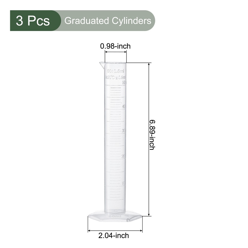 Document MULTIPURPOSE - Our graduated cylinders are great for lab, class, experiment, and daily use, suitable for teachers, technicians, etc.WHAT YOU GET - The package comes with 3pcs 50ml graduated cylinders, in size of 25 x 175 mm / 0.98 x 6.89 inch, [Tube diameter x total height].The base size is 60 x 52 mm / 2.36 x 2.04 inch.The tolerance is ±0.5ml at 20℃.RELIABLE MATERIAL - This graduated cylinder is made of clear plastic, which is durable and reusable.SPECIAL DESIGNED - Hexagonal base keep the cylinder tube firm and steady.Clear scale on the tube body, for a precise measurement. And the scale will not be faded.Round edge and a tapered pour spout, benefit for filling and pouring, easy to see and use.KINDLY NOTE - This product cannot be used as a reaction container. Please avoid heating, concentrated acids or bases while using it. 3 Pcs Measuring Graduated Cylinders,for Chemical Measuring(Clear White, 50ml) MULTIPURPOSE - Our graduated cylinders are great for lab, class, experiment, and daily use, suitable for teachers, technicians, etc. WHAT YOU GET - The package comes with 3pcs 50ml graduated cylinders, in size of 25 x 175 mm / 0.98 x 6.89 inch, [Tube diameter x total height]. The base size is 60 x 52 mm / 2.36 x 2.04 inch. The tolerance is ±0.5ml at 20℃. RELIABLE MATERIAL - This graduated cylinder is made of clear plastic, which is durable and reusable. SPECIAL DESIGNED - Hexagonal base keep the cylinder tube firm and steady. Clear scale on the tube body, for a precise measurement. And the scale will not be faded. Round edge and a tapered pour spout, benefit for filling and pouring, easy to see and use. KINDLY NOTE - This product cannot be used as a reaction container. Please avoid heating, concentrated acids or bases while using it. Hot Item Payment 1.We accept eBay payment . 2.Payment must be received within 7 business days of auction closing. Shipping 1.We ship to your eBay or Paypal address. Please make sure your eBay and Paypal address is correct before you pay. 2.Items will be shipped within 1-3 business day when we received payment. 3.Delivery time depends on destination and other factors. Description Policy 3 Pcs Measuring Graduated Cylinders,for Chemical Measuring(Clear White, 50ml) MULTIPURPOSE - Our graduated cylinders are great for lab, class, experiment, and daily use, suitable for teachers, technicians, etc. WHAT YOU GET - The package comes with 3pcs 50ml graduated cylinders, in size of 25 x 175 mm / 0.98 x 6.89 inch, [Tube diameter x total height]. The base size is 60 x 52 mm / 2.36 x 2.04 inch. The tolerance is ±0.5ml at 20℃. RELIABLE MATERIAL - This graduated cylinder is made of clear plastic, which is durable and reusable. SPECIAL DESIGNED - Hexagonal base keep the cylinder tube firm and steady. Clear scale on the tube body, for a precise measurement. And the scale will not be faded. Round edge and a tapered pour spout, benefit for filling and pouring, easy to see and use. KINDLY NOTE - This product cannot be used as a reaction container. Please avoid heating, concentrated acids or bases while using it. Hot Item Payment 1.We accept eBay payment . 2.Payment must be received within 7 business days of auction closing. Shipping 1.We ship to your eBay or Paypal address. Please make sure your eBay and Paypal address is correct before you pay. 2.Items will be shipped within 1-3 business day when we received payment. 3.Delivery time depends on destination and other factors.