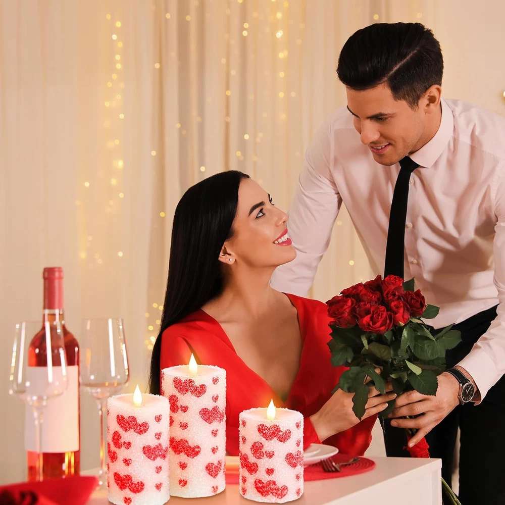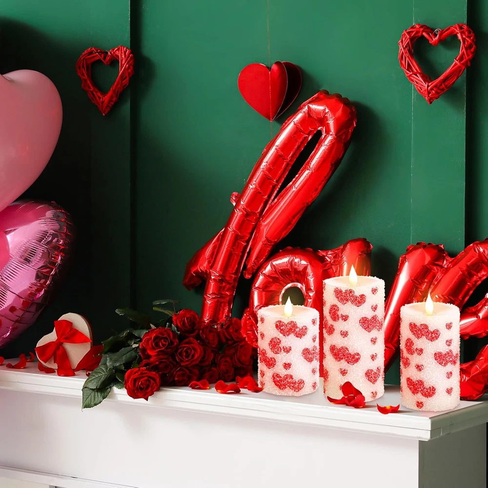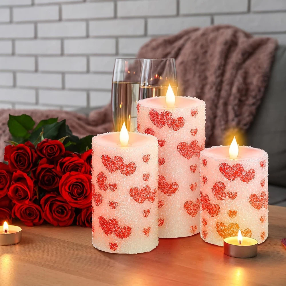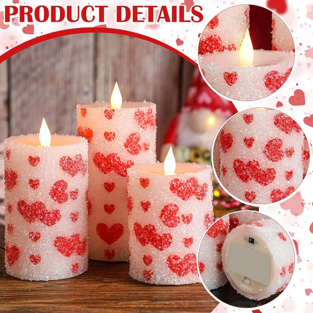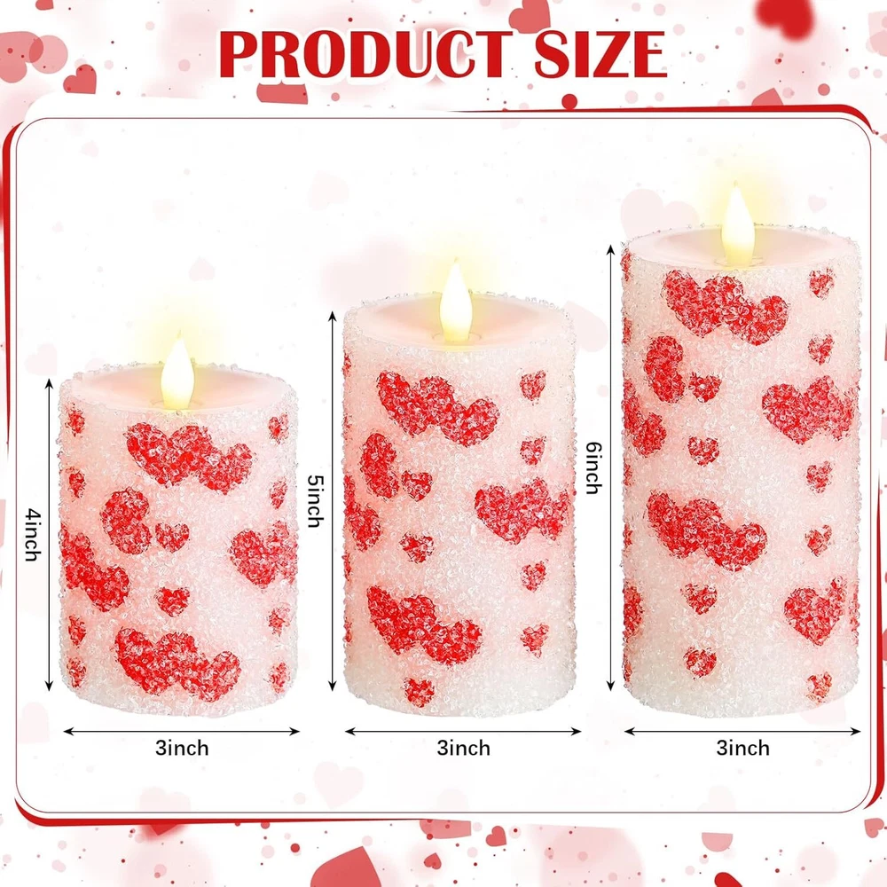 3 Pcs Valentine's Day Pillar Candles Flameless LED Red Heart red and white