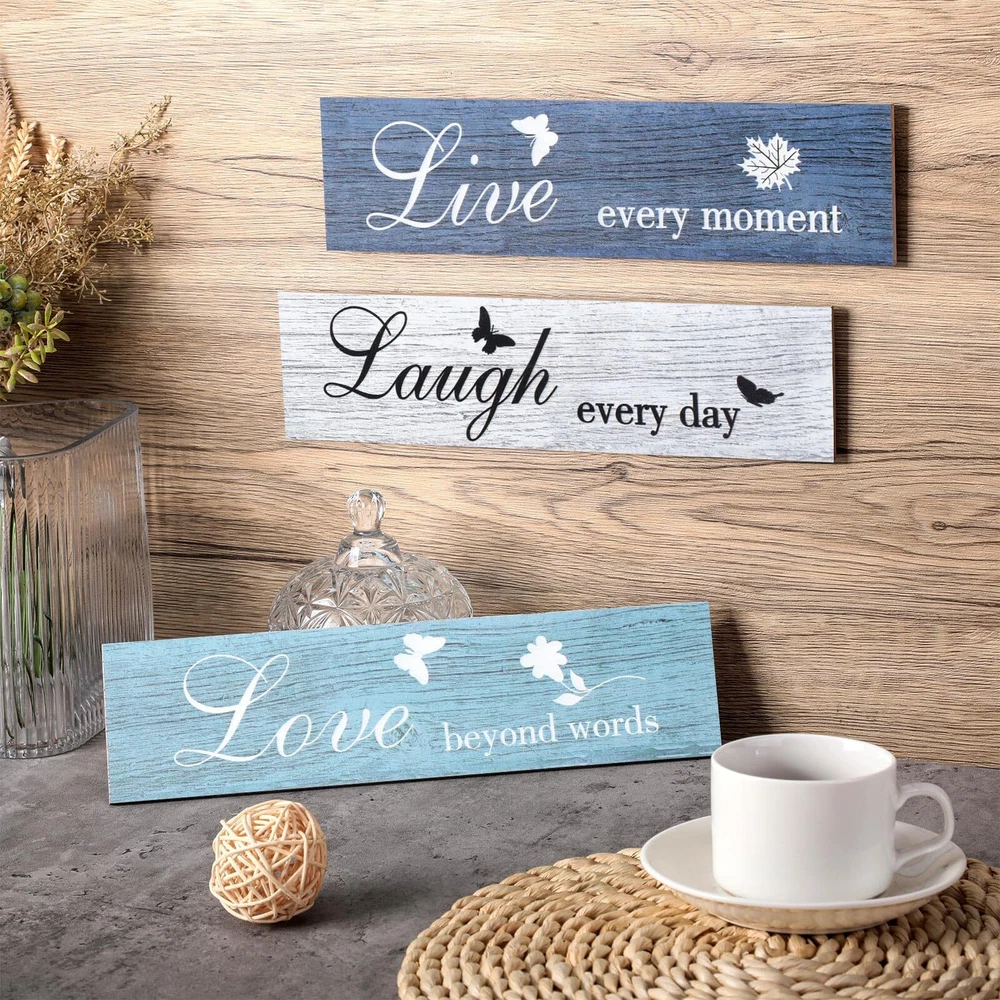 Features: Extensive application: These live love and laugh wooden plaques can be often seen at home, office, restaurant, cafe, bookstore, dessert , library or other places, not only can you hang them in living room, bedroom, study room, aisle, corridor, yard and so on, also place them directly on the shelf or cabinet, feasible for you to put them with other decorations there. Housewarming gifts: These artistic words of hanging wall wooden signs symbolize harmony, happiness, encouragement and unity, suitable for you to give them to your friends or family as considerate presents who are seeking home decorations, which can bring a warm feeling for their home. Specifications: Material: wood Color: as the picture shown Rustic wall wooden signs size: approx. 30 x 7.6 cm/ 12 x 3 inches Rustic wall wooden signs thickness: approx. 0.5 cm/ 0.2 inches Package includes: 3 x Rustic wall wooden signs Notes: Please allow a little error on the size due to manual measurement. The colors may exist slight difference due to different screen. What you will get: the package includes 3 pieces rustic wooden signs in different words about live, love and laugh, enough quantity for you to meet your daily decorations and make replacements, also packed well, avoiding being broken during transportation Sturdy material: these wooden wall decoration signs are made of quality wood, characterized with durability and good wooden texture, not easy to deform or break, also touch smoothly due to fine workmanship and polishing, which can be decorated repeatedly for a long time Easy to use: these are serrated hangers on the back of the wooden wall sign (each end has ), convenient for you to hang it on the wall or other places that have hooks, also easy for you to take off, meanwhile, the hanger design can help to prevent the wall from being imprinted with glue and leaving a trace Rustic design: these farmhouse wooden wall sign decorations are printed with cute butterflies and different quotes, namely [Live every moment], [Laugh every day] and [Love beyond words], suitable for you to decorate, which can create a style for your home Proper size: these rustic farmhouse wooden signs measure approx. 30 x 7.6 cm/ 12 x 3 inches and approx. 0.5 cm/ 0.2 inches in thickness, appropriate size and light weight for you to hang by yourself at home, also portable for you to carry and , would not take too much space