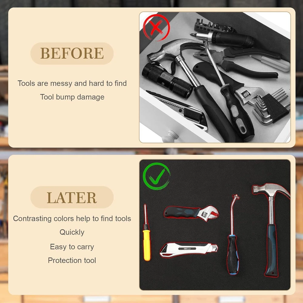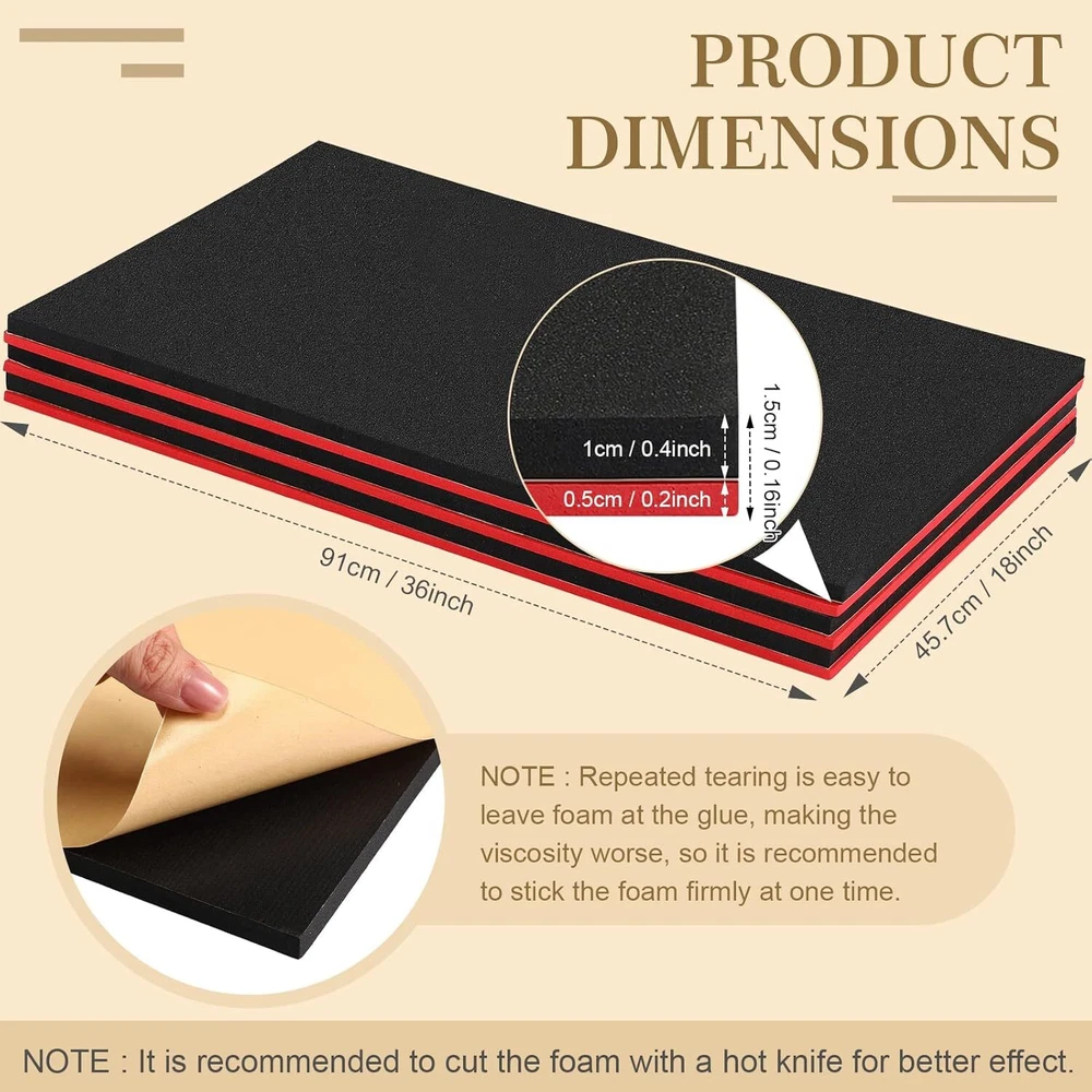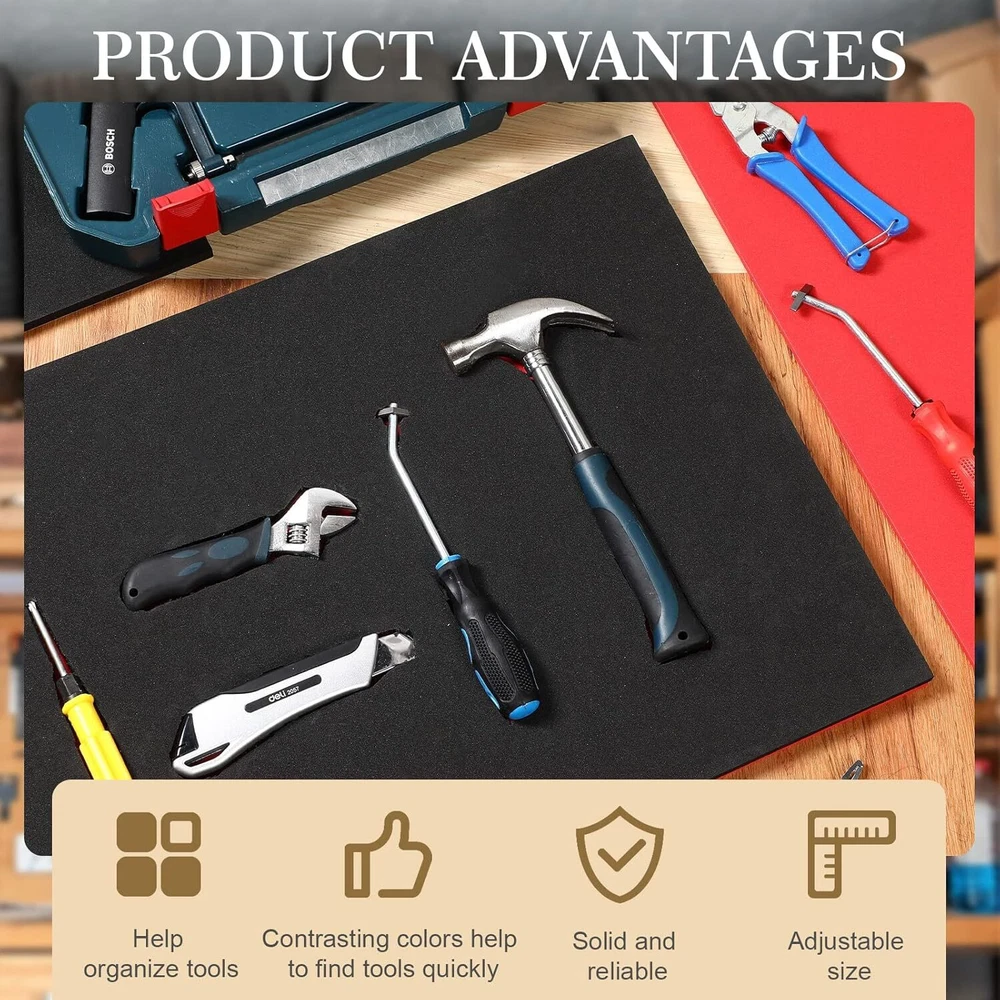 Product Description 3 Sets Tool Box Shadow Foam Organizers Tool Box Liner Adjustable Inserts Foam Non Slip Liner Mat for Tool Box, Cabinet and Chest Drawers, Black Top and Red Bottom (18 x 36 Inch) Package Includes: you will receive 3 sets of toolbox foam inserts, each has a red bottom and black top, enough quantity can meet your daily use and replacement needs, or you can share them with your family and friends 2 Colors Design: the toolbox accessories adopt the black top and red bottom design, contrasting colors can help you identify your missing tools instantly, and they also allow you to easily put your tools back in the right place, and it's easy for you to find what you want Adjustable Size: the size of the tool storage organizer is about 18 x 36 inches, and you can adjust the size according to your needs; You can outline the size of your tool on the black surface with a water pen, then cut it with a hot knife, tear off the backing paper, and stick the black foam with the red foam, then you can put in your toolbox and arrange the tools (toolbox and tools are not included); It is recommended to cut the foam with a hot knife for better effect Strong and Reliable: the adjustable tool chest insert is made of EVA foam material, not easy to fade and break, reliable and strong to use, besides, the black adhesive surface has sufficient stickiness and is not easy to fall off when sticking to the red foam; Repeated tearing is easy to leave foam at the glue, making the viscosity worse, so it is recommended to stick the foam firmly at one time Convenient to Carry: the foam tool box inserts fit many types of toolboxes, so they won't bump into each other inside, easy for you to carry when you go out to do some work outside, they can also be applied to cabinets and chests of drawers, convenient to use About Us We are a reputable seller with many years of experience selling on eBay. Our goal is to provide high-quality products and excellent customer service. Shipping Items will be shipped within 1-3 business days when we received payment. (Orders are not processed on weekends & holidays) Tracking information will be sent once item is shipped. Delivery time depends on destination and other factors Item is shipped to ebay address. Leaving correct address can minimize delay. For international shipping and shipping to Guam, Hawaii and Alaska, Please contact us before placing the order. International buyers please note: Import duties, taxes and charges are not included in the item price or shipping charges. These charges are buyer’s responsibility. We will try our best to reduce the risk of the custom duties. Local pick-up is unavailable at the moment. Contact Us We reply any email messages within 1 business / working days(off-duty at weekend). If you do not get a response from us, then please check your junk or spam mailbox. Our Business hours: Mon-Fri 9:00-18:00, UTC/GMT +8 hours. Please contact us either by clicking "contact seller" in the "purchase history" section or simply click "ask a question" at the bottom of this page. If you are unsatisfied with our item or service, please contact us before leaving any feedback. We are committed to resolve all issues in a friendly and satisfactory manner.