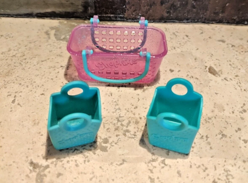 3 Shopkins shopping baskets 1 pink sparkly w/green handles and two small green
