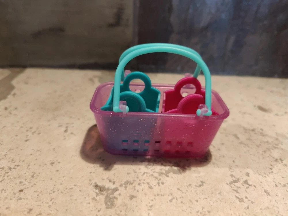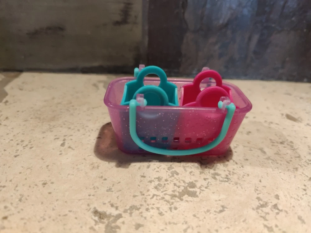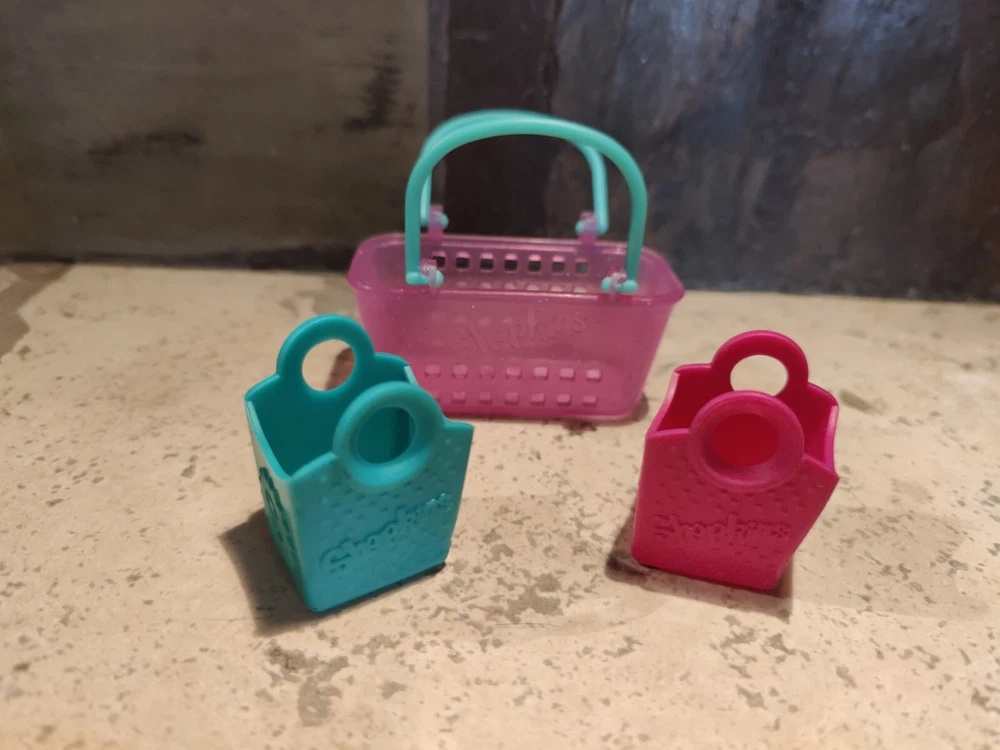 This Shopkins shopping baskets are the perfect addition to any collection. The large basket features a pink color with sparkly details and green handles. Also included is one small green and one small pink for a total of 3 baskets. (toy8)