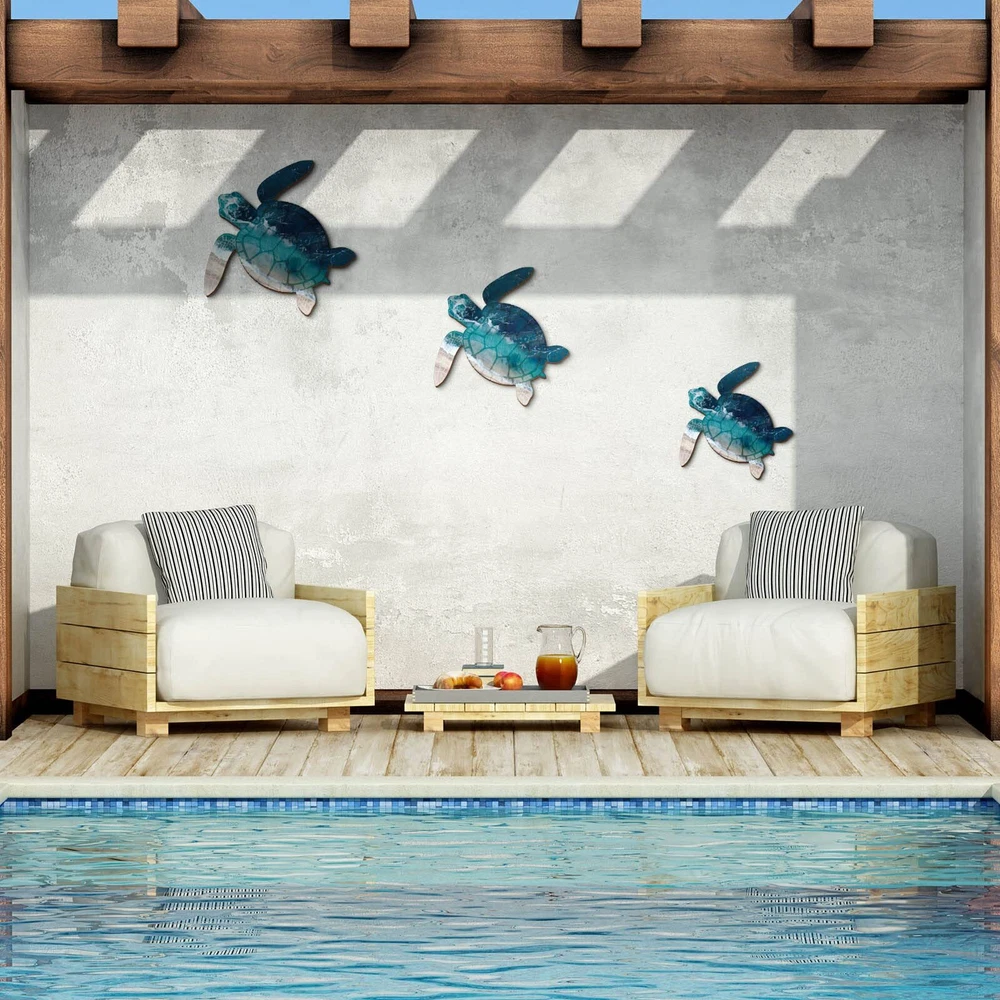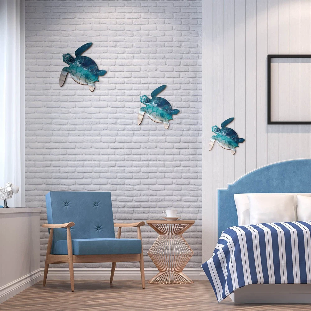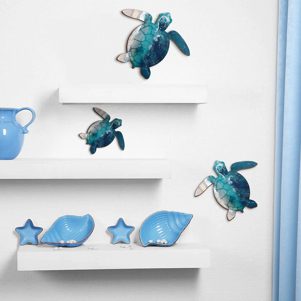 Features: Easy to install: There are 2 hooks on the back of each wooden sea turtle decor for easy hanging, that you can hang it at different angles on walls, doors, fireplaces, windows, etc., very easy and convenient. Funny gifts: Sea turtle bathroom decors are nice hanging gifts for others who love decorations, you can send them to your friends as housewarming gifts, birthday gifts and party favor supplies. Specifications: Material: wood (with metal hooks) Color: as pictures shown Size: about 11 inches/ 28 cm, 9 inches/ 23 cm, 8 inches/ 20 cm Package includes: 3 x Sea turtle outdoor wall arts Notes: Manual measurement, please allow slight errors on size. The color may exist a slight differences due to different screen displays. Pointed parts are included, please keep away from little . Use with Confidence: these sea turtle outdoor wall arts take quality wood as material with metal hooks, they are crafted by good workmanship with smooth surface and bright colors, having no burr, which are safe and lasting enough to accompany you for a long time Novelty Design: these wooden sea turtle wall decor are designed in the shape of turtles, the head, limbs and shell of the turtle are printed with ocean and sand patterns, just like turtles are wondering around your home, adding more tropical beach sense Wide Hanging Places: sea turtle wall arts can be hung in bathrooms, bedrooms, living rooms, offices or study rooms, etc., or in gardens, porches, patios and fences, which can create more fresh and lovely touch for your home wall decoration Enrich the Blank Space: our turtle hanging beach wall decors are available in 3 sizes, they are about 11 inches/ 28 cm, 9 inches/ 23 cm, 8 inches/ 20 cm, large enough to easily attract your guests' attention, and enrich your wall in a simple way Wall Decor Set: there are 3 pieces of turtle art decors in the package, which are available in different sizes, which can meet your various decoration needs, and it is a good idea to share them with friends
