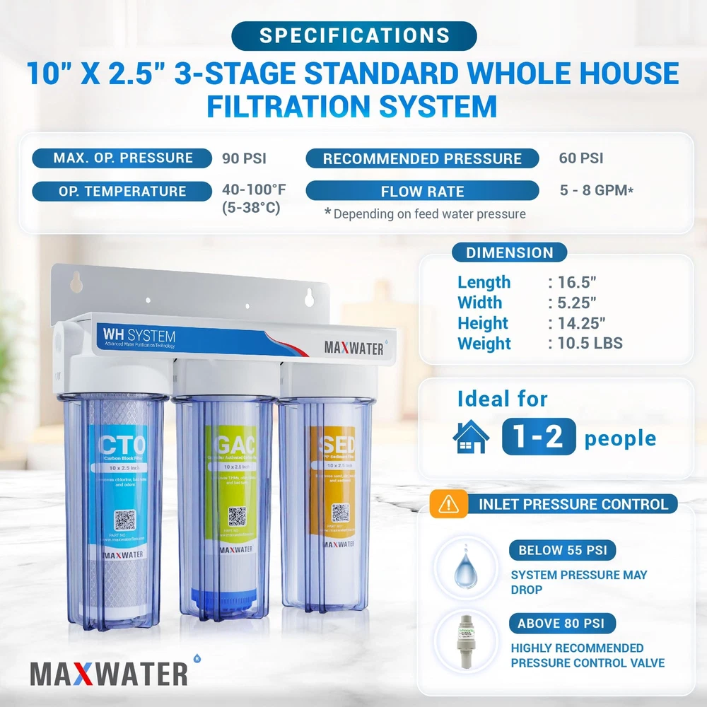 3-stage Whole House/Cottage Water Filter for city water Our 10” Standard Whole House is cost-effective for smaller spaces such as RVs, apartments, cottages and any other light duty applications where space is at a premium. This system will not disinfect water should only be used in areas where the water supply is biologically safe, or in conjunction with a UV sterilizer or other disinfection techniques. If you have a larger home/cottage or have more than 2 people using the water consistently, you may want to consider looking at some of our higher capacity systems. Pre-loaded Filter Cartridges: 1st Stage: 5-micron Polypropylene Sediment Filter 2nd Stage: Granular Activated Carbon (GAC) Filter 3rd Stage: Carbon Block (CTO) Filter Reduces: Sediment (silt, dirt, rust, ETC.) Pesticides Bad Taste & Odors Giardia Cysts Chlorine Turbidity Herbicides VOCs (Volatile Organic Compounds) THMs (Trihalomethanes) MTBEs (Methyl Tert-Butyl Ethers) Includes: 1x 3-Stage White Steel Mounting Bracket 3x 10" Clear Filter Housing, ¾ NPT Inlet/Outlet 1x 10" Standard 5-micron Polypropylene Sediment Filter 1x 10" Standard Granular Activated Carbon (GAC) Filter 1x 10" Carbon Block (CTO) Filter 1x Opening Spanner/Wrench Specifications Filter Life: Approx. 6 to 12 months Maximum Operating Pressure: 125 psi Maximum Operating Temperature: 125°F Recommended Operating Temperature Range: 40-100°F Dimensions: 15" Height x 15" Width x 6" Depth Total Weight: Approx. 17 Lbs with Filters Flow Rate: 1-10 GPM* for ¾" Inlet/Outlet *Pressure drop will be determined based on feed water pressure, filter cartridge, fluid viscosity, filter life, and conditions. Classic Drinking Filter: The water flows through PP sediment filtration (5 Micron), dual carbon filtration (GAC + CTO (5 Micron)). It filters out common sediments in drinking water, like dust, sand, particles, dirt, and rust. Effectively addresses impurities, cloudiness, colors, and more. It also improves the taste and neutralizes odor. Fresh Healthy Water Supplier : The on-demand fast flow rate of the WH 3 stage system allows it to meet the widest possible range of needs in your home. Up to 20x more effective than the common water pitcher dispenser. Flow Rate: Up to 1 - 8 GPM* depending on source water pressure. Maximum Pressure: 90psi. It washes fresh produce like fruit and vegetables, can provide your entire family with delicious, clean water straight from your tap. Excellent Quality and Design : Features beautiful designed clear see-through 3 stage housing. Clear see-through housings makes filter inspection a snap. Manufactured to comply strictly with quality standards for water quality, material safety and structural integrity. Easy to Install and Maintain: This system is designed for easy installation, low maintenance, and features dual carbon filters along with a high-capacity sediment filter. The sediment filter protects and extends the life of your system, while the carbon filters work to improve water quality and odor. You can replace the filter every 6 to 12 months, judged by the water’s taste. Use only original MaxWater replacement parts and filters for best results. TDS Note and Customer Services: This under sink water filter will not alter the TDS of the incoming water. Instead, it keeps the healthy minerals in your water. If you are interested in a filter that addresses TDS, please consider a reverse osmosis system. Backed by a 1-year Manufacturer warranty. For any issue or concern, please don't hesitate to contact us.