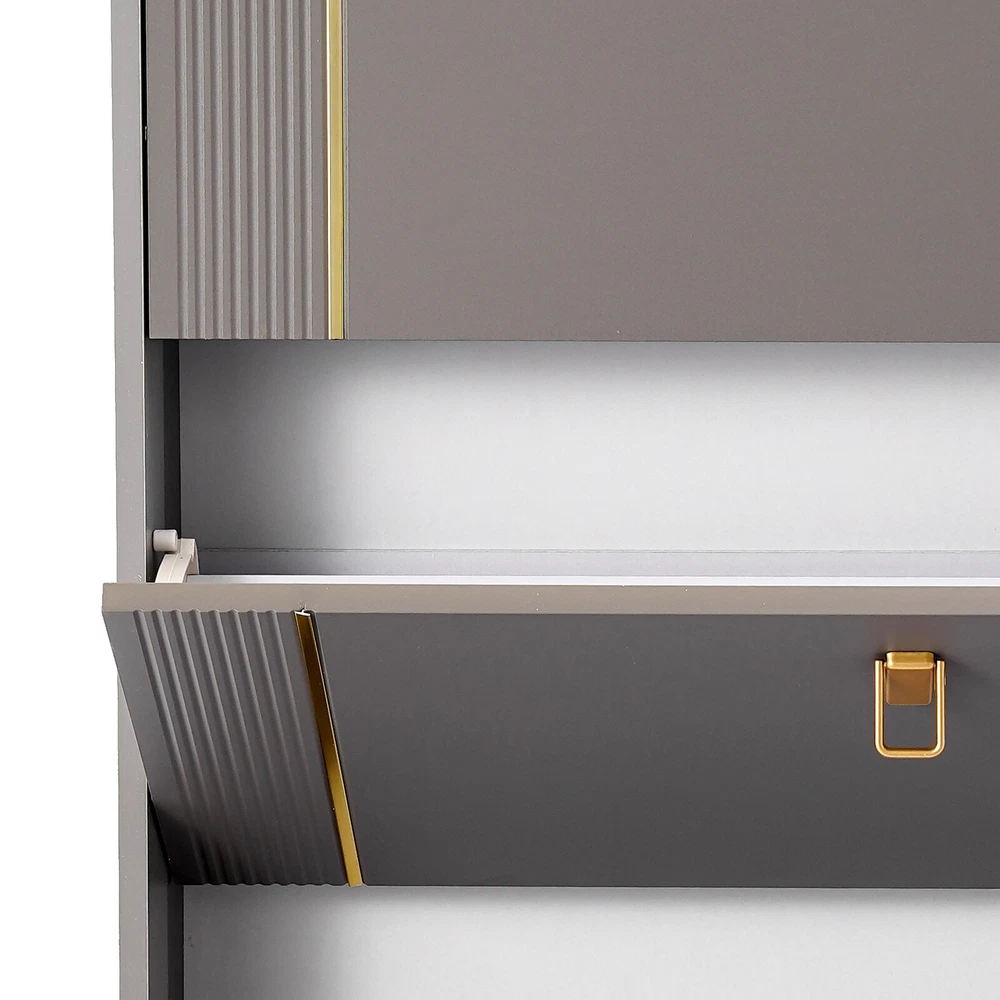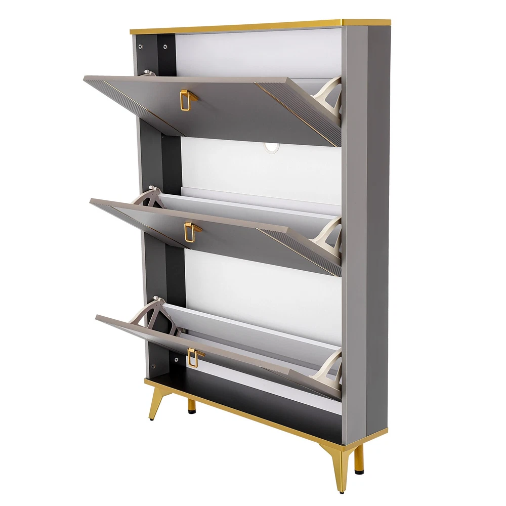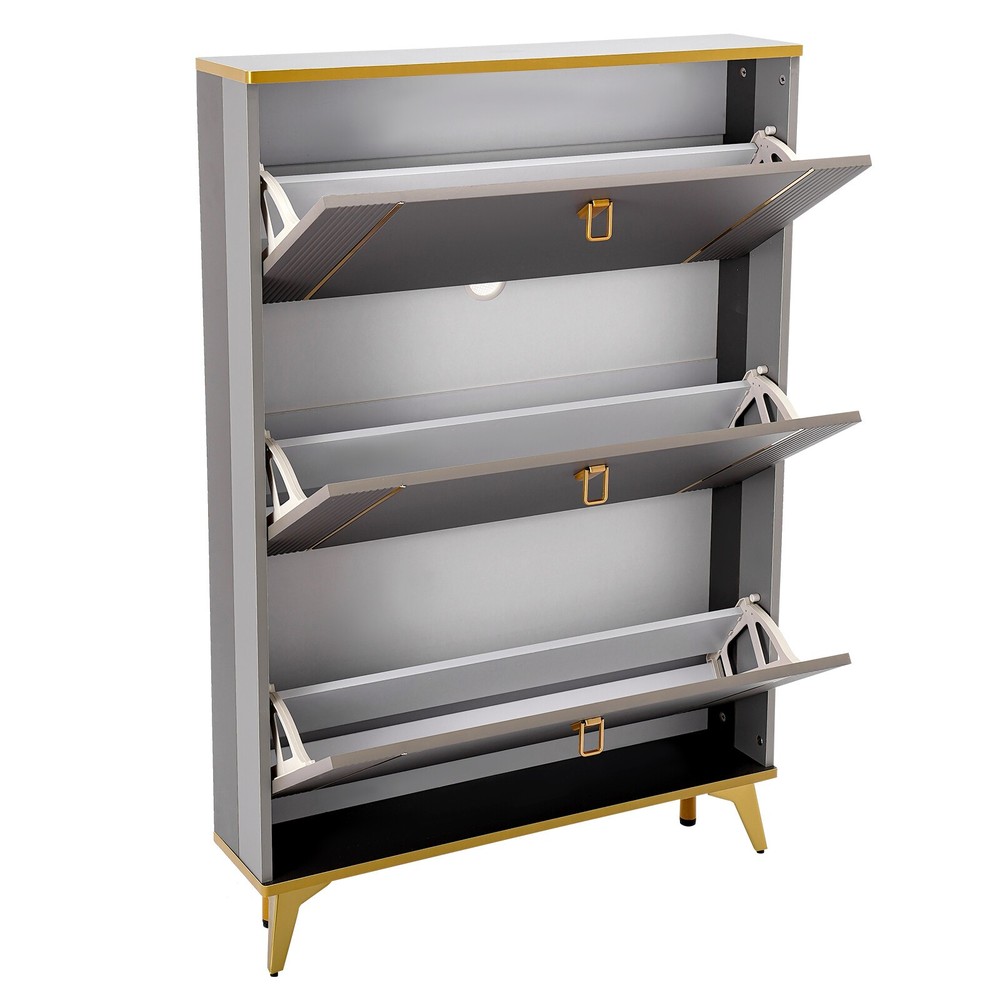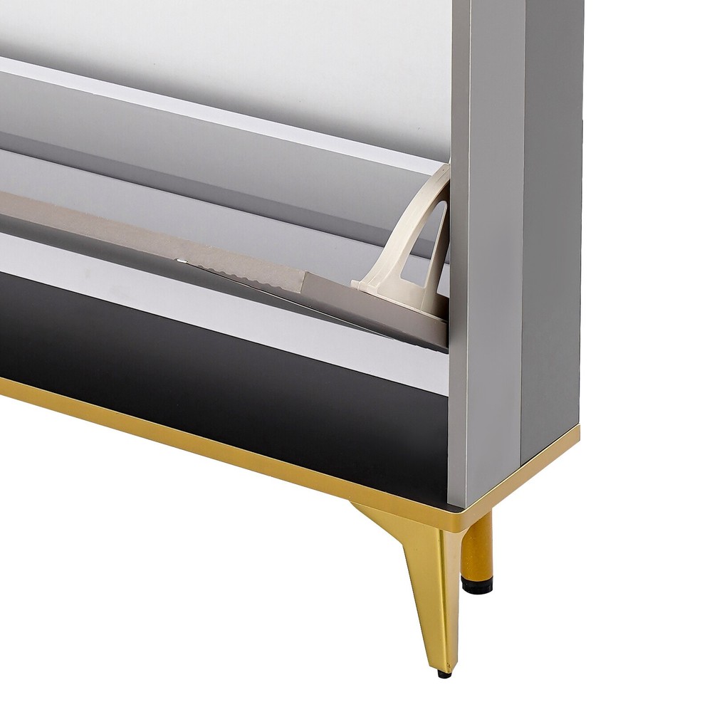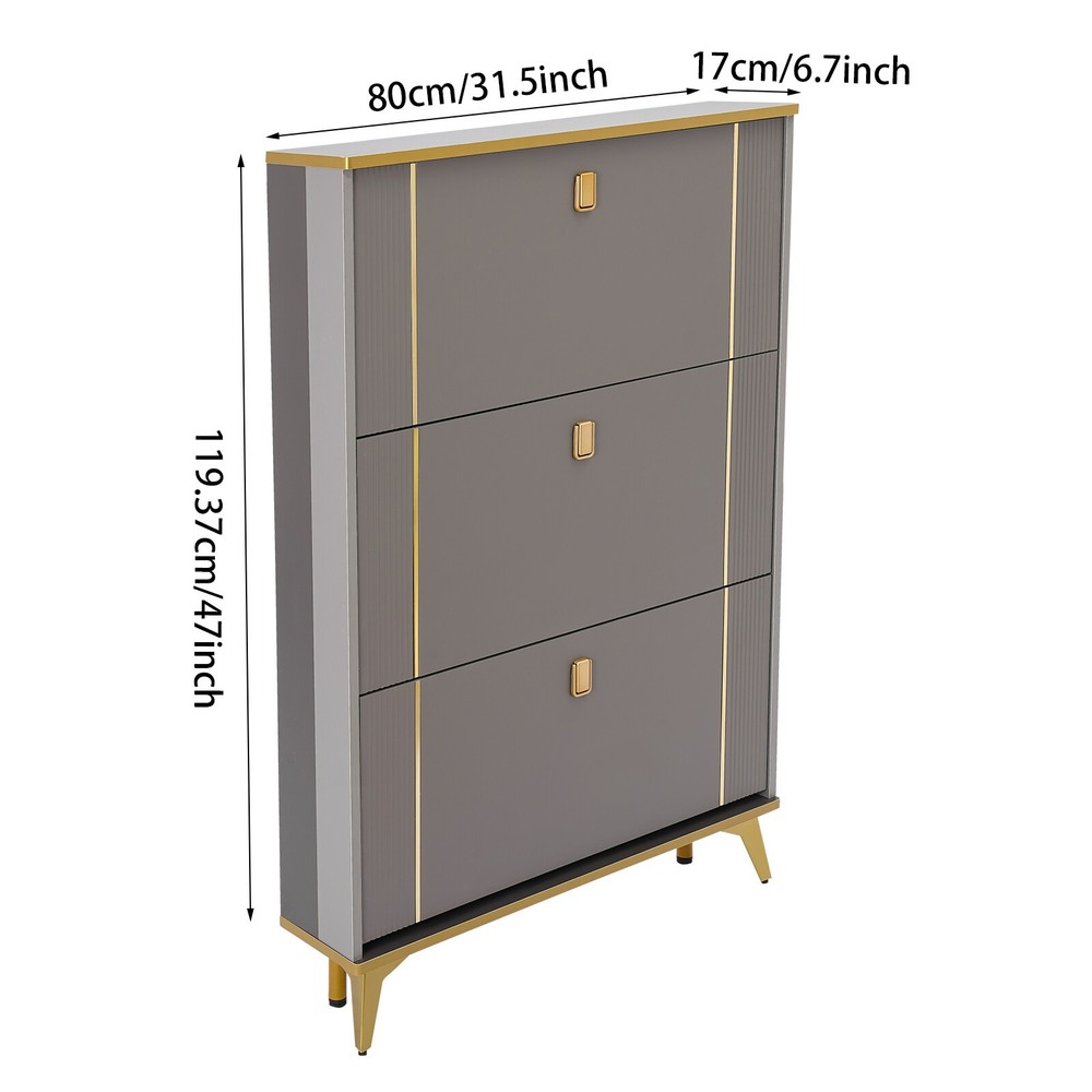 3 Tiers Floor Mount Flip Shoe Cabinet Entryway Shoe Storage Shoe Organizer Rack Description Are you still worried about the messy shoe arrangement? The 3-tier large-capacity shoe cabinet can effectively solve your shoe storage troubles. It is made of selected materials and exquisite craftsmanship to ensure durability. The smooth shaft and handles make opening and closing cabinet doors smoother, improving shoe-changing efficiency. The 6.7-inch slim cabinet saves you space. Bring it home quickly and have a comfortable and tidy home! Key Features Build to Last: It is mainly made of premium MDF, zinc alloy, high carbon steel, and aluminum, which is scratch-resistant, rust-resistant, wear-resistant , sturdy, and stable, and ensures a longer service life. High Stability: The sturdy material and three reinforced fixing plates on the back make its structure more stable, and each tier can hold up to 16.53 lbs, so you can store all kinds of shoes with confidence. Large Capacity: The three-tier design provides you with enough space to store your favorite shoes, with each tier holding three pairs of men's shoes and four pairs of women's shoes. The open bottom can also provide extra space for your daily slippers. In addition, the spacious platform at the top can be used to store your belongings, making it easier to keep them handy when you're in and out. User-friendly: The premium pivot brackets and handles allow you to easily and smoothly open the cabinet door, making it easier to access and place shoes and providing you with a better user experience. The flip opening design with a suitable angle can prevent hitting the knee when opening, ensuring safe use. Space Optimization: The 6.7-inch slim cabinet can be placed in a narrow space and can maximize the use of vertical space, saving floor space, and making it particularly suitable for entrance halls. The special cabinet leg design allows the shoe cabinet to closely adhere to the wall, further saving space. Neat Storage: With this shoe cabinet, the shoes will be neatly stored, making your home cleaner and tidier. You can place it at the doorway to put away messy shoes, which makes it pleasing to the eyes as soon as you open the door, bringing you a neat lifestyle. Beautiful Appearance: The versatile grey and gold metal edges and cabinet legs add a modern and fashionable touch, suitable for various interior decoration styles and enhancing home aesthetics. Easy Clean-up : Thanks to its simple structure and smooth surface, when dust accumulates on the surface, you only need to wipe it clean with a towel (not included). Simple Installation : The complete accessories and simple structure make it easy to install, saving time and effort. Customer Service: We aim to provide quality products and services. If you have any problems, please feel free to contact us. We will reply and solve the problem for you as soon as possible. Details Rounded Edges: It not only protects you from accidental scratches during use but also enhances the aesthetics of the product. Foot Pad: It can avoid scratching the floor when moving and enhance stability during use. Breathable Hole: It can maintain air circulation inside the cabinet and prevent moisture. Application It is suitable for living rooms, bedrooms, cloakrooms, porches, kitchens, staircase entrances, garages, attics, and offices to store various kinds of slippers, sneakers, board shoes, high heels, and so on. Specification Color: Grey Style: Modern Material: MDF, Zinc Alloy, High Carbon Steel, Aluminum Assembly Required: Yes Mount Type: Free Standing, Floor Mount Shape: Rectangle Number of Tiers: 3 Each Tier Capacity: 3 Pairs of Men's Shoes, 4 Pairs of Women's Shoes(For Reference Only) Each Tier Load Capacity: About 7.5kg/16.53 lbs Product Size: 80*17*119cm/31.5*6.7*47in Package Size: 113*43*18cm/44.49*16.93*7.09in Gross Weight: 24kg/53 lbs Net Weight: About 20kg/44.09 lbs Package Included 1* Shoe Cabinet All Accessories for Assembly Notes Please note that our package does not include shoes. Please allow the slight color difference caused by the shooting light and 1-3cm error due to manual measurement and make sure you do not mind before ordering. Payment Delivery details Terms of sales About us Contact us Payment We accept ebay payment 。 Fees such as import duties, taxes are not included in the item price or shipping costs. These charges are the buyer's responsibility. Delivery details Shipping: 2-9 working days to: USA Terms of sales We maintain high standards of excellence and strive for hundred percent customer satisfaction. Feedback is very important to us. We hope that you contact us immediately before you give neutral or negative feedback, so that we can address your concerns. It is impossible to address issues if we do not know about them! About us Your satis faction is our ultimate goal. We work hard to earn your trust and future business. Our certified technicians have tested each item before shipping. The unit comes with 1 year limited warranty on all manufacturing defects. a) If you receive a defective item, you may return it or ask for a discount. Please contact us within 14 days after you receive the package. b) What you returned must be intact and in its original packaging as re? u. Customer is responsible for shipping costs of the returned item. c) We will cover the cost of shipping back t with the shipping rate indicated in the registration page. We will send you a new unit or refund the full payment you paid. Thank you. Contact us Business Hour Business Hour: Monday To Friday: 8:30 AM to 5:00 PM (Beijing China time) Due to time zones, our reply to your questions may not be immediately. But within above working time, we will reply your email within 24 hours. If it's non-workdays, please kindly be patient and wait till Monday. Please contact us with ebay message. Please feel free to contact us if you have any questions. Monday To Friday: 8:30 AM to 5:00 PM (Beijing China time) Due to time zones, our re