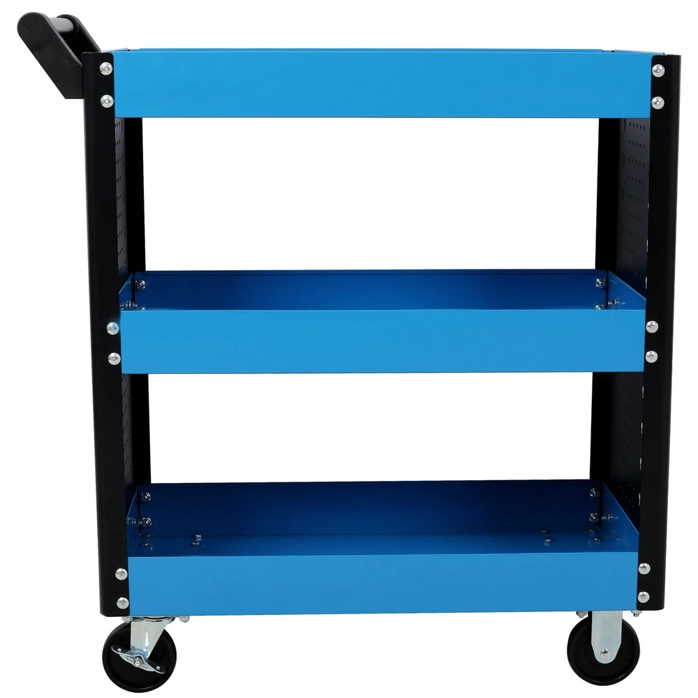 Features and Details: Designed for seamless maneuverability, this tool cart features four 4inch casters—two of which are lockable—paired with an ergonomic wide handle. The combination ensures smooth, effortless movement across various surfaces, allowing you to glide the cart to your desired location with minimal effort. This tool cart features three tiers of spacious storage shelves, engineered to accommodate large tools, equipment, or supplies while keeping your workspace tidy. The oversized shelves are ideal for bulky items like power tools, paint cans, or spare parts, ensuring easy access and efficient organization. Complementing the shelving system, the side-mounted tool pegboard provides customizable storage for hand tools, wrenches, or accessories—keeping essentials within arm’s reach and eliminating clutter. Engineered to adapt to any job site, this rolling tool cart excels in workshops, garages, warehouses, and industrial repair settings—making it an indispensable asset for professionals and enthusiasts alike. Specification: Color: Blue Material: Steel Product Dimensions: 32.6"L×15"W×35.8"H Item Weight (lbs.): 30