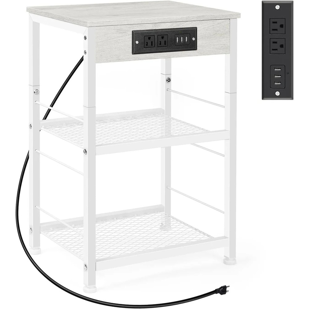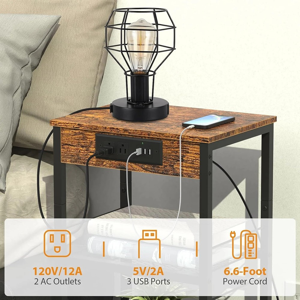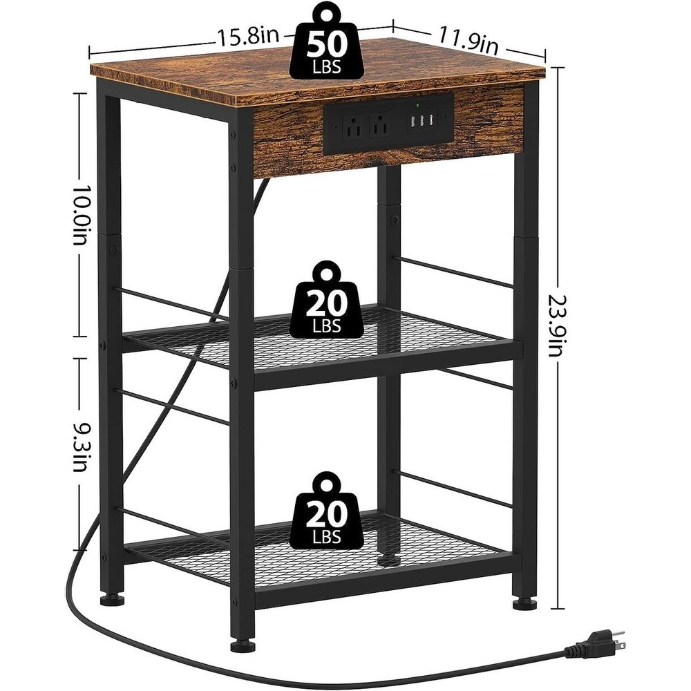 Nightstand with Charging StationEquipped with 2 AC outlets and 3 USB ports, our end table living room meets your various charging needs such as phone, iPad, desk lamp, making life more convenient. In addition, the 6.5 ft power cord is long enough for you to move the small end table between sofa, bedroom, study room. Sturdy & Durable ConstructionHeavy-duty steel frame construction makes the end table with charging station more stable and sturdy. The tabletop is composed of thickened MDF board, which have a weight-bearing capacity of up to 50 lbs allowing them to withstand most items. Equipped with adjustable non-slip feet to prevent the floor from scratches. 3 Tier Storage End TableThe bed side table/night stand features a convenient 3-tier open storage design, which provides extra Free Shipping Over $49.99* Details 3 Tier Nightstand with Charging Station Product Description: Nightstand with Charging Station Equipped with 2 AC outlets and 3 USB ports, our end table living room meets your various charging needs such as phone, iPad, desk lamp, making life more convenient. In addition, the 6.5 ft power cord is long enough for you to move the small end table between sofa, bedroom, study room. Sturdy & Durable Construction Heavy-duty steel frame construction makes the end table with charging station more stable and sturdy. The tabletop is composed of thickened MDF board, which have a weight-bearing capacity of up to 50 lbs allowing them to withstand most items. Equipped with adjustable non-slip feet to prevent the floor from scratches. 3 Tier Storage End Table The bed side table/night stand features a convenient 3-tier open storage design, which provides extra storage for displaying your decorations or collections. It can be used as a sofa side table, coffee table, bedside table, end table or small nightstand in bedrooms, living room. Ideal Home Decor The brown woodgrain finish and black metal frame bring a rustic industrial style, making bedroom nightstand a perfect complement to most decors. The compact size (11.8W x 15.7L x 23.6H) makes it excellent space adaptability, making it ideal for small spaces. Easy to Assemble The manual with numbered parts and clear instructions to help you finish the assembly, just follow it spend 10-15 minutes on a boring weekend with your kids. (TipCheck all parts before assembly)