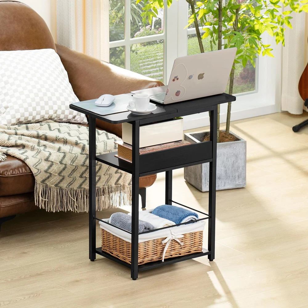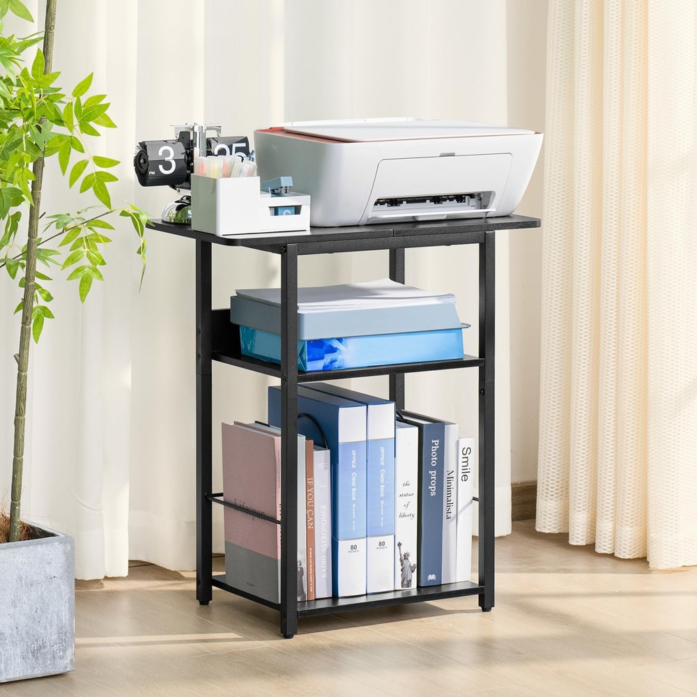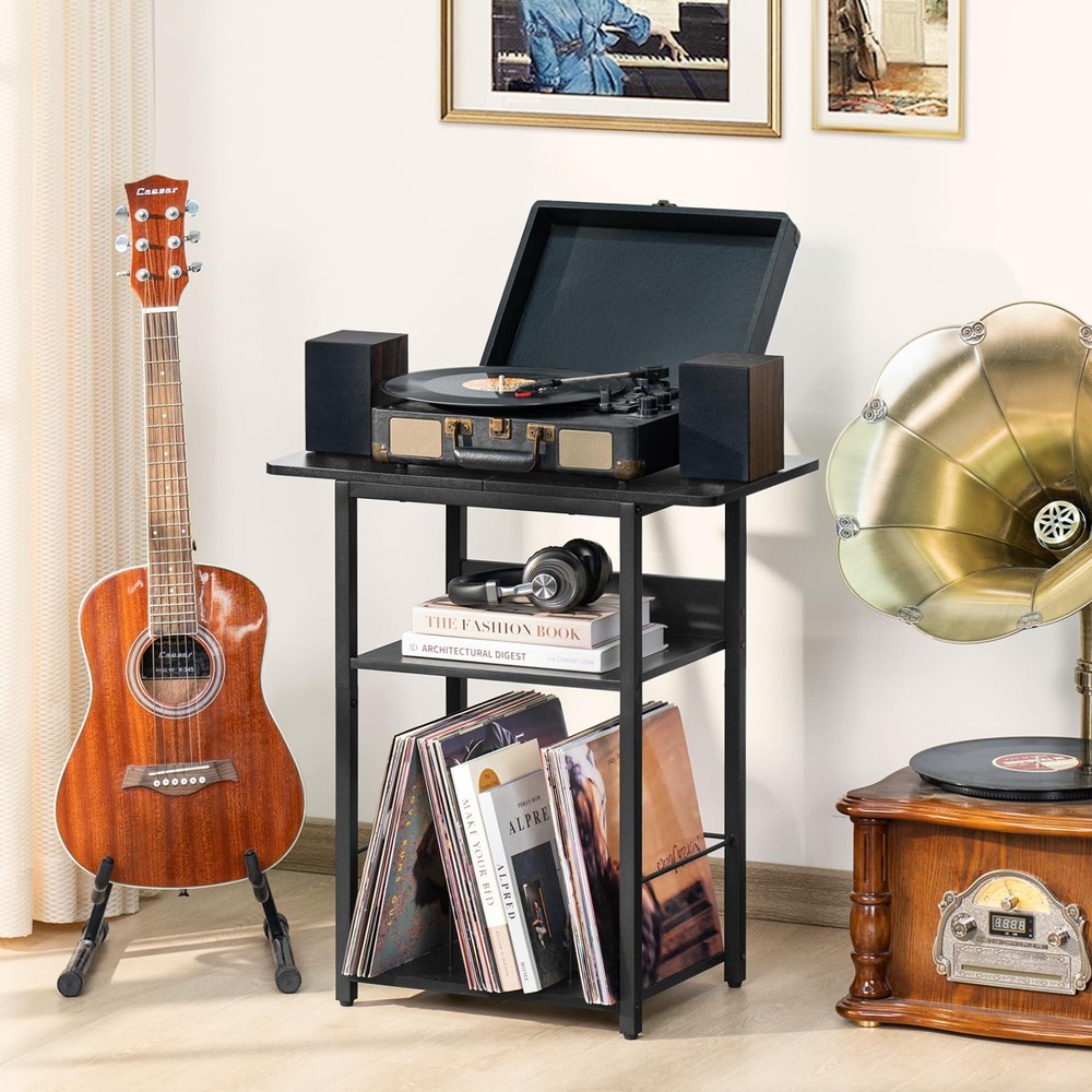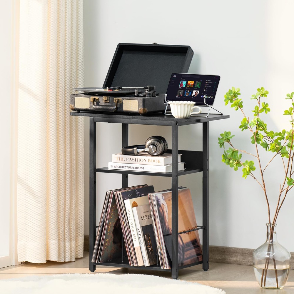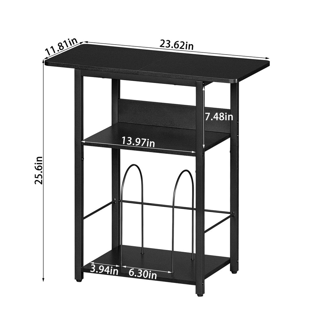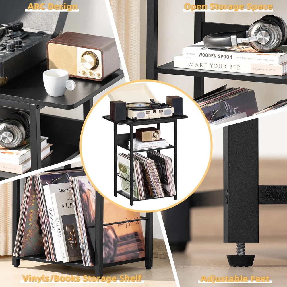 Side Table,Small End Table with Storage Shelf,3 Tier Industrial Bedside Tables,Vinyl Record Player Stand,Modern Sofa Night Stands for Living Room Bedroom Office Small Spaces This small end table is perfect for placing in every corner of the room, making full use of every part of your room. You can use it as a sofa side table or as a bedside table. This multi-functional end table is divided into three layers. You can display photo albums on the desktop or have a cup of coffee you like on it during your leisure time. Our desktop size is suitable for storing most record players, and you can also use it as a record player stand. The second layer open storage rack can be used to things that you often use in daily life, making everything within reach. The protective iron mesh can also protect them from falling. We have designed an additional detachable U-shaped shelf for the third layer, which you can use to sort and place your favorite magazines, books, and records, or you can dismantle it, so you can have another large storage space, and it's all up to you to decide! PACKAGE INCLUDE: 1 x End Table 1 x Accessory Kits and Tools 1 x Installation Instruction [Multiple Record Player Stand] Measuring 11.8 "D x 23.62 "W x 25.67 "H, this retro side table fits in every corner of the room! The extended desktop of this side table can accommodate multiple sizes of record players. If your record player is of standard size, there will also be extra space on the desktop for small speakers, allowing the recorded music to surround you and help you feel the charm of music more strongly. [Minimalist Printer Stand] The 3-tier printer table combines pure black wooden boards and matte metal frame. It has a minimalist design, which is understated and aesthetically pleasing. This small table will fit nicely with different sizes printers,fax machine and document scanner. [Ample Storage Space] This 3-tiered table can fulfill your various storage and display needs. You can keep your coffee on the side table top and your TV remote or tablet on the second storage shelf. The bottom can about 100 records, and the 2 removable U-shaped dividers also provide you with customizable storage space for different storage needs. [Thoughtful Details] The side table is made of high quality wood boards and rust and corrosion resistant metal frame, which is sturdy and stable. The extended table top's increase your storage options to a great extent, and the Arc design Designed for the safety of your family. These 4 adjustable plastic feet not only help the table balance on uneven floors, but also protect the room floor from scratches.