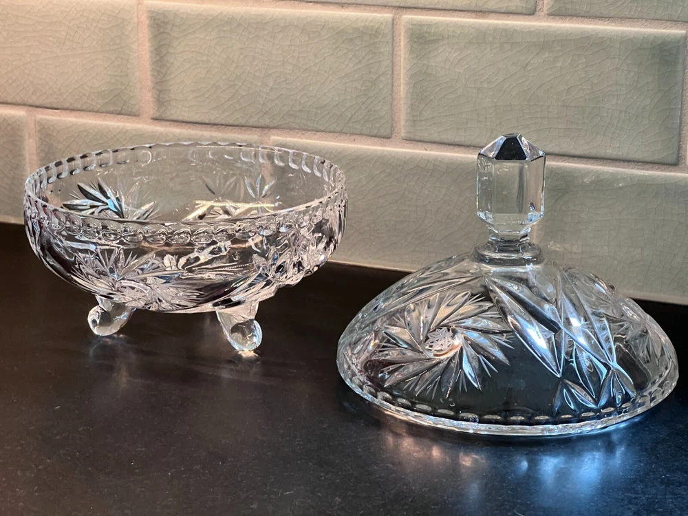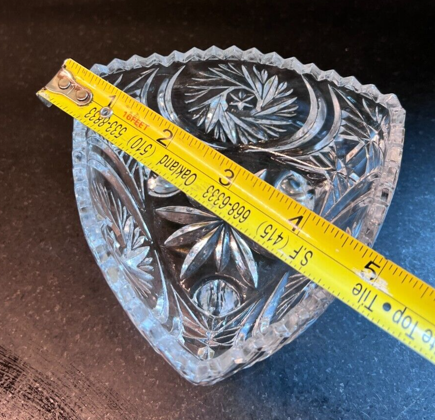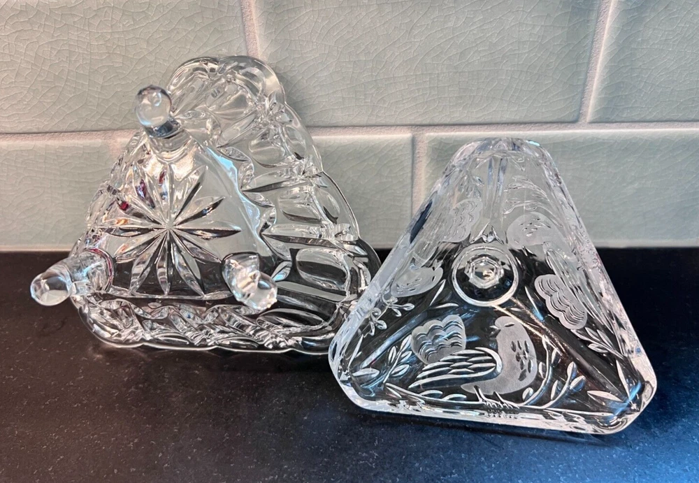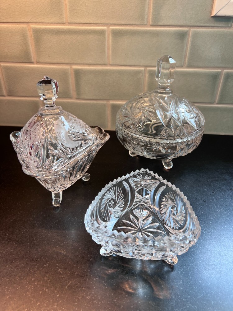 This charming set of three vintage candy, relish, and nut dishes showcases timeless elegance and intricate craftsmanship. Each piece is made of beautifully cut crystal, adding a touch of sophistication to any table or display. Round Lidded Candy Dish – A lovely 6" diameter heavy cut crystal dish featuring a classic starburst pattern. Weighs approximately 16 oz. Triangular Lidded Candy Dish – Measuring approximately 5", this sweet dish is adorned with a delicate etched bird pattern, adding character and charm. Weighs approximately 13 oz. Triangular Relish/Nut Dish – A versatile 5" dish with an eye-catching swirl and starburst pattern, perfect for serving small treats. Weighs approximately 12 oz. Each dish is a beautiful vintage find, perfect for collectors or those who appreciate timeless glassware. Please refer to photos for more detail. +++ 🔹 A Note on My Listings: I am not a historian or antique dealer, but I do my best to research and provide accurate information. Please review the details and conduct your own research if needed. I encourage you to ask any questions before purchasing—I’m happy to help! I strive to represent all items accurately, whether they come from my own home or another well-loved source. If you notice anything that seems incorrect or misrepresented, or if you have any concerns after receiving your item, please reach out directly —I’ll gladly assist in resolving any issues. ✨ Thanks for looking! Feel free to message me with any questions. ✨