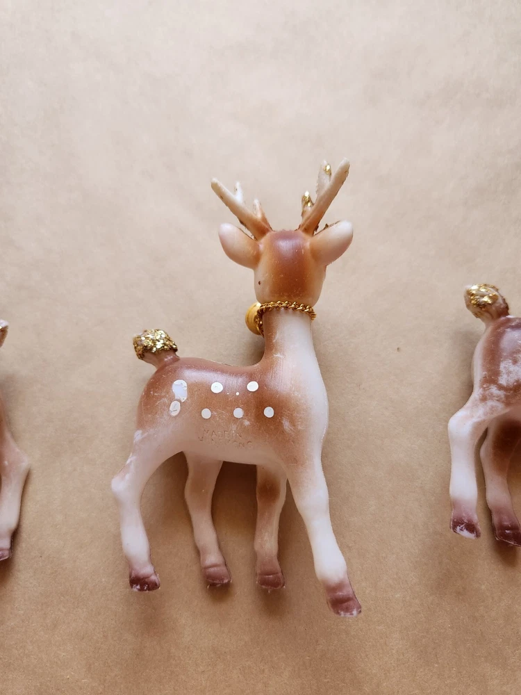 3 Vintage Soft Plastic Reindeer 5 inches tall Pre-Owned one of the reindeer missing a bell, some paint rubbed away here and there Please refer to photos for condition