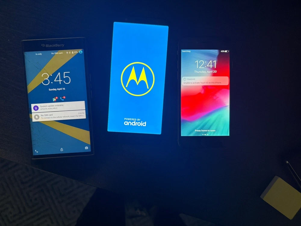 iPhone- works fine has but has cosmetic damage OEM box included Blackberry- front screen is cracked but is functioning as expected Motorola G6- Back is cracked and might be google FRP locked can be unlocked for a fee if requested. (Message me in app)