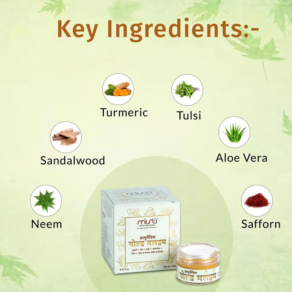 Natural Herbs Misti herbal is one of those top leading companies which solely believes in the quality & purity of products made with 100% natural ingredients. Quality Tested Exquisite and reliable, our quality-tested gold malam is a symbol of purity and craftsmanship. Benefits he Rose oil present in Misti’s Gold Malham gives exfoliating and deep moisturization properties. It also helps in hyperpigmentation. For External Use only One-stop solution for all kinds of skin problems including, itching, rash, allergies, and skin inflammation.