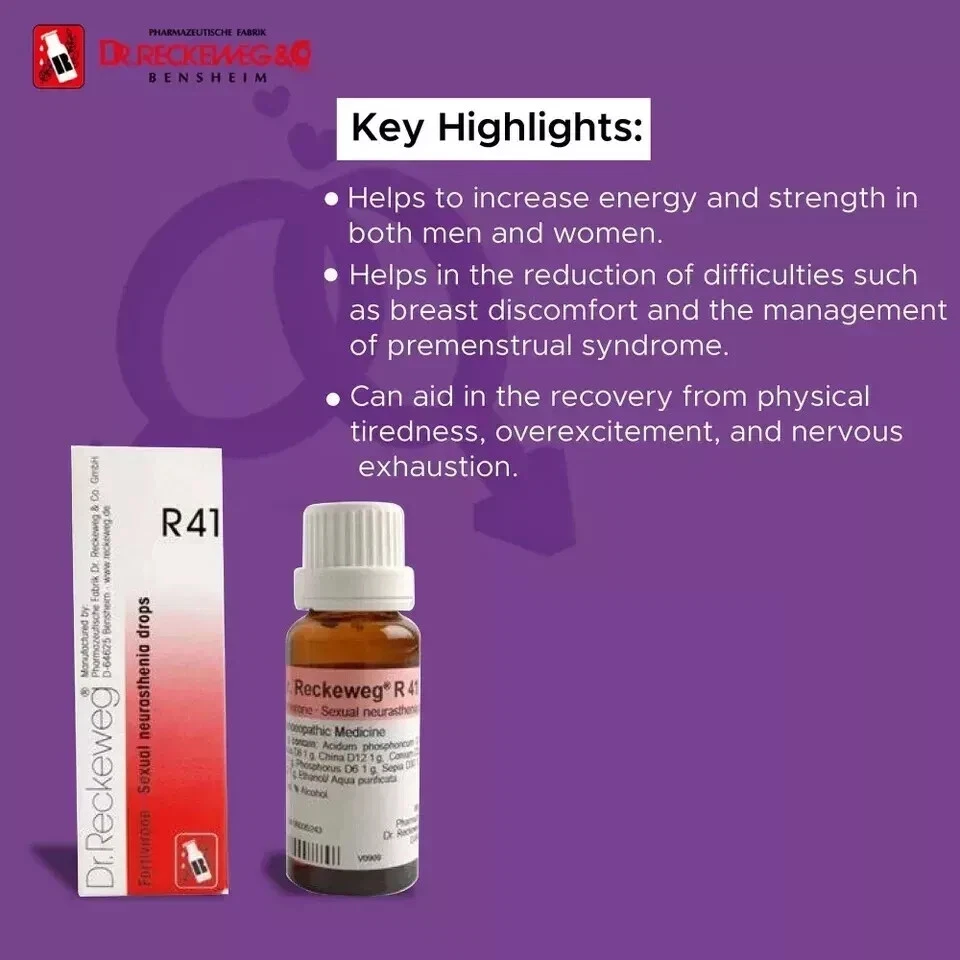 3 X Pack R14 Drops Dr Reckeweg Pack Germany OTC Homeopathic 22ml Drops FREE SHIP Dr. Reckeweg R41 Sexual Neurasthenia Drop is a homoeopathic drop that promotes vitality and vigour in men. It helps eliminate general debility, nervous exhaustion and low energy levels. Key Ingredients: Acidum phosphoricum, Agnus castus, China, Conium, Damiana, Phosphorus, Sepia, Testis, Aqua, Ethanol Indications: It is indicated for lack of vitality and general debility in men and can aid recovery after a debilitating illness, physical and nervous exhaustion or over-excitement.