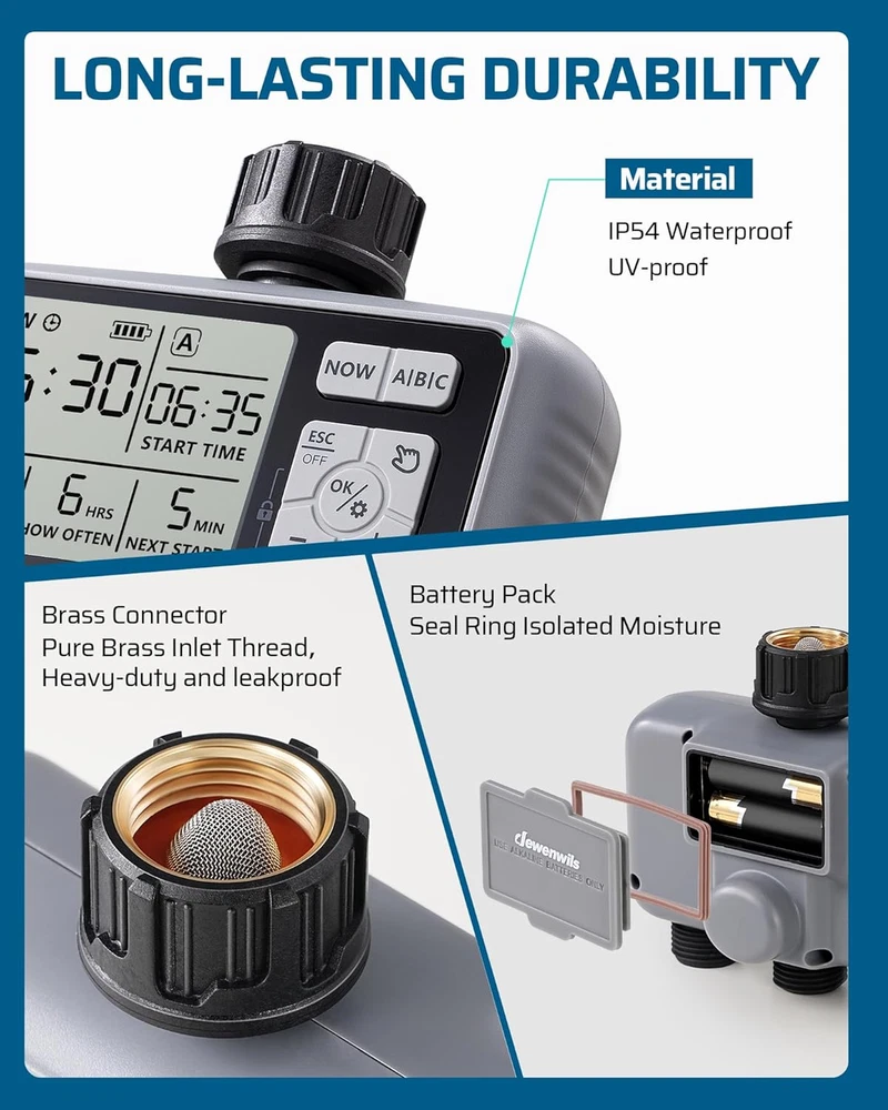 [3 Independent Zones] Our faucet timer offers individual control over 3 zones (A, B, C), enabling tailored adjustments for start times, watering durations (1 second to 360 minutes), and watering frequencies (every 1 hour to 15 days); ensures optimal watering schedules for gardens, yards and lawns [User-Friendly & Clear Display] With 2.8" screen, this water hose timer presents watering schedules, battery status, and additional information with clarity; 7 straightforward buttons, configuring your settings takes merely 3 minutes; effortlessly establish the date, start time, duration of watering, and watering frequency for your plants [Dependable & Watertight] Crafted from durable brass at the inlet and included adhesive tape (you can wrap around the faucet) ensure a snug connection with the sprinkler timer; this setup preserves water pressure unaffectedly, enduring pressures of up to 120 psi; sun-resistant ABS plastic shell and IP54 waterproof rating are ideal for outdoor applications [Multi-Mode & Child Lock] The manual mode is intended for short-term emergencies without altering the preset automatic programs; rain delay mode prevents excessive watering of plants/flowers during rainy spells, conserving water; the child lock feature guarantees that children and pets cannot disrupt the water timer's operation [Battery Recommendation & Warranty] Operated by 2 1.5V AA batteries (batteries not included), the valve will automatically close when the battery charge is low; 1-Year Warranty provided, DEWENWILS professional customer service team offers 24/7 delicate support, we are always standing by you Product Description 1 Automatic Watering 2 Manual Watering 3 Rain Delay 4 Children Lock More Choices about Dewenwils Water Timer Add to Cart Customer Reviews 3.8 out of 5 stars 39 4.0 out of 5 stars 11 4.2 out of 5 stars 17 4.1 out of 5 stars 384 3.9 out of 5 stars 211 4.0 out of 5 stars 549 4.1 out of 5 stars 1,737 Price $39.59 $ 39 . 59 — — $58.73 $ 58 . 73 $49.99 $ 49 . 99 $34.19 $ 34 . 19 — Number of Zone 3 2 2 4 3 2 1 Number of Programs per Zone 1 1 6 1 4 1 4 Watering Duration 1-59sec,1-360min 1-59sec,1-360min 1sec-59min59sec 1-360min 1-360min 1-360min 1-360min Watering Frequency 1-7days, 2nd days , 3rd days 1-7days, 2nd days , 3rd days 1-23 hours,1-15 days 1h-12h; 1 day-7 days 1-7days, 2nd days , 3rd days 1h-12h; 1 day-7 days 1-7days, 2nd days , 3rd days Remote Control ✘ ✘ ✔ ✘ ✘ ✘ ✘