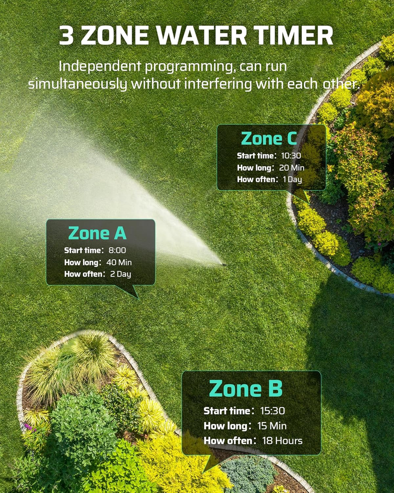 This sprinkler timer is a game-changer for anyone who wants smart, hassle-free watering! The three independent zones let me customize schedules perfectly for my lawn, flower beds, and veggie garden. The large, bright display makes it super easy to adjust timing and check settings at a glance. Setup took minutes—just press a few buttons and it’s ready to go. Rain delay? No problem! I love how it saves water while keeping my plants happy. The battery life is impressive, and the sturdy design handles outdoor conditions without issues. Highly recommend for effortless yard care!