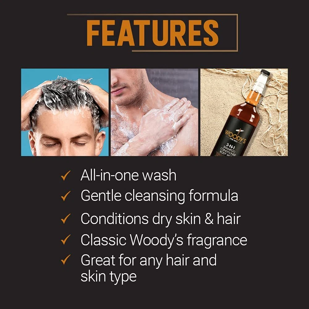 Get ready in a flash with a routine that won’t take too much time. Woody’s 3-in-1 wash is infused with all the nourishing ingredients to keep up with your hair and body needs. Strengthens the scalp and boosts fiber growth to prevent hair loss. Keeps skin hydrated to avoid irritation and sun damage. This also has a subtle manly scent that’s not overpowering and just the perfect gentleman vibe. Your go-to after hitting the gym, pool, or when outdoors. For the man who opts for head-to-toe freshness with a simple routine. Streamline Your Routine: 3-in-1 body wash, shampoo, and conditioner is designed for efficiency. This all-in-formula cleanses, nourishes, and conditions, making it the perfect solution for the modern man’s grooming routine. Hydrate and Revitalize: This hair care formula, enriched with naturally derived extracts, cucumber fruit extract, and aloe vera, deeply nourishes and revitalizes hair and skin, restoring moisture and leaving your hair soft, healthy, and refreshed. Refreshing Cleanse: This 3-in-1 body wash for men deeply cleanses face, body, and hair, removing dirt and grime. Leaves skin feeling refreshed with a brisk, invigorating scent. Perfect for daily use to keep you clean, energized, and ready for the day. Gentle Yet Effective: This versatile body wash is perfect for daily use. Suitable for all hair and skin types, it cleanses, nourishes, and refreshes without irritation. Leaves you feeling clean, refreshed, and rejuvenated all day long. Large Size: Economically portioned for long-lasting use, providing premium quality for extended hair styling and grooming. Perfect for men’s hair care routines, ensuring consistent, high-quality results with every application.