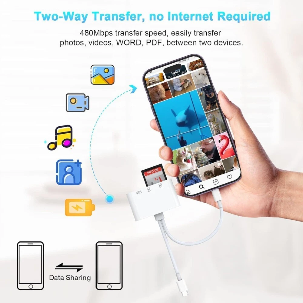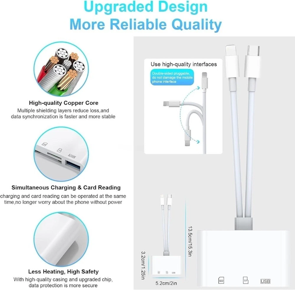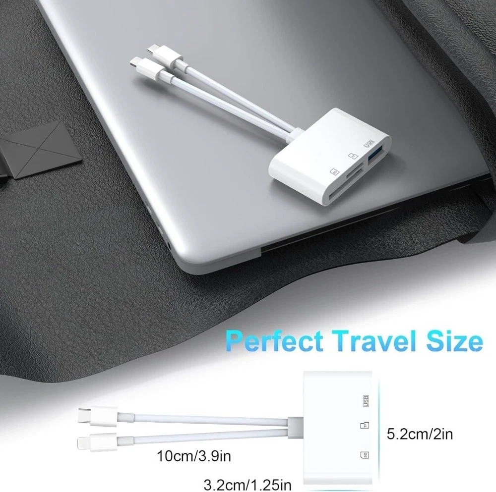 Product Description: SD Card Reader for iPhone iPad, 5-in-1 USB C to USB Adapter SD Card Viewer with SD/TF Card USB 3.0 Adapter, Memory Card Reader for iPhone iPad MacBook Samsung Android SD Card Adapter Plug & Play Feature: 1. Multi-Card Compatibility: This SD Card Reader features four slots that are compatible with SD, TF, Type-C, and USB cards, ensuring a broad compatibility range for numerous devices and card types. 2. High-Speed Bi-Directional Transfer: Enables swift and efficient data transfers in both directions. Whether you're uploading precious photos to your device or backing up important files to your memory card, count on our reader for seamless data transactions. 3. Easy Plug and Play: No software or app installation necessary. Just connect the adapter to your device and you're ready to transfer data instantly. This makes our SD Card Reader a must-have tool for professionals on-the-go. 4. Simultaneous Reading and Writing: Unlike traditional card readers, our advanced device allows for simultaneous reading and writing. No more waiting for files to transfer before you can start loading new data. Multi-tasking has never been this efficient. 5. Universal Compatibility: Compatible with iPhone, iPad, Android devices and more. Our card reader ensures your data can be accessed across multiple platforms, ensuring maximum convenience. Product Includes: 1x SD Card Reader
