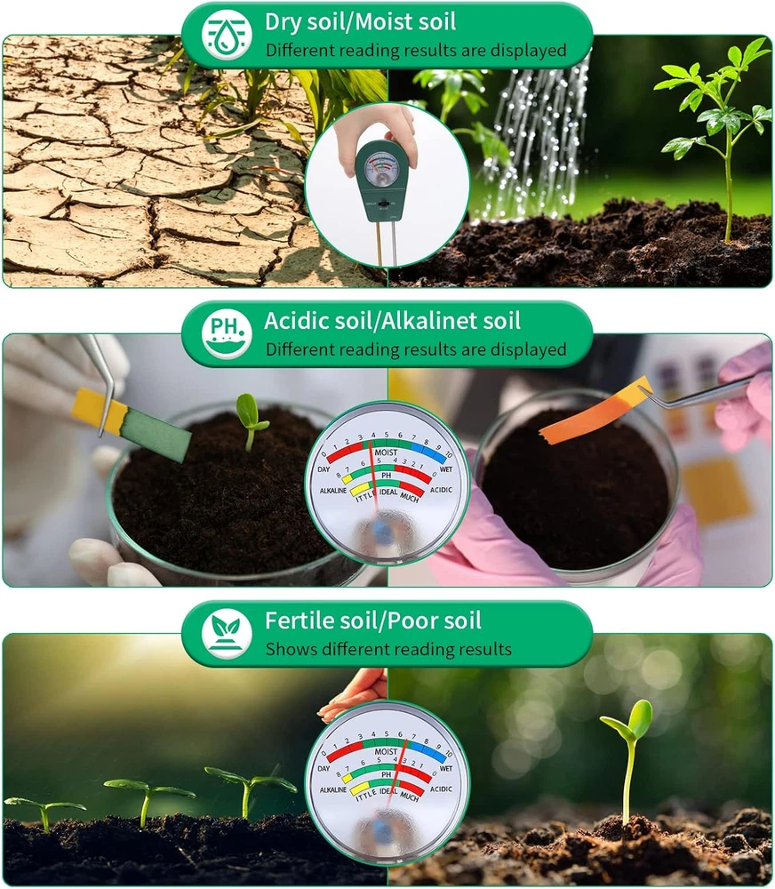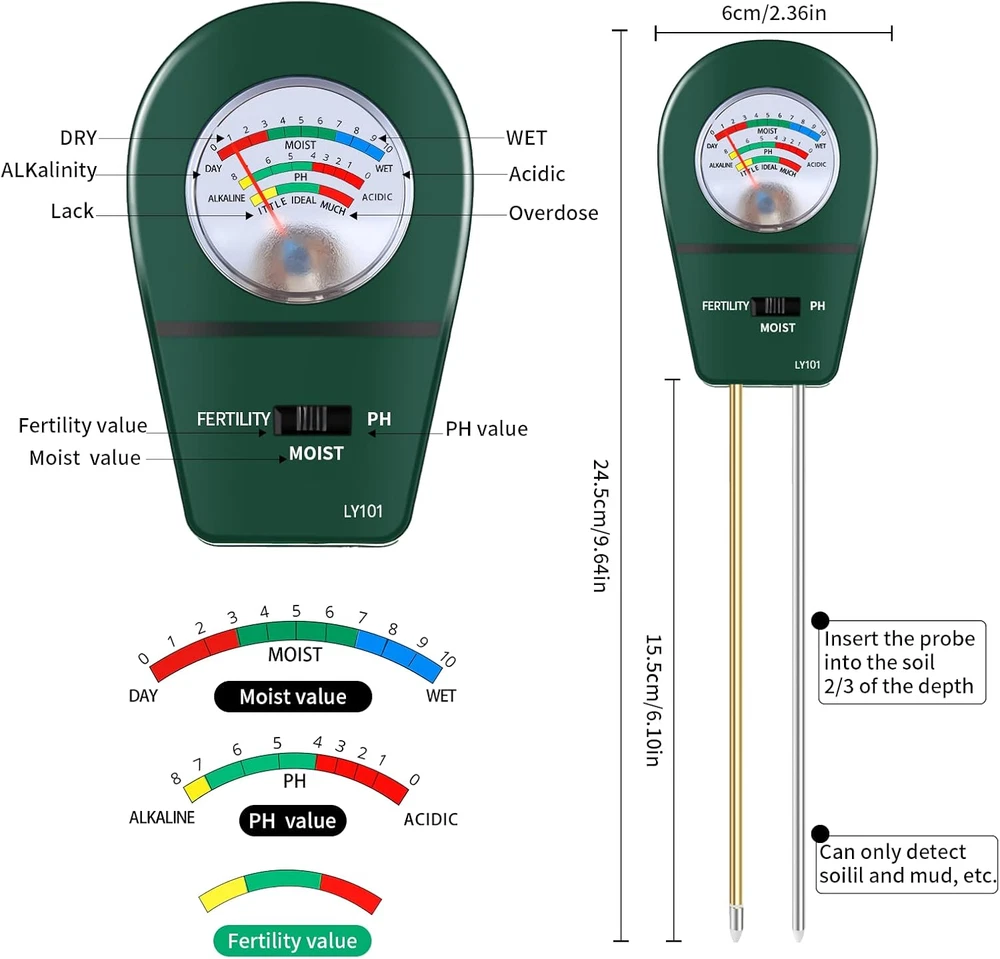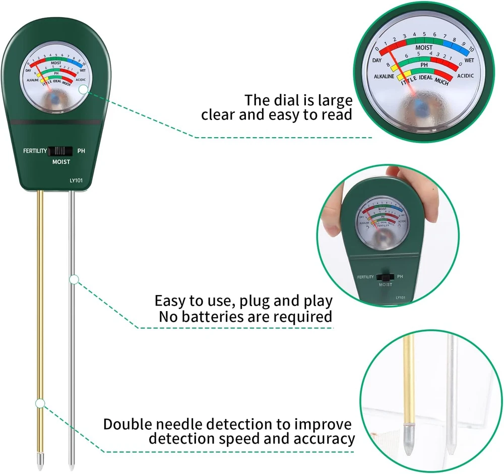 Store New Arrivals Add to Favorite View Feedback Contact 3 in 1 Soil Tester, Soil Fertility Test, Measure Ph of Garden, Lawn Care, Potted, Horticultural Soil Moisture Meter Sensor, No Battery (Green) Description Item Weight 3.52 ounces Item model number LY101 Product Dimensions 2.36 x 1.54 x 9.64 inches Country of Origin China Easy to operate: Just insert the probe into the soil about 2/3 deep for a few minutes, you can get the test result immediately from the indicating pointer, no battery needed, convenient and fast. Wide range of applications: home garden farming, rice planting, vegetable planting, potted plants, flower planting, greenhouse planting, soil testing, etc., to meet all your soil testing needs. Steps for usage: Step 1: Clean the soil moisture probe. Step 2: Insert the tester probe approximately 2/3 deep into the soil. Step 3: You can get a quick moisture reading in a short amount of time. Step 4: Remove probe from soil and wipe clean after each use. Tips: 1. The soil tester is specially designed for soil, please do not use it to test water or other liquids. 2. Rock or other soil that is too hard may damage the probe. 3. Our detector is not suitable for sandy and other loose soil. 4. After use, please take out the moisture meter and wipe the probe, do not leave it in the soil for a long time. 5. Soil pH for most plants is close to neutral, so the range of test pH needles will be small The 3-in-1 soil test kit provides you with a comprehensive understanding of the soil condition of your garden and lawn. With a quick check with a soil pH meter, you can tell if your plant's moisture and pH needs to be adjusted and if the plant is getting enough sunlight. ABOUT US We offer the best prices around on high quality products. Our E-store includes media such as books, movies, music and games while offering electronics, toys, sporting apparel, clothing, tools, general home, garden items and more. SHIPPING We are always working hard to ensure your package arrives as soon as possible. Please understand that some factors like weather, high postal traffic, and the performance of shipping companies are outside of our control. We offer free shipping to the lower 48 states and ship within 2 business days of payment, usually sooner. We do not accept P.O. Boxes. Please provide a physical address. For shipping outside of the continental USA, we only use eBay's Global Shipping Program.The item is shipped to KY and then sent to the rest of the world. International customers are responsible for all duties and taxes. Continue to check out in order to calculate costs for shipping the item to your country. Messages regarding eBay's Global Shipping Program MUST be directed at eBay EXCLUSIVELY. RETURNS We offer a 30-Day Return Policy on items which you are not completely satisfied with. You have the option for a full-refund or an exchange of the item. No returns are available on items shipped outside of the USA. PAYMENT We accept PayPal. CONTACT US This page content is yet to come Please ad us to your favorite seller and visit again later Thank You CUSTOMER SATISFACTION We try our very best to make sure every customer is completely satisfied. If there's a problem, message us! We're happy to help. WE ACCEPT Copyright © 2021 AutoDS. | All Rights Reserved