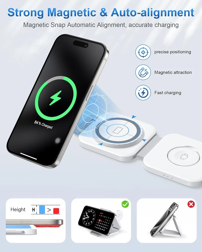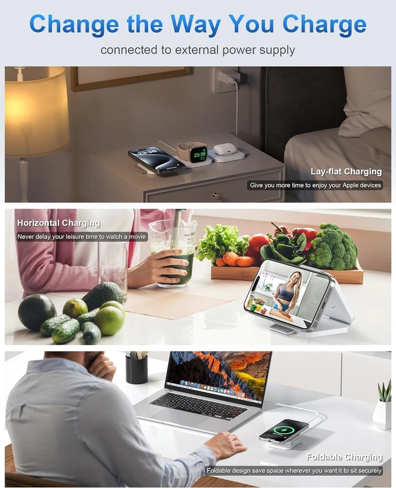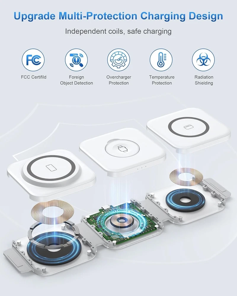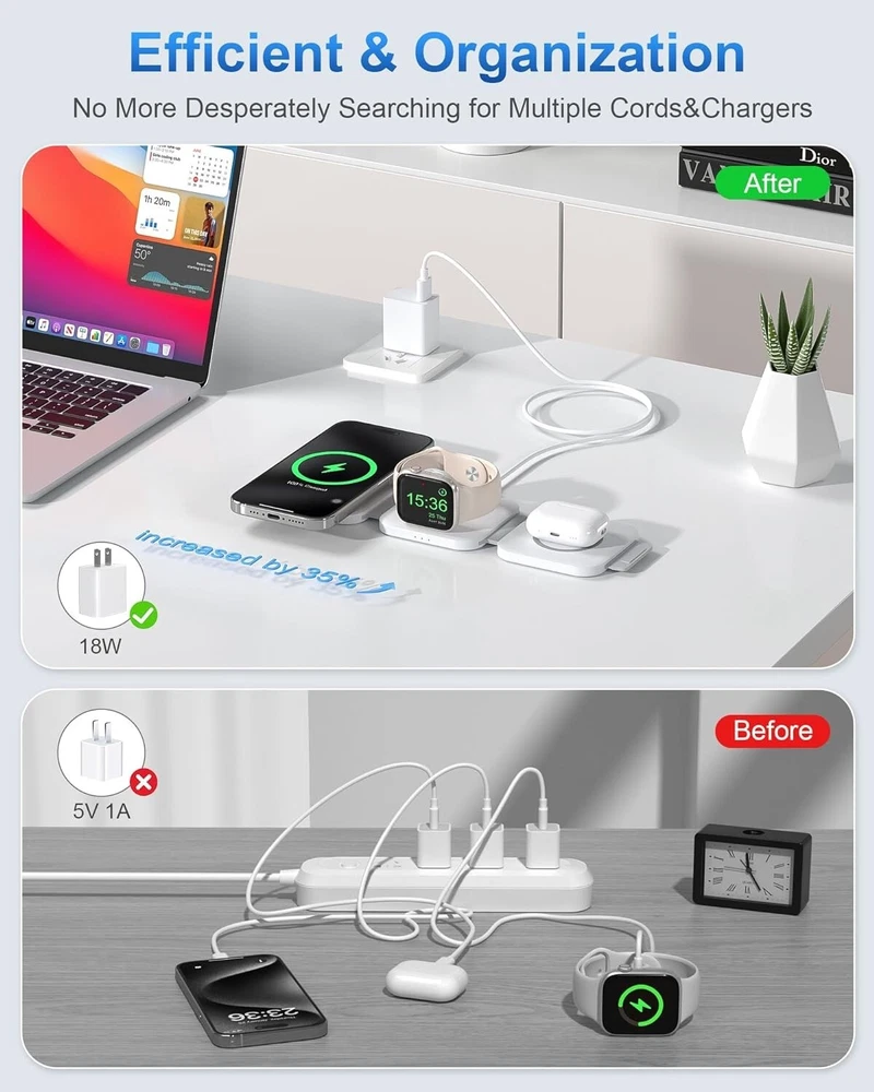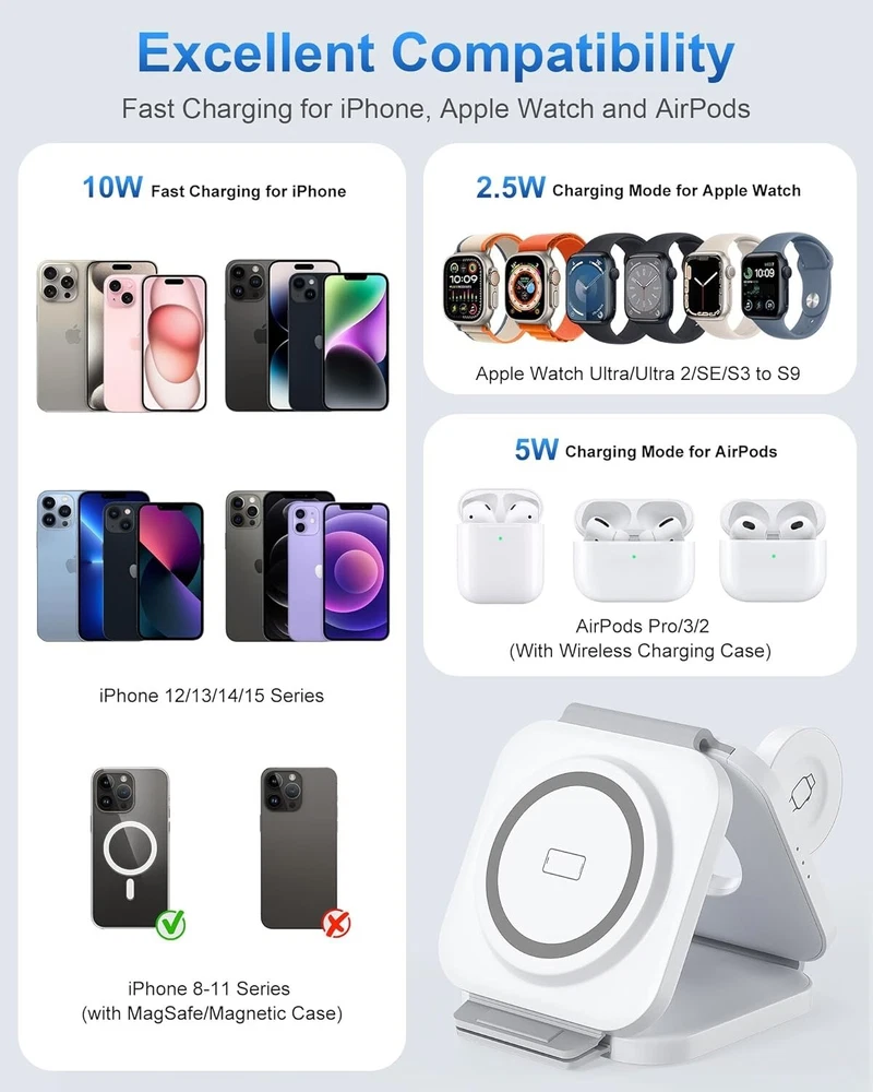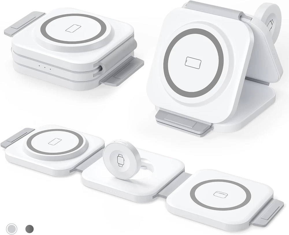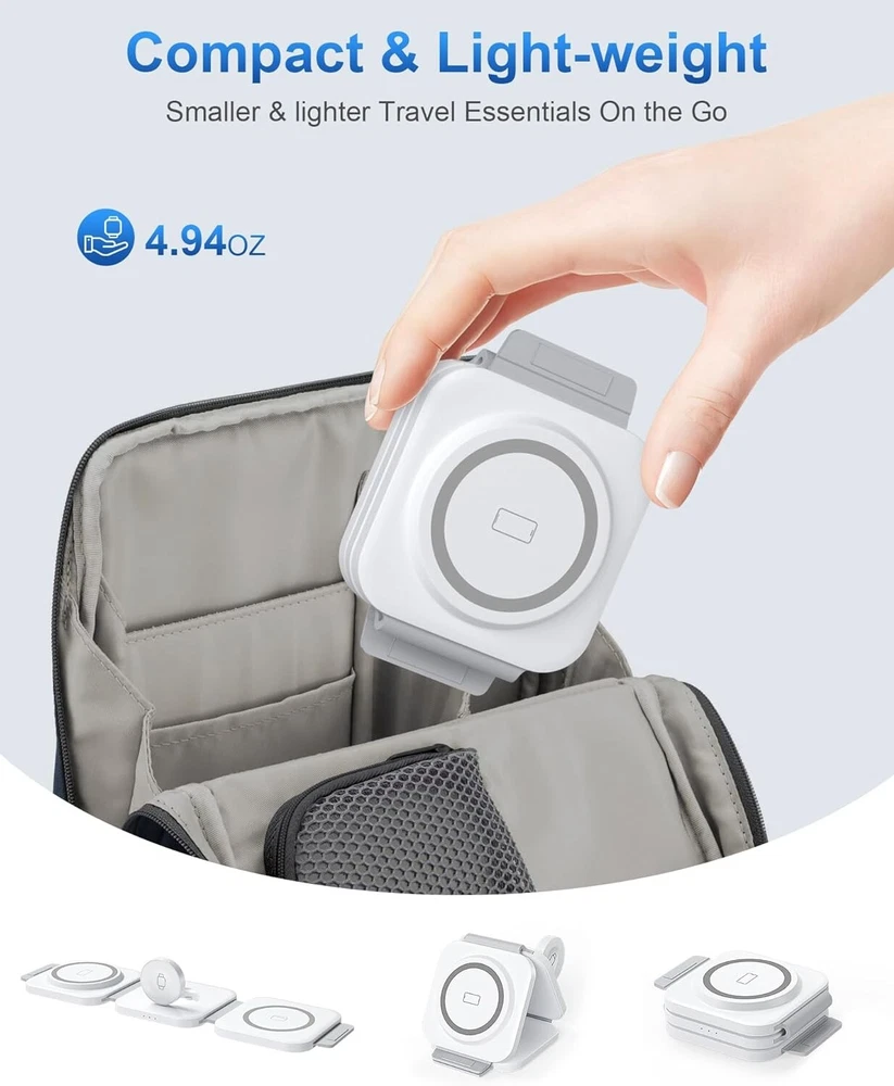 -Brand New - Never Used - Questions: Feel free to ask any Questions - BOX: Never Opened - DESCRIPTION: ✅Excellent Organizer: 3 in 1 Wireless Charging Station for Apple Devices is a great option to organize your bed night stand, room, office, or meeting room, keeping your space neat and organized, making it a convenient charging solution for your busy lifestyle, say goodbye to the tangled adapters and cables. 🚀3 in 1 Fast Charging Station: Snap and Go! The 3 in 1 travel charger for apple features a cutting-edge intelligent chip, maintaining fast charging. Shorter charging times that you don’t have to wait in line to charge your accessories. Equipped with original 18W adapter and cable to ensure that your gadgets are added huge energy power simultaneously. Easy life hack. 💪Excellent Compatibility: Upgrade powerful magnetic alignment even support triangularly iPhone 15 Pro and MAX with the enlarged camera, without device drops! CINFII Wireless Charger is compatible with iPhone 12-15 Series ( iPhone 8-11 themselves don't support Mag-safe so that can be charged in the standard way, landscape screen mode must with Mag-safe case) Apple Watch S2-S9 and AirPods Pro/3/2(wireless charging case). 🌈 Portable Design: Soft silicone allows the charging pad for smooth 180°folding, doubles as a nifty phone stand in seconds. Plus, it is super slim and compact to fold, only weights 4.93 OZ and 1/2 size of iphone 15 Pro. The small portable wireless charger is designed for apple accessories and travel essentials for men & women that everyone will love. 🚀Safety First: The travel charger optimal temperature is 82-86℉. Features an intelligent temperature control system that interrupts charging if the temperature exceeds safe levels, and professional magnetic isolation to prevent radiation, protecting both your devices and your health. FCC certifild, no need to find a sweet spot anymore, just plug and charge. ✅3 Free Charging Ways: A variety of different placement. CINFII 3 in 1 travel charger for multiple devices can be lay-flat charging, stacked charging, as well as folded into a triangle stand. Free your hands to enjoy watching movies and entertainment, save space wherever you want it to sit without slip off. - OFFERS: Reasonable offers are considered, LOWBALLERS, Best price and Lowest askers will be ignored - all sales final/no refunds/ no exchanges/ no returns - Disclaimer: I do not own the brand's trademarks, logos, pictures, or products posted. I do not intend to infringe on copyright. I find such content available on the internet. Contents are considered fair use. -3 in 1 Wireless Charging Station for Apple MagSafe Charger, Foldable Magnetic Travel Charger for Multiple Devices iPhone 15 14 13 12 Series Apple Watch AirPods Pro