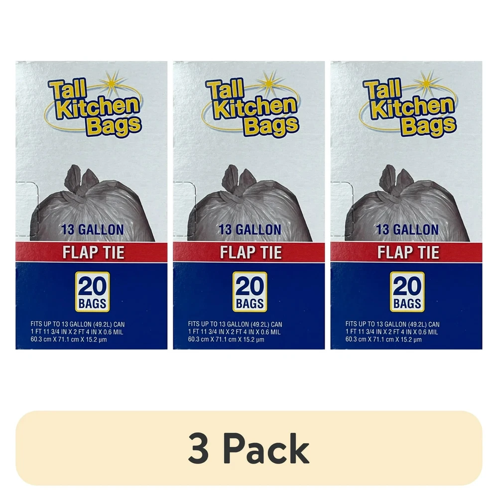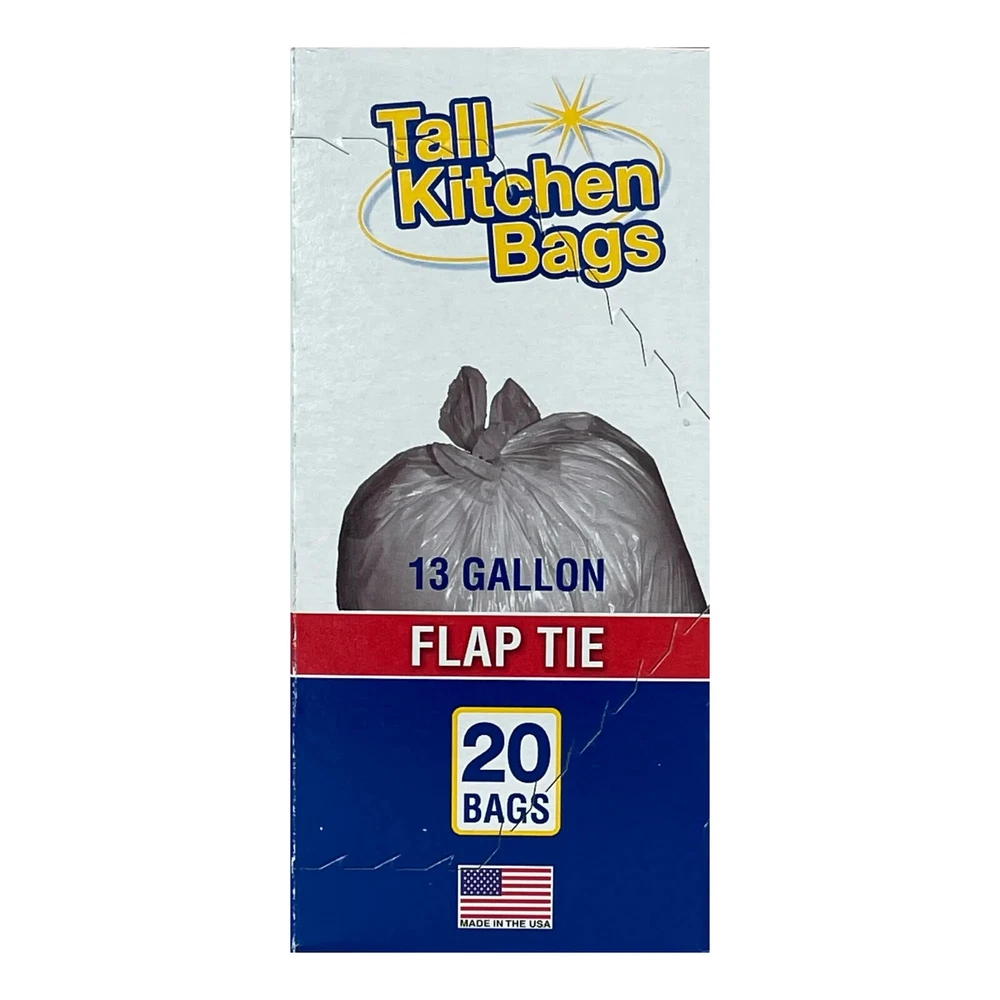 About this item 20 count 13 gallon Convenient flap tie closure Affordable Tall trash bag Ideal and convenient for everyday household use Made from LDPE plastic Come in an easy-to-open cardboard box