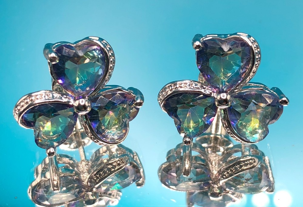 This 3 pc set features a stunning Mystic Topaz ring in size 8, a pendant on a 20" necklace, and matching earrings, all crafted from 925 sterling silver. The set is designed with a clover heart shape and multicolor Mystic Topaz stones, making it perfect for occasions like Mother's Day, Christmas, birthdays, and Valentine's Day. The jewelry set is not only elegant and beautifully crafted but also comes with a seller warranty, adding to its appeal for buyers looking for high-quality fine jewelry with a touch of luck-themed design. Sold and shipped right here in the USA ! No long waiting