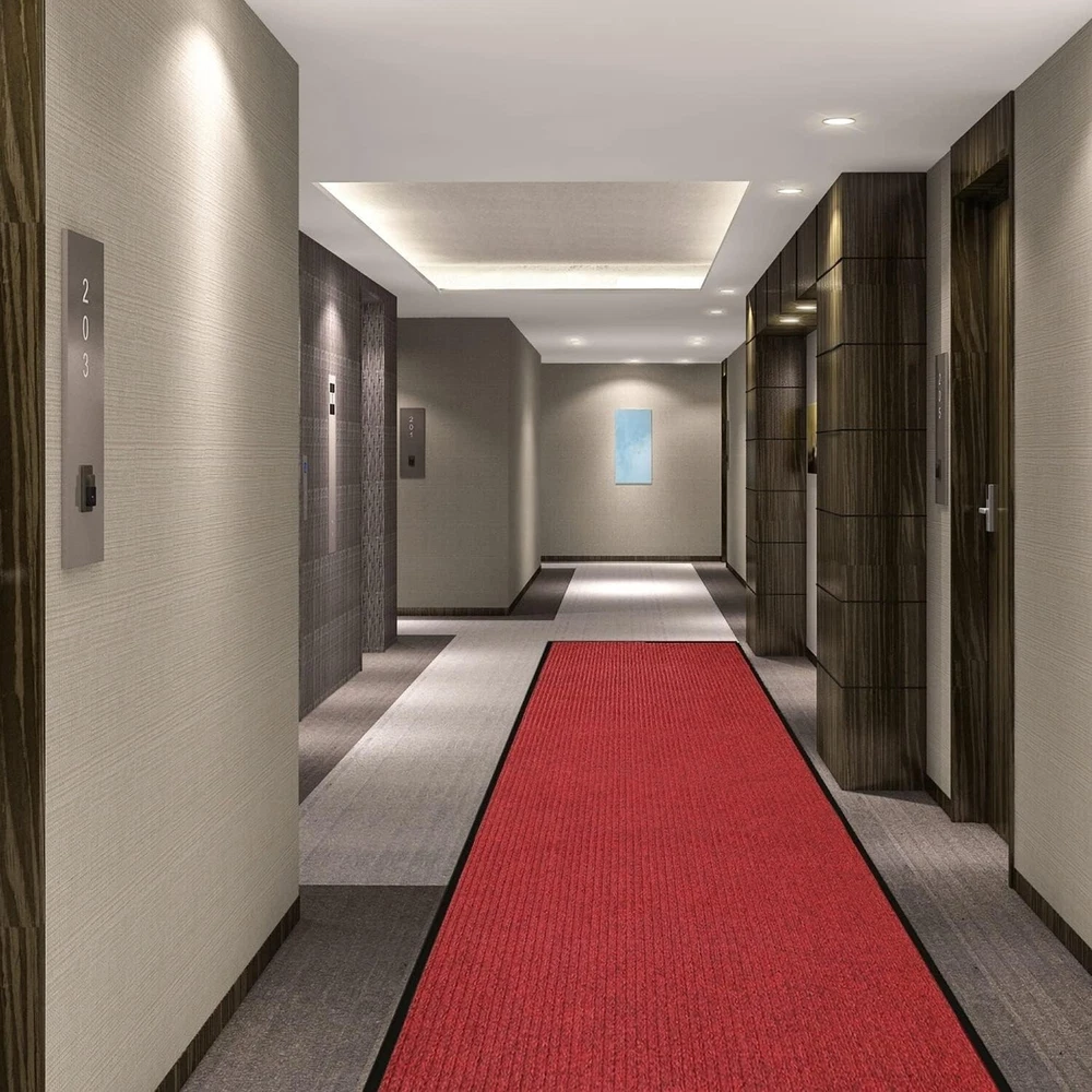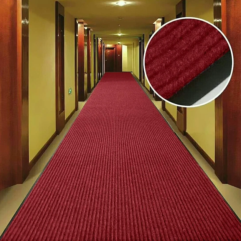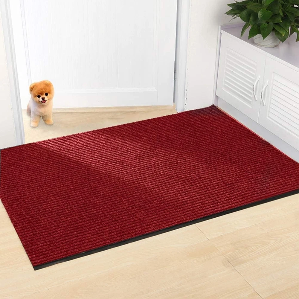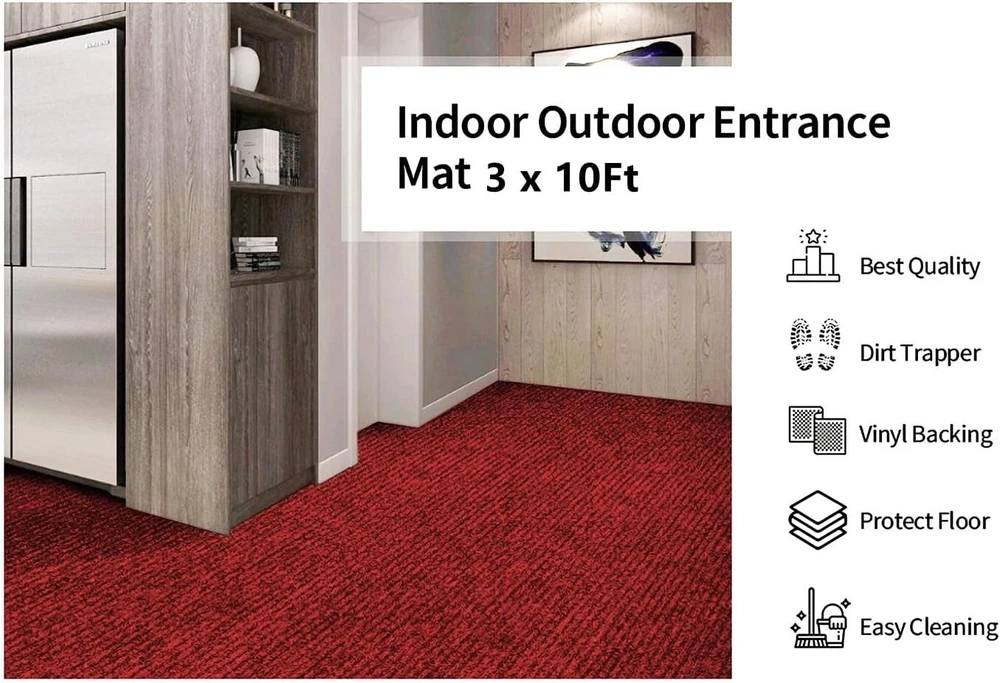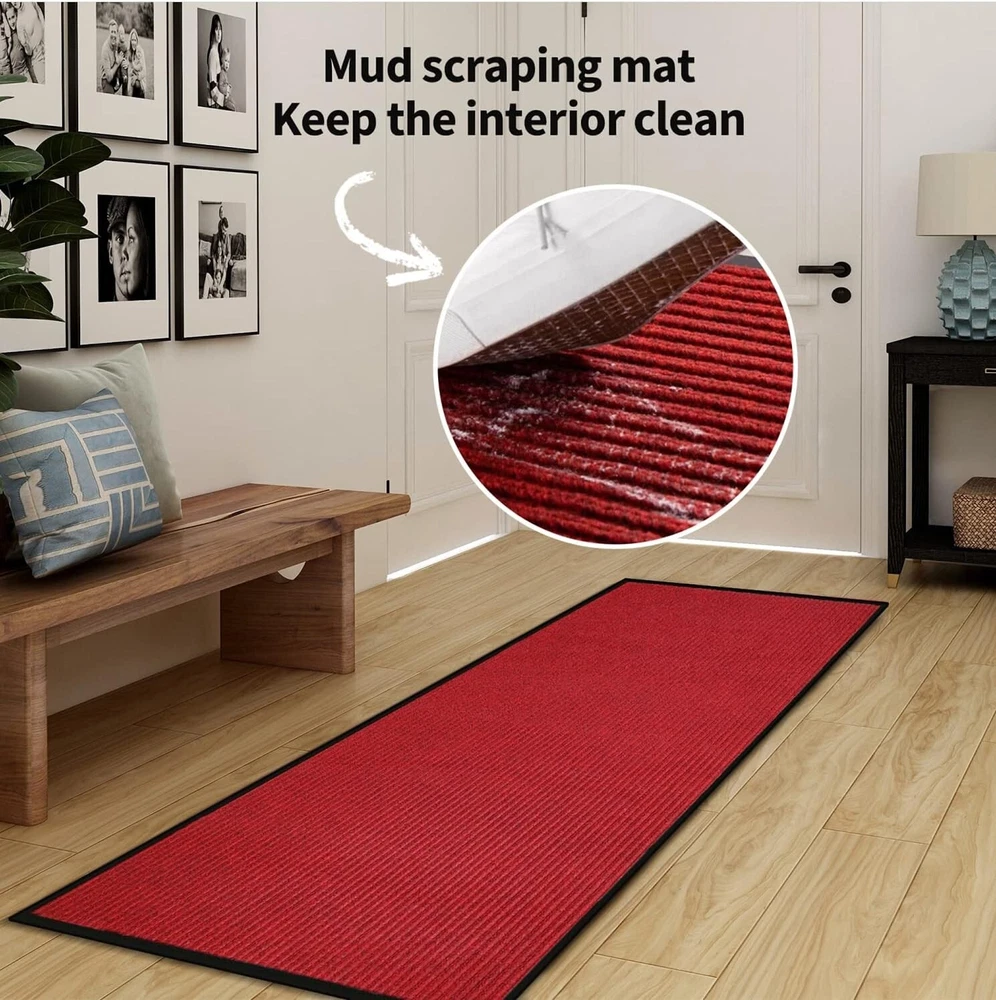 3' x 10' Brush Step Entrance Mat Heavy Duty, Commercial Grade Door Floor Mat Tough Entry Collection Slip Skid Entrance Mat with Rubber Backing Indoor Outdoor Rug Dark Red The large mats are made of high quality polyester and recycled rubber and includes non slip rubber backing which prevents moisture leaks while keeping the mat in place. Since the back side is processed with rubber material, it has excellent anti-slip resistance to stretching, Shrinking, Wrinkle and Abrasion. SIZE: W3'xL10'. 10mm cut with scissors, you can cut freely according to the space of the room. A mat that can be used both indoors and outdoors. The rugged high quality ribbed polyester design allows you to scrape dirt and debris from your shoes. Let the welcome mat clean off your shoes. Perfect for inside or outside entryways near door, closets, laundry, garage, patio or other high traffic indoor outdoor areas.
