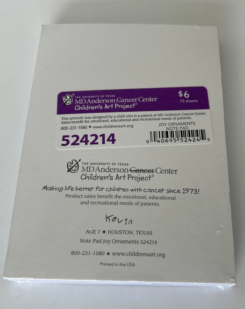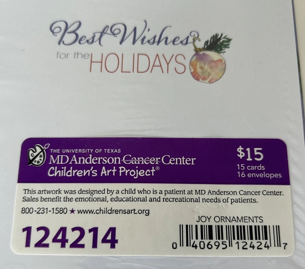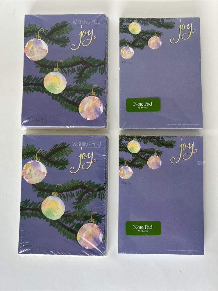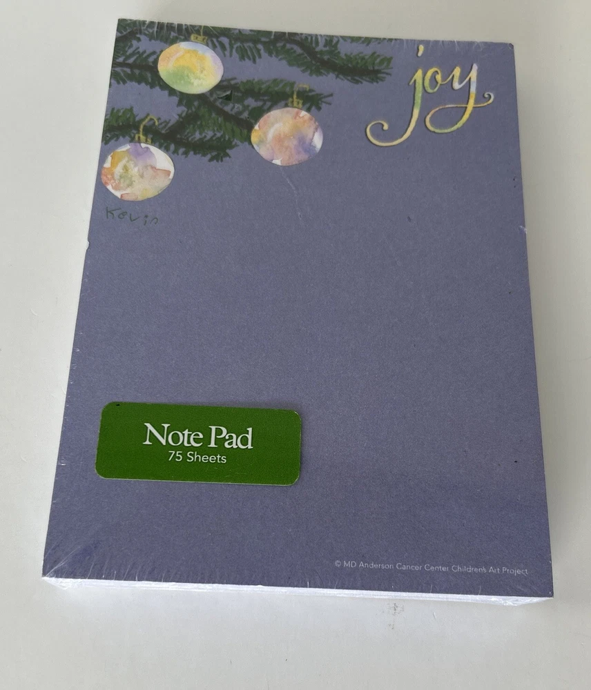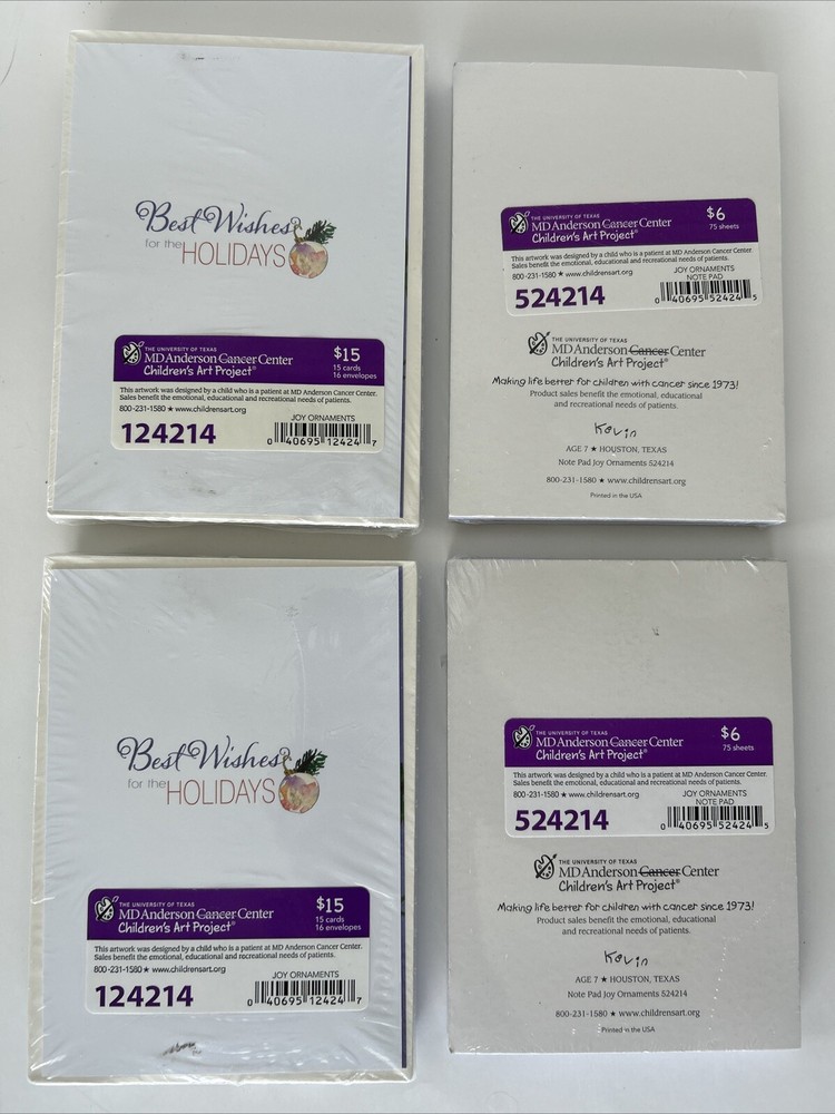 The University of Texas - MD Anderson Children's Art Project - Joy Ornaments 126214/524214 Wishing you Joy. Inside Message, "Best Wishes for the Holidays" - Christmas Tree Branches w Ornaments You receive 2 packs of 15 Cards and 16 Envelopes totaling = 30 Christmas Cards & 32 Envelopes AND 2 Sealed 75 Sheet Note Pads New in Sealed Packages - Please see pictures for details