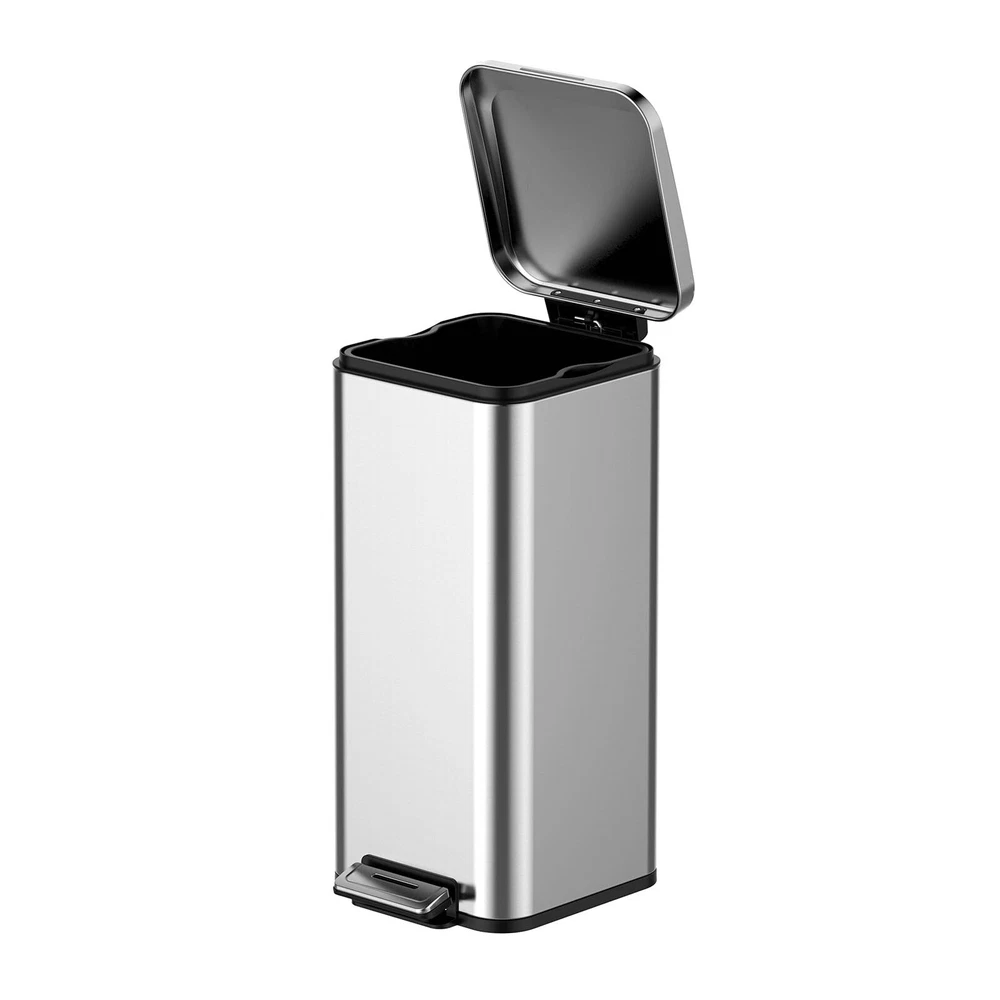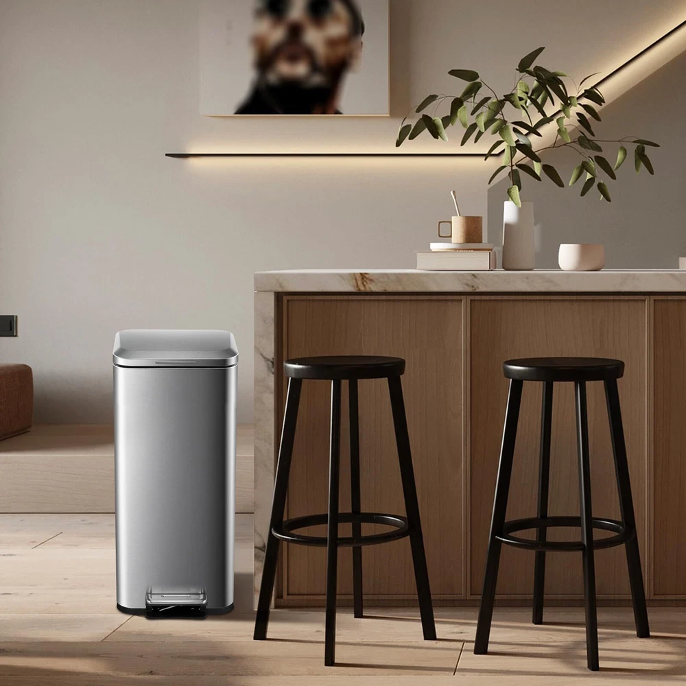 Meet our stylish 8-gallon stainless steel trash can, designed to enhance both functionality and aesthetics in your space! This modern garbage bin features a sleek, fingerprint-resistant surface that keeps it looking pristine while effortlessly blending into any decor. With its generous capacity, it’s perfect for busy kitchens, home offices, or anywhere you need efficient waste disposal. Built from high-quality stainless steel, this trash bin withstands daily use and adds a touch of elegance to your home. Keep your environment clean and chic with this essential addition! Product Highlights: Premium stainless steel construction for long-lasting use Soft close lid for quiet operation in any room Removable inner bucket for easy cleaning and disposal Hands-free foot pedal for hygienic, touchless access Pet-proof design to prevent unwanted rummaging and eliminate odors Specifications: Product Dimensions: 14.88" x 11.38" x 25.59" Capacity: 8 Gallons Product Material: Stainless Steel, Plastic Color: Silver Friendly Note: Please avoid using abrasive cleaners or scrubbing this trash bin, as they may scratch the stainless steel finish. A mild soap solution will work wonders! Sturdy Construction: Crafted from premium stainless steel, this 30-liter/8-gallon trash can ensures durability and longevity. It resists rust, dents, and scratches, maintaining its sleek look for years Soft Close Lid: Equipped with a soft close lid, this kitchen garbage can ensures quiet operation, preventing any noise disruption. The lid closes smoothly and silently, making it ideal for any room in your home or office Removable Inner Bucket: Featuring a detachable inner bucket, this trash bin makes waste disposal and cleaning a breeze. Simply lift out the inner bucket to empty or clean, maintaining a tidy and stylish space with ease Hands-Free Use: Designed with a convenient foot pedal, this touchless dustbin allows for hands-free operation, keeping your hands clean and hygienic. Perfect for busy kitchens, bathrooms, and offices Pet-Proof Trash Can: The lid keeps waste covered, preventing unpleasant odors from lingering. Its smart design stops pets from rummaging through the trash, ensuring a tidy, fresh space