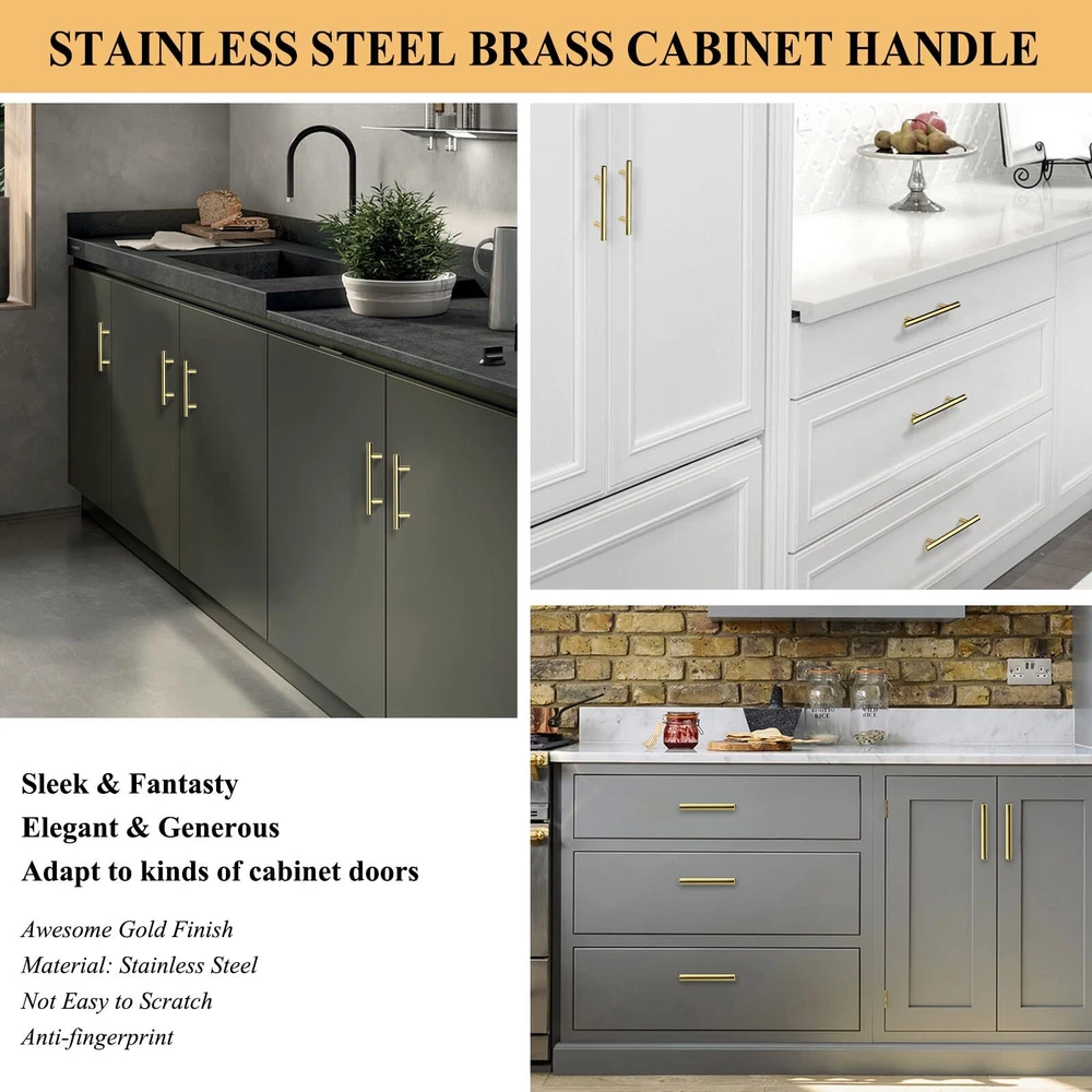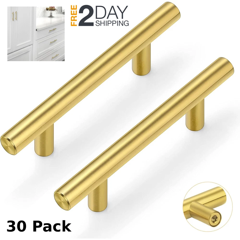 PREMIUM MATERIAL: Plustool Gold Cabinet Handles are made of high-precision quality stainless steel with perfect brushed brass finish, which do not leave any fingerprint; The flat surface of dresser handles is smooth without losing texture, not easy to fade,rust,oxidation and easy to clean; Durable and strong, elegant addition to any home SAFE DESIGN OF ROUNDED EDGES: The modern euro round style pulls are designed of round body; Compared with the square handles, the round edges design is safer and prevents scratching, which makes the drawer pulls feel more comfortable in use; In addition,the pulls base adopts high-precision drilling technology, and the deep spiral design is much stronger MEASUREMENT: Hole Centers: 3 inch(76mm), Overall Length: 5 inch(127mm),Height: 1.2 inch(32mm),Diameter: 0.4 inch(12mm) You will receive 30PCS cabinet handles, each handle in the box is individually wrapped to avoid scratching during shipping TWO SIZES SCREWS: We offer 1" and 1.57" screws that help you to fit different thickness of the furniture; Matched with 4 screws( 2 x 1'' and 2 x 1.57'') per handle WIDELY COMPATIBLE: Suitable for different styles of cabinets, use these gold hardware to decorate your cabinets or update some old furniture,bring you a modern look; Very stylish and unique. Ideal for kitchen, bathroom, bedroom, cabinet, drawer, dresser, door, cupboard, wardrobe, closet; Smooth and clear stainless steel handles, great helper to pull out drawer soon and conveniently