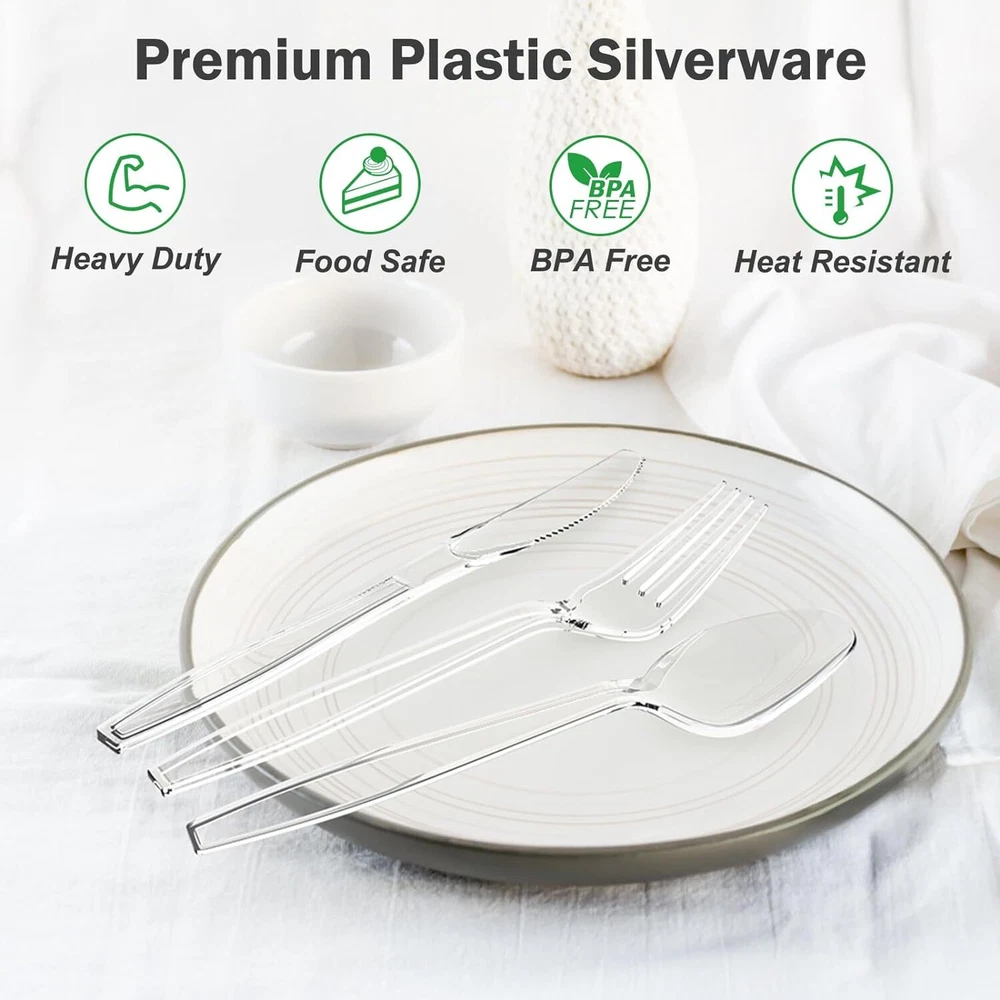 300 Count Extra Heavy Duty Clear Plastic Silverware, 100 Forks, 100 Product Details Brand: Dealusy Number of Pieces: 300 Material: Plastic Color: Clear Product Care Instructions: Hand Wash Only Recommended Uses For Product: Home, Party, Pacnic Special Feature: Food Safe, BPA Free, Heavy Duty, Heat Resistant, Strong & Durable Finish Type: Smooth Included Components: 100 Forks + 100 Spoons + 100 Knives Style: Silverware Set 【Premium Material】: Dealusy clear plastic silverware heavy duty are made of food grade polystyrene, total BPA free and toxin free for your healthy meals. 【Extra Heavy Duty】: Our heavy duty plastic utensils set, plastic cutlery set disposable with edge thickened design won’t bend easily. 【Heat Resistant】: These disposable plastic silverware set can withstand a high temperature, ideal for hot and cold food. 【300 Value Pack】: This disposable cutlery bulk contains 100 forks, 100 spoons & 100 knives, perfect for your everyday use or serving a wedding, panic, party etc. 【Disposable or Resuse】: These strudy and durable plasitc silverware are suitable for disposable use, or you can wash to reuse.