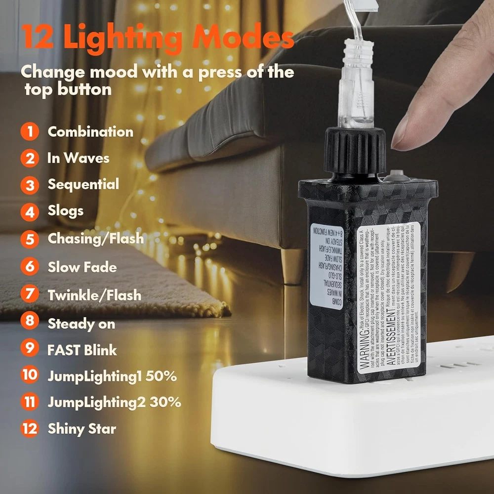 12 MODES SETTINGS: This fairy curtain lights offer a range of adjustable settings to suit your desired atmosphere. Choose from combination, in waves, sequential, slogs, chasing/flash, slow fade, twinkle/flash, steady on, fast blink, jumplighting1 50%, jumplighting2 30% and shiny star. With these easy-to-adjust settings, you can effortlessly customize the lighting effects to match your desired atmosphere. EXCELLENT QUALITY: 6.6ft*9.8ft(width*length), 300 WARM WHITE LED string lights. UL Certificated Output and wire: 29V Voltage Safe Curtain Lights with UL certified, leads to 29V safe output by UL plug-in transformer. EASY OPERATION: Plug the led curtain lights in for instant power and unplug for quick shutdown. Designed for US standard outlets, with a generous 9.9ft leading wire for convenient positioning. VERSATILE DECOR: WATERPROOF(IP44) Suitable for both indoor and outdoor decorations in various occasions, including Christmas, Halloween, parties, Valentine's Day, weddings, and more. Whether you want to decorate your home, window, bathroom, or create a festive atmosphere in a restaurant, hotel, commercial building, or shopping center, these lights are an ideal choice. LOVELY LIFE ENHANCEMENT: Indulge in the magical and mesmerizing ambiance created by the enchanting glow of these LED curtain string lights. - -THIS PRODUCT INCLUDES ONLY THE STRING LIGHTS AND DOES NOT COME WITH A CURTAIN. It is primarily intended for curtain decoration, allowing you to add a touch of magic and elegance to your space. NOTE 1 - The transformer and mode controller of these curtain lights are waterproof IP44. While they can withstand normal outdoor use, please note that they should not be submerged directly in water. If you plan to use them outdoors, it is recommended to use a waterproof receptacle cover for added protection. NOTE 2 - The White buckle provided is intended for fixing the main power cord line. It is important not to cut the cord, as doing so will result in the separation of the string lights. Product Description 8 Modes Setting 1. Combination 2. In Waves 3. Sequential 4. SloGlo 5. Chasing/Flash 6. Slow Fade 7. Twinkle 8. Steady On High Brightness 300 WARM WHITE LED lights, widespread lighting source, provide powerful light, and create romantic life for you. Waterproof The curtain light is waterproof and designed to withstand light rain, perfect for outdoor indoor decoration. Twinkle Star 300LED Warm White Curtain String Lights create romantic life for you. Specifications: Size: 6.6ft x 9.8ft LED Color: WARM WHITE LED Quantity: 300 LEDs Waterproof Level: IP44 Voltage: 110V, Output: 29V safe low voltage (Includes UL plug-in transformer) Leading Wire: 9.9 ft Notes: 1. The transformer and mode controller are waterproof IP44, so they can meet normal use outside but not enough to put under water directly, please use a waterproof receptacle cover for outdoor use if possible. 2. White buckle is to fix the main power cord line, can not be cut, otherwise the string lights will be separated!