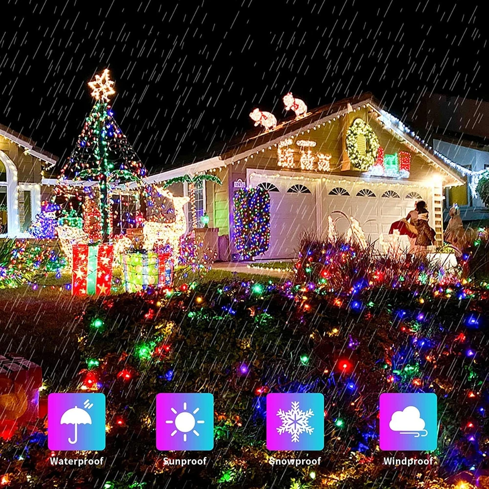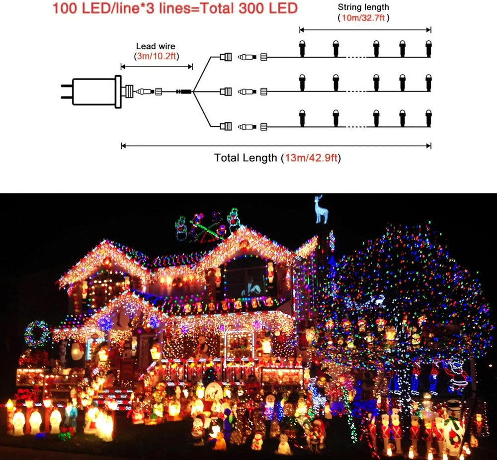 UNIQUE CHRISTMAS LIGHTS DESIGN: 300 led lights branch into 3 separate directions, every direction includes 100 mini lights. The special design makes it super easy to wrap different areas of the Christmas tree evenly, tangle-free. UPGRADED LED CONSTRUCTION: Christmas lights, in between the size of tiny rice lights and typical Christmas outdoor lights, shine like a diamond. A special parallel connection stops the traditional shortcoming of one light is off, all lights are off. 8 MODES MULTICOLOR CHRISTMAS LIGHTS: You can choose the most suitable mode according to mood and different scenes. And the Christmas lights have timer, press the button for 3 seconds to set and reset timer. The green light is ON means the timer is ON. UL APPROVED FOR SAFER USE: UL588 certification transformer won't overheat after a long time of use, low consumption, high safety. And Plug in string lights are more stable than solar, they will light up your yard for year-round. WIDE APPLICATIONS: 300 LED multicolor Christmas lights are IP44 waterproof and the wire color is green. Perfect for indoor & outdoor use. Ideal for weddings, patios, Christmas trees, reindeer wireframes, party decorations, etc. JMEXSUSS 300 LED Christmas Lights Outdoor