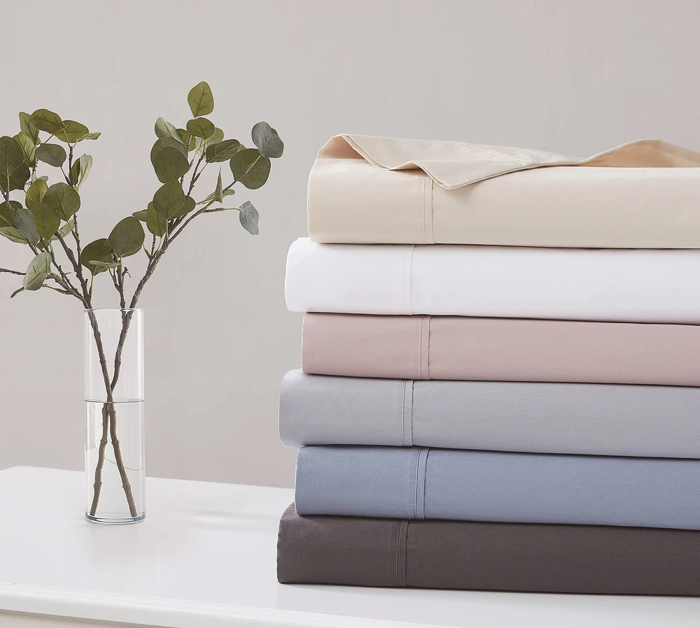 Enhance the idea of comfort with this 300 thread count cotton sateen sheet set. This fabric is made from long-fiber woven threads that create a silky, soft and smooth feel that will wear well over time. The fitted sheet's 15 inch pocket will fit any mattress up to 18 inches and the elastic edges will help to keep it in place. With a variety of colors offered and a sensational yet subtle sheen, this collection is guaranteed impress. 300TC Cotton Sateen Enhance the idea of comfort with this 300 thread count 100% cotton sateen collection offered in a variety of luxurious colors. Includes fitted sheet (72x84 inches) with 15 inch pocket to fit up to a 18 inch deep mattress, flat sheet (108x102 inches), and pillowcases (20x40 inches) 100% Cotton Machine washable