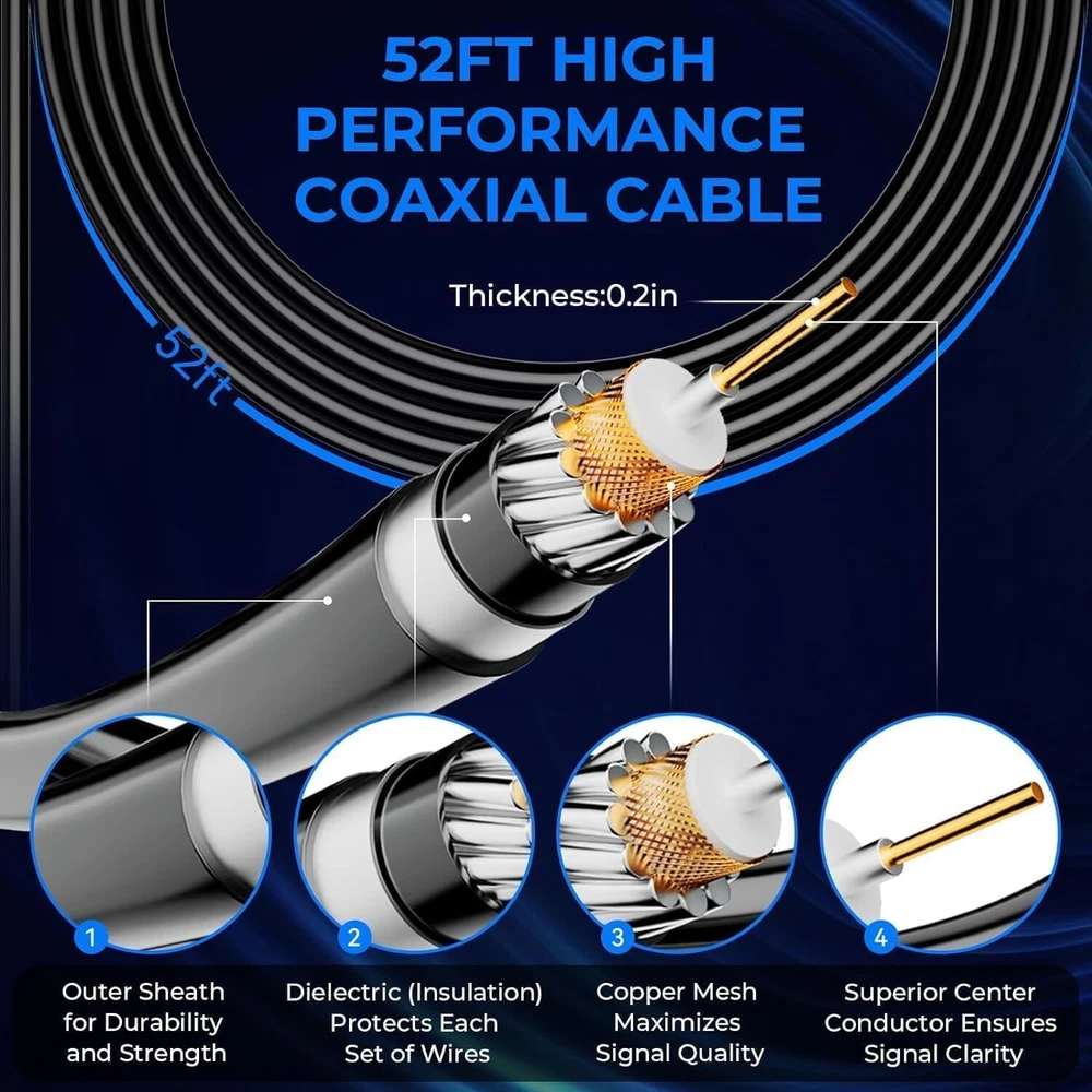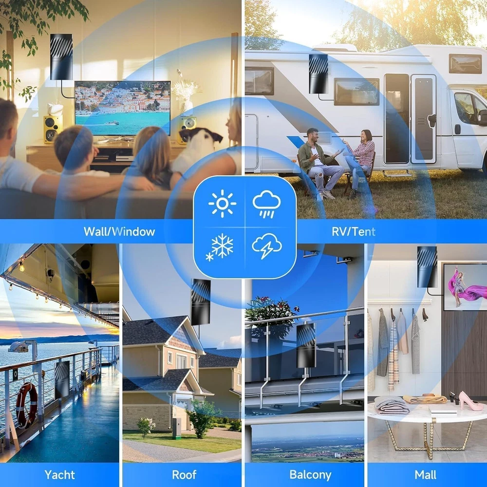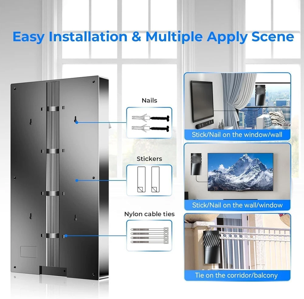 Are you feeling helpless when you are far away from the signal towers? Our tv antenna can accept up to 2200+ miles range signal! Choose us, you will get an 'unbelievable feast for the eyes’. 1:HD Local Channels: With our best digital antenna for smart tv, you will enjoy crystal clear FULL HD channels with HD crystal pictures and clear sounds quality like ABC, CBS, NBC, PBC, CW, Fox, Univision and so much more! 2: 2200+ Miles Long Range Reception: This indoor tv antenna can receive 2200+ miles range for local channels, which can also be placed outdoor for receiving channels. Support Format:720p,1080pi, 1080p/ATSC. 3: 52ft Long Coxial HDTV Cable: Comes With 2024 UPGRADED 52ft coaxial cable, you can place this tv antenna anywhere you want, which suitable for living room, bedroom, basement, rv and so on. Just enjoy all local hd channels with your family or friends 360° Receive Full Free HD Channels: Don't hesitate to choose 2024 Newest advanced TV Antenna from , you will pay 0 COST for TV for life! With this digital tv antenna, enjoy hundreds of crystal clear FULL HD Free channels like ABC, CBS, NBC, PBC, CW, Fox,Univision and SO MUCH MORE! Start to access all news, sports, sitcoms and kids programs at home at ease. Antenna-THE BEST ADVANCED TOOL TO RECEIVE CHANNELS WITHOUT MONTHLY BILL FOR LIFE! 3000+ Miles Long Range Smart TV Antenna: Our company has updated amplifier signal booster of this smart tv antenna for receiving 3000+ miles range for local Channels. Advanced signal booster optimizes the signal transmission protection against interference with other signals, which can make sure you can get more channels even you are far away broadcast towers. Support Format: 8K 4K 1080p /ATSC. 2024 Newset Smart IC Chip: Our tv antenna for smart tv adopts in newest generation powerful amplifier and signal booster, which built-in the BEST Smart IC Chip and Filter Technology.This new technology filters out cellular and FM signals resulting in receiving more clear pictures, lower noise and access to more free broadcast signals with enhanced gain, range and performance. 52ft Long Coxial HDTV Cable & USB Power Adpater: Comes with 52ft coaxial HD cable, which means you can place this indoor/outdoor antenna to get best reception in anywhere,especially for customers whose TVs are quite far away from windows. If there is no USB output for connecting digital antenna to the power supply on the back of your TV, this smart IC USB POWER ADPATER will help you. Easy Installation Indoor/Outdoor TV Antenna: JUST NEED ONE MINUTE! You can install this modern tv antenna indoor/outdoor as you want. Here are three optional installation methods, nails on the wall, sticks on the window or tie to the shelf. Antenna can be placed in home, company, store, square, etc. The most exciting is that it can be an outdoor antenna in RV or tent when you're traveling. Warm Tips: If you have any problems please feel free to contact us and we will reply you within 24hrs! Professional Team and After-sales Guaranteed: If you have any issue with getting few channels,reception, installation or other problems, please feel free to contact us and our professional team will reply you with the best service and make you feel 100% satisfied. Reminder: 1: Re-scan channels after moving tv antenna, 2: Choose the short-range first! PACKAGE INCLUDE: ① Coaxial Cable ② TV Antenna ③ USB Power Supply Cable ④ Coaxial Cable Port ⑤ Signal Booster ⑥ USB Adapter 5V ⑦ Screws*4PCS ⑧ Expansion Screws*4PCS ⑧Expansion*4PCS ⑨Nylon cable ties*4PCS ⑩Double sided adhesive tapes*2PCS ⑪Positioning Card