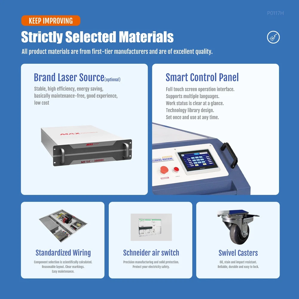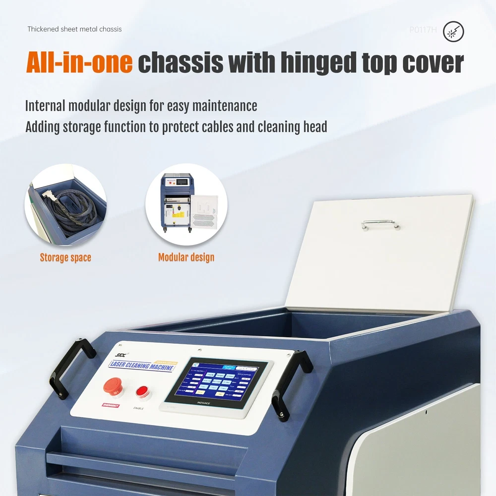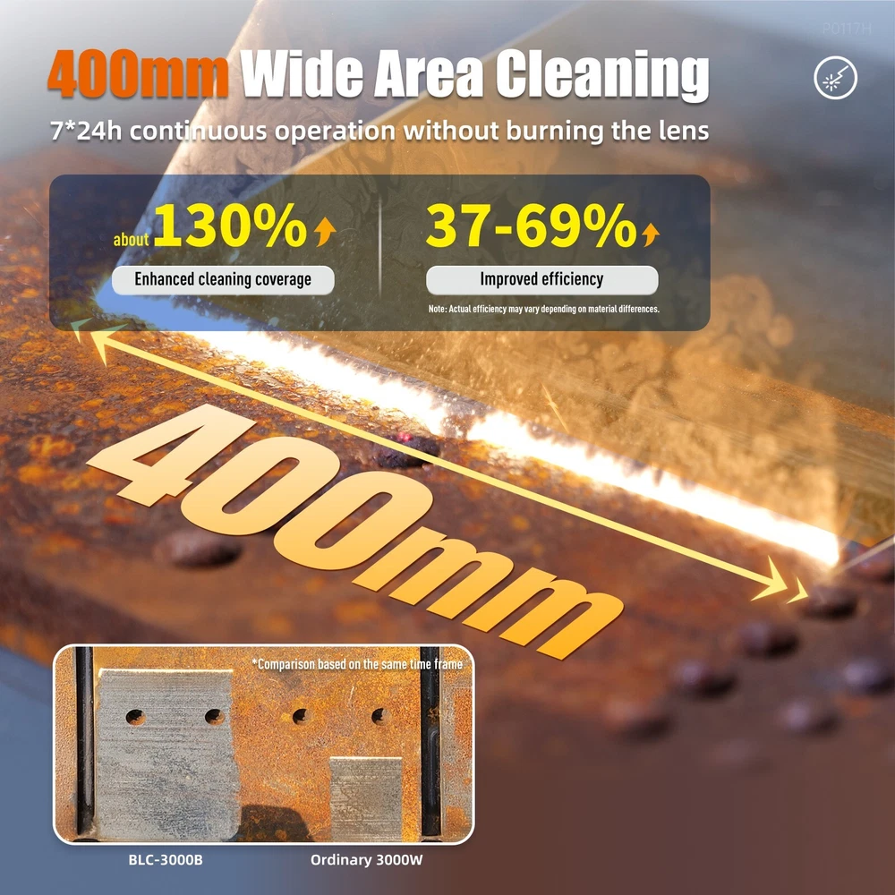 20 Years Manufacturer - CE, FDA Certificates No Extra Costs to Your Door - No Tariffs for US Customers Application to multiple scenarios : Mold cleaning, paint stripping or coating removal, pre-treatment of parts before spraying,aerospace component cleaning, oxides removal pre-treatment before soldering or welding oil pollution and product residues removal, cultural relics cleaning and repair, etc. Attention : Mill scale of hot-rolled steel , light-colored paint and high-temperature-treated paint or coating are not easy to remove, Please confirm with us before placing an order. it would be better to send samples for testing. BLC-3000B L aser C leaning M achine Wide scanning Range Cleaning Double Efficiency The applicable voltage is 220V, Equipped with a 220V three-phase to 380V three-phase transformer. Specifications Model: BLC-3000B Laser power: 3000W Laser wavelength: 1080+10nm Operating mode: Continuous/Modulated Fiber cable length: 20m Adjustable scan width: 10-400mm(standard F800 focal lens; focal length range 750-800mm) Voltage: AC380V±7% Total power: 13kw Cooling method: Water cooling (medium:deionized water, distilled water or purified water) Machine size: 1050*650*1070mm Net weight: 206kg Water tank capacity: 18L(need to add 14-15L water) Features&Advantages: 1.400mmWide Area Cleaning 7*24h continuous operation without burning the lens. 2. R emote C ontrol One-click control via smartphone, real-time parameter adjustments, and freedom from distance limitations. 3.Online Diagnosis Technical team will provide online remote support to resolve technical issues instantly. 4.Laser source Anti-Freeze technology E nsure worry - free low - temperature operation and prevent damage from low temperatures . 5.All-in-one chassis with hinged ton cover Internal modular design for easy maintenance. Adding storage function to protect cables and cleaning head. 6. Passed multi p le stringent tests in the industry , such as high temperature test, vibration test, fatigue test, cable bending test, high humidity test, anti-interference test. Reliable quality, stable and durable . If you have any questions, please feel free to let us know.