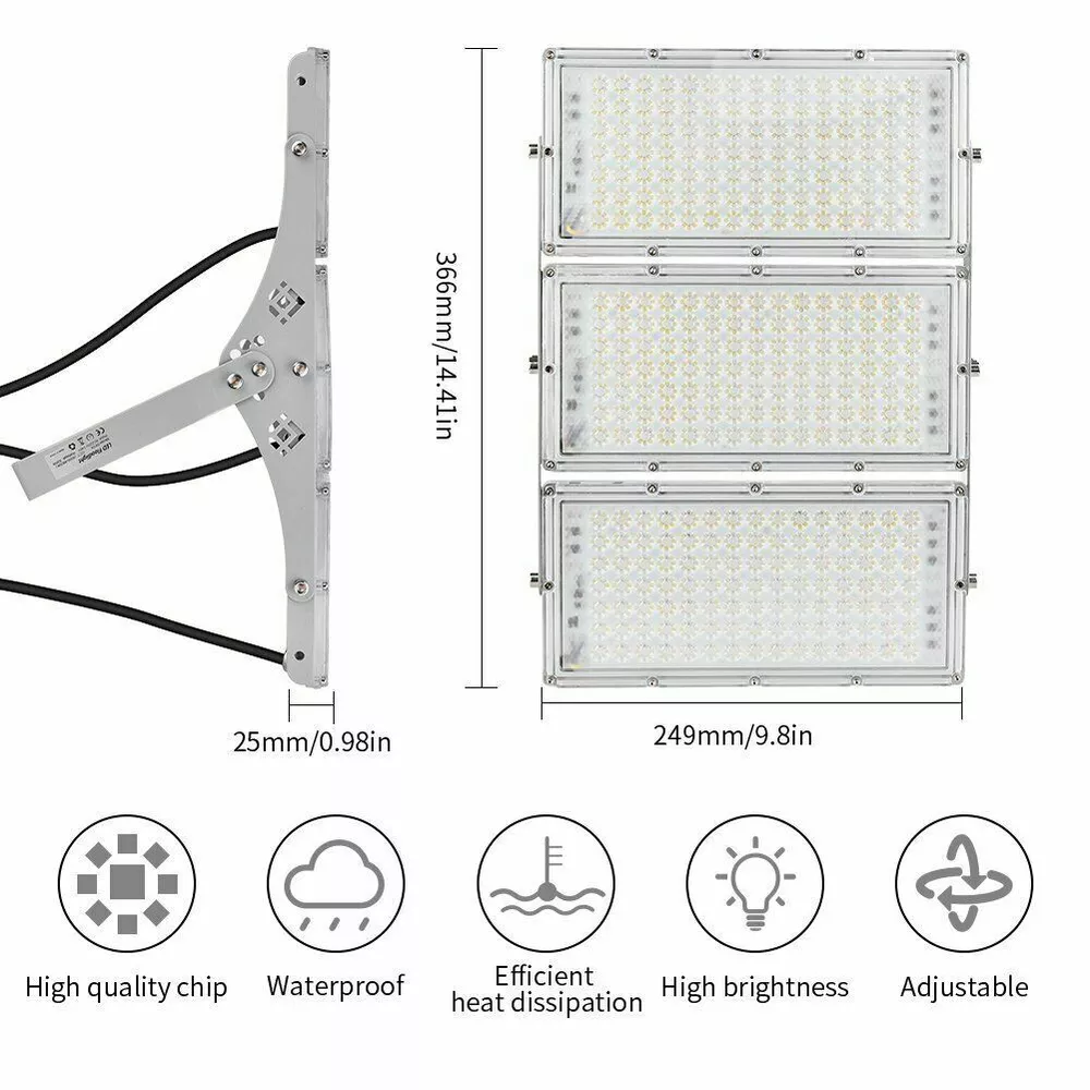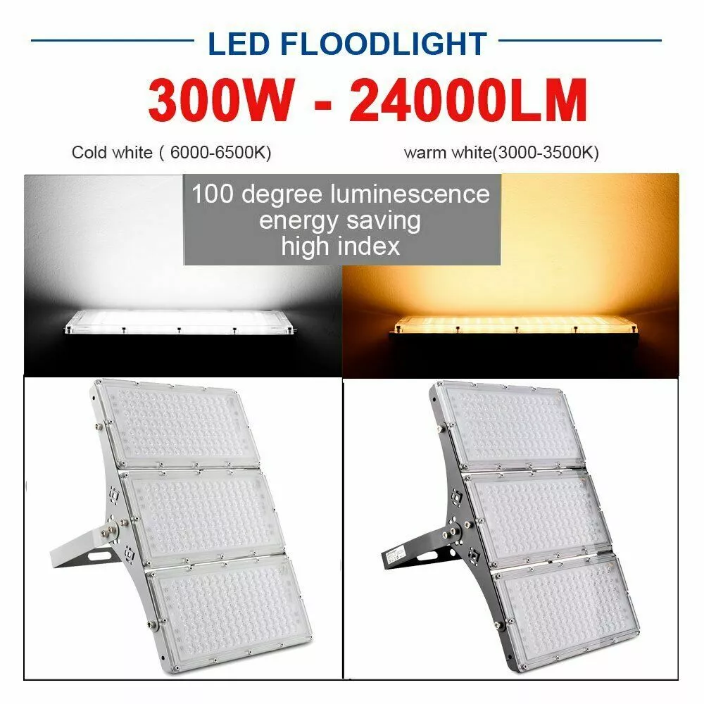 LED floodlights provide high performance, long life and energy saving in a simple, non-decorative traditional appearance fixture. Our Lighting introduces the latest solid-state LED technology to the market and uses the Helios technology we are applying for a patent, which provides a real lighting experience, both in the environment and in the appearance. LED floodlights guarantee better, cheaper and healthier lighting than traditional fluorescent lamps, and can easily be replaced by any existing lamps. Specification: Power:100W 200W 300W Input Voltage:110V Type:105pcs/210pcs/315pcs 2835 LED Type:LED Floodlight Lumens: 8000lm 16000lm 24000lm Color Temperture: Cool White( 6000-6500K) / Warm White(3000-3500K) Beam Angle:120° Material: Aluminium+PC Size (L*B*H): 100W: 249X112X25MM 200W:249X244X25MM 300W:249X366X25MM Life Span: >5,0000 S. Protection Grade:IP67 Certification: CE Approved & Rohs Compliant Energy Efficiency Class: A+ Feature: 1.Waterproof,IP67 2.Energy saving 3.Applicable to residential buildings, campuses, factories, parks, streets 4.Easy to install,Wall type, street lamp type Package: 1x LED Flood Light