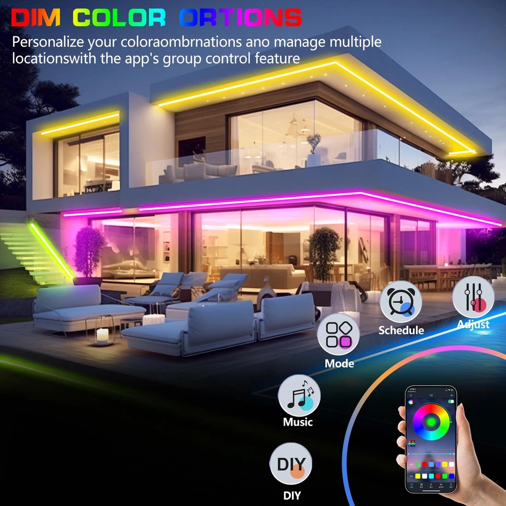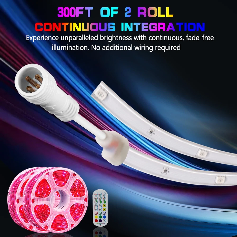 Our 300f LED strip lights come in 2 rolls, It offer a long option for adding decorative lighting to your outdoor spaces, No extra wiring, cleaner, simpler and more convenient These lights have a color changing feature that can be synced to music, The APP plays your favorite music and Outside Led Strip lights waterproof colors sync with the music. as well as a timer for convenient on/off control The DuoCo Strip App allows for easy control of the lights using your smartphone, and the included 2.4G RF remote has a control distance of up to 100ft Both the LED strip and control box are IP68 waterproof and come with strong double sided adhesive tape for easy installation This product includes 2 roll 150 Feet Waterproof Led Strip ,a UL listed 24V power adapter, a Control Box, a 2.4G RF Remote, User Manual