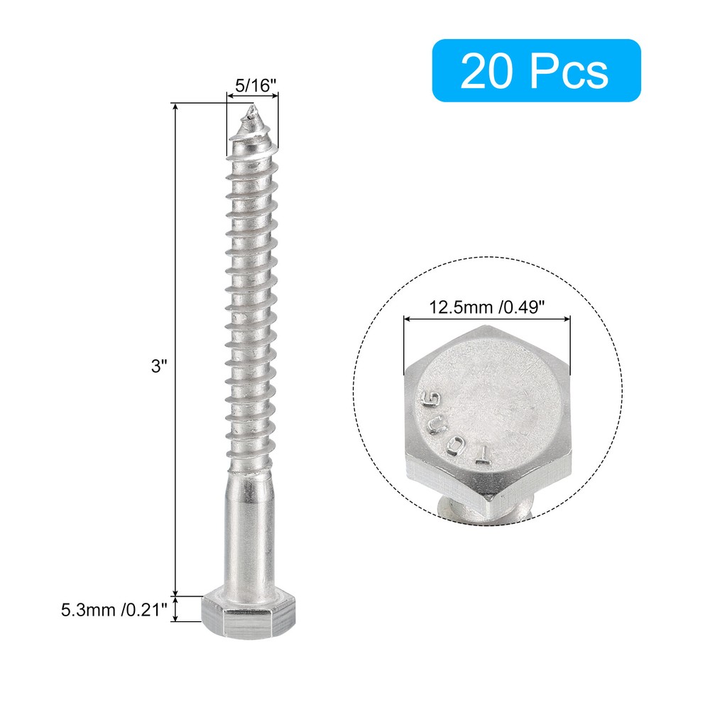 Document 1. Hex lag screws, also known as lag bolts, are wooden fasteners commonly used in construction projects such as building decks, fences, docks, bridges and other outdoor structures. They are hexagonal in shape with a pointed tip and have coarse threads making them strong and durable. They have a high level of holding power and are resistant to vibration and loosening.2. Made of 304 stainless steel material, which is corrosion-resistant and oxidation-resistant, ensuring that the bolts can withstand pressure and tension without deformation or breakage. The pickling passivation surface treatment gives the bolts a clean, beautiful and shiny finish.3. The hex self-tapping screws can be installed quickly and easily with a socket wrench or a hex wrench.4. Hex head lag screws can be used in a variety of applications including wood to wood, wood to concrete, and other heavy construction projects such as bridge building, dock building, deck building, shelving, furniture building, etc.Tips: To prevent splitting, drill a guide hole slightly smaller than the screw.Specification:Material: 304 Stainless SteelSurface Treatment: Pickling PassivationThread Size: 5/16" x 3"Threads Per Inch: 18Hex Head Size: 12.5 x 5.3mm / 0.49" x 0.21"(W*T)Package Content: 20pcs x Hex Lag Screws Hex Head Lag Screws Bolts, 20pcs 5/16" x 3" 304 Stainless Steel Wood Screws 1. Hex lag screws, also known as lag bolts, are wooden fasteners commonly used in construction projects such as building decks, fences, docks, bridges and other outdoor structures. They are hexagonal in shape with a pointed tip and have coarse threads making them strong and durable. They have a high level of holding power and are resistant to vibration and loosening. 2. Made of 304 stainless steel material, which is corrosion-resistant and oxidation-resistant, ensuring that the bolts can withstand pressure and tension without deformation or breakage. The pickling passivation surface treatment gives the bolts a clean, beautiful and shiny finish. 3. The hex self-tapping screws can be installed quickly and easily with a socket wrench or a hex wrench. 4. Hex head lag screws can be used in a variety of applications including wood to wood, wood to concrete, and other heavy construction projects such as bridge building, dock building, deck building, shelving, furniture building, etc. Tips: To prevent splitting, drill a guide hole slightly smaller than the screw. Specification: Material: 304 Stainless Steel Surface Treatment: Pickling Passivation Thread Size: 5/16" x 3" Threads Per Inch: 18 Hex Head Size: 12.5 x 5.3mm / 0.49" x 0.21"(W*T) Package Content: 20pcs x Hex Lag Screws Hot Item Payment 1.We accept eBay payment . 2.Payment must be received within 7 business days of auction closing. Shipping 1.We ship to your eBay or Paypal address. Please make sure your eBay and Paypal address is correct before you pay. 2.Items will be shipped within 1-3 business day when we received payment. 3.Delivery time depends on destination and other factors. Description Policy Hex Head Lag Screws Bolts, 20pcs 5/16" x 3" 304 Stainless Steel Wood Screws 1. Hex lag screws, also known as lag bolts, are wooden fasteners commonly used in construction projects such as building decks, fences, docks, bridges and other outdoor structures. They are hexagonal in shape with a pointed tip and have coarse threads making them strong and durable. They have a high level of holding power and are resistant to vibration and loosening. 2. Made of 304 stainless steel material, which is corrosion-resistant and oxidation-resistant, ensuring that the bolts can withstand pressure and tension without deformation or breakage. The pickling passivation surface treatment gives the bolts a clean, beautiful and shiny finish. 3. The hex self-tapping screws can be installed quickly and easily with a socket wrench or a hex wrench. 4. Hex head lag screws can be used in a variety of applications including wood to wood, wood to concrete, and other heavy construction projects such as bridge building, dock building, deck building, shelving, furniture building, etc. Tips: To prevent splitting, drill a guide hole slightly smaller than the screw. Specification: Material: 304 Stainless Steel Surface Treatment: Pickling Passivation Thread Size: 5/16" x 3" Threads Per Inch: 18 Hex Head Size: 12.5 x 5.3mm / 0.49" x 0.21"(W*T) Package Content: 20pcs x Hex Lag Screws Hot Item Payment 1.We accept eBay payment . 2.Payment must be received within 7 business days of auction closing. Shipping 1.We ship to your eBay or Paypal address. Please make sure your eBay and Paypal address is correct before you pay. 2.Items will be shipped within 1-3 business day when we received payment. 3.Delivery time depends on destination and other factors.