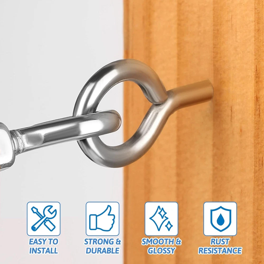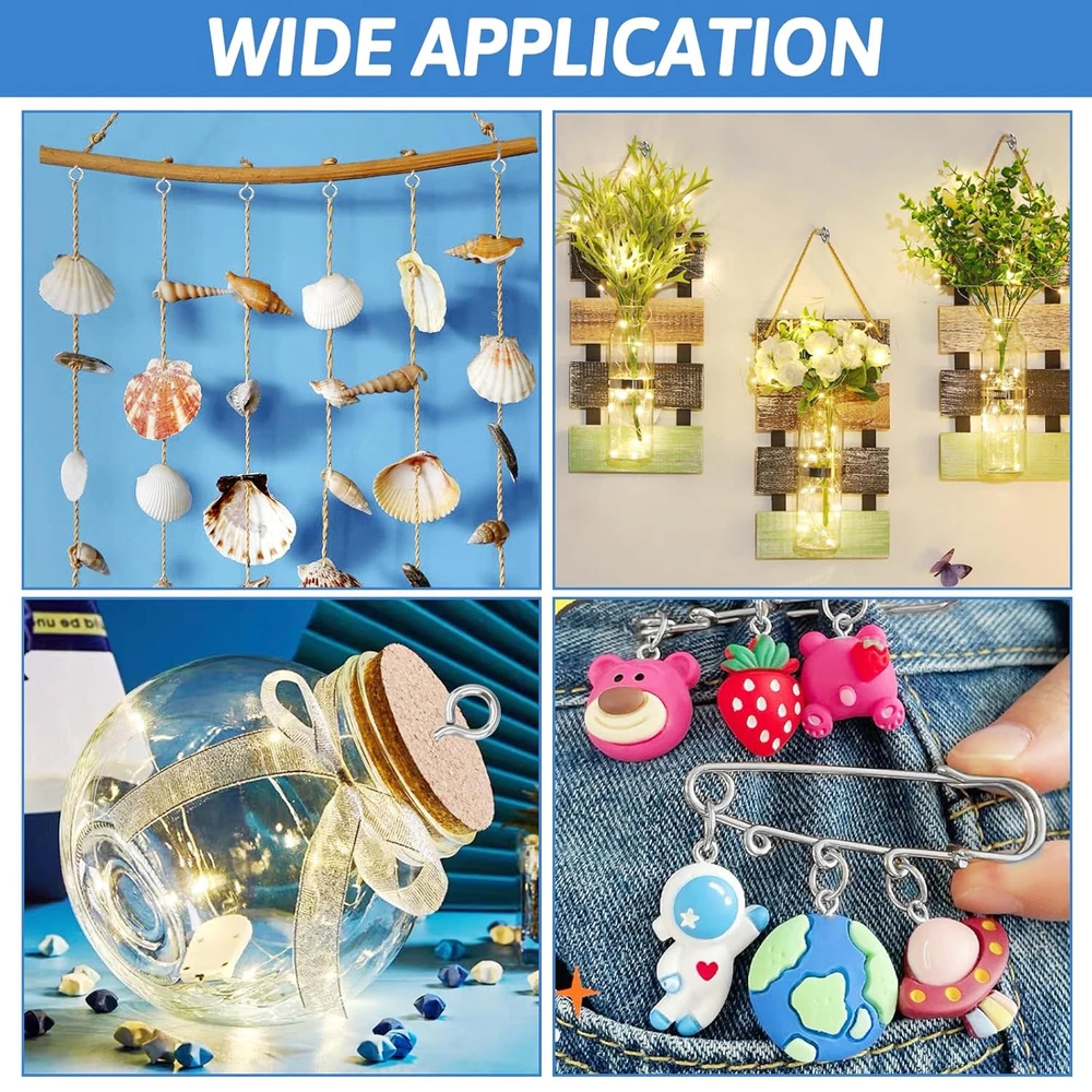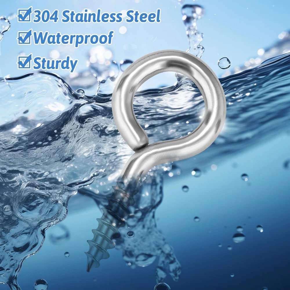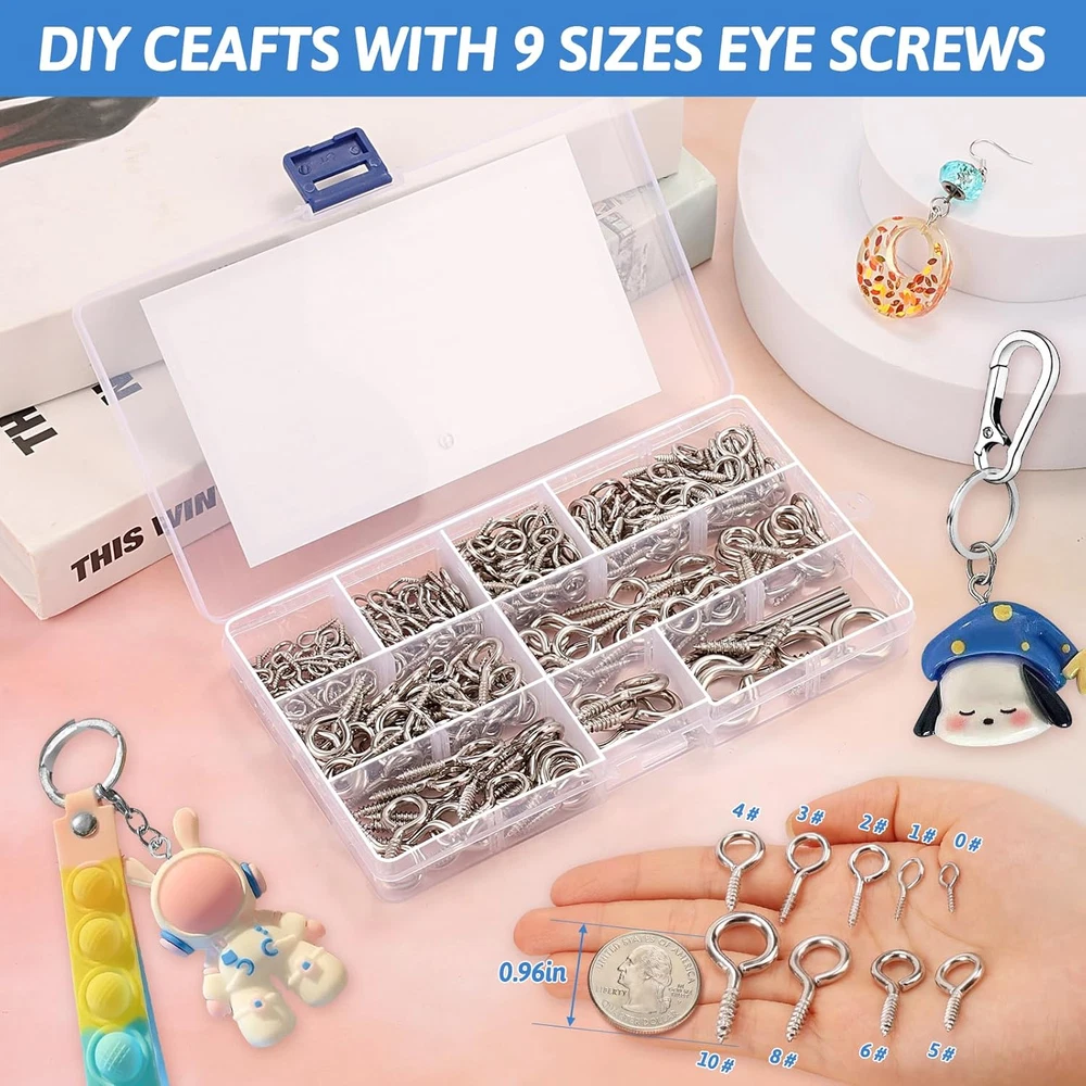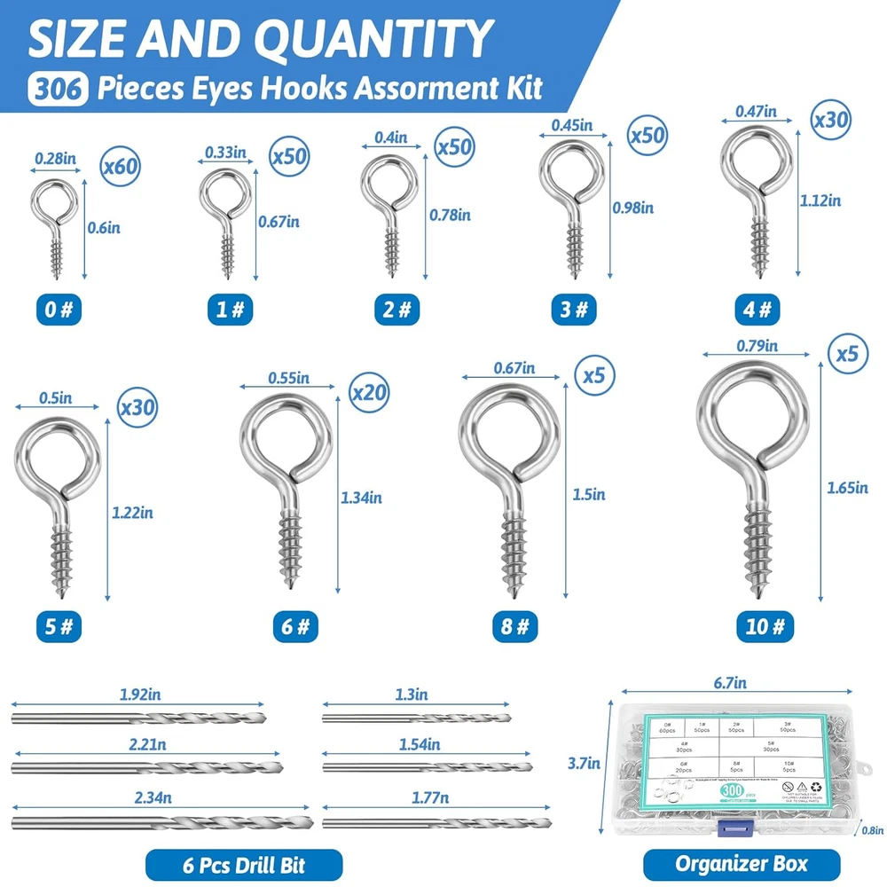 [9-Size Eye Screws Assortment Kit]: You will receive 300 eye hooks, 6 drill bits, and 1 multi-compartment storage box. The silver eye hooks screw come in 9 different sizes: (0#0.6")x60, (1#0.67")x50, (2#0.78")x50, (3#0.98")x50, (4#1.12")x30, (5#1.22")x30, (6#1.34")x20, (8#1.5")x5, (10#1.65")x5. With such a large quantity and variety of sizes, this kit can meet a wide range of your needs. [Rust-Resistant and Durable]: The eye hook screws are made of high-strength carbon steel and undergo multi-layer nickel for durability. These screw hooks are resistant to bending, corrosion, and oxidation, which significantly extends their lifespan. They can easily handle harsh conditions like high altitudes, rain, snow, and damp environments. [Easy to Install]: The eye screws feature a self-tapping design, allowing them to quickly penetrate and secure to wood surfaces. Their smooth, refined surface ensures comfortable handling and easier installation. For drywall applications, you can use the included drill bits to create holes before installing the eye bolts. [DIY Crafts]: These assorted eye pins are perfect for various DIY projects involving small items and tools. Use them for cork bottle charms, clay resin pendants, earrings, wind chimes, jewelry-making, photo hanging, art frames, light string suspension, Christmas lights, and decorative lighting. [Heavy-Duty Hanging Applications]: Larger eye hooks screws are suitable for securing clotheslines, chandeliers, ring lights, sun shades, swings, fences, and other heavy items. These eye bolts screws are neatly stored in a multi-compartment box, making them easy to organize, store on shelves, and carry around. Product Description WHAT YOU WILL GET? Our complete eye hook kits come in every size you need, allowing DIY craft projects and outdoor fixed hook applications to be realized at the same time. PRODUCT DETAILS Smooth And Safe The smooth and rounded outer paint surface is free of burrs and comfortable to the touch, so it won't hurt your fingers and even kids can use it with confidence. Sharp Tip And Clear Thread The sharp tip can be easily inserted into the wooden wall, and the clear and deep threads provide a firm grip, which is not easy to loosen in long-term use. Waterproof And Druable The surface has been plated with multiple layers of zinc-nickel plating, bright color, excellent waterproof and rustproof, and adaptable to all kinds of weather conditions. EASY TO DIY These well-made eye hooks are perfect for making cute little charms. You can choose the right size to upcycle earrings, keychains, and more! WIDELY APPLICATIONS OUTDOOR PROJECT APPLICATIONS Sunshade Sail Fixing Pin Clothesline Fixing Point Light String Hanging