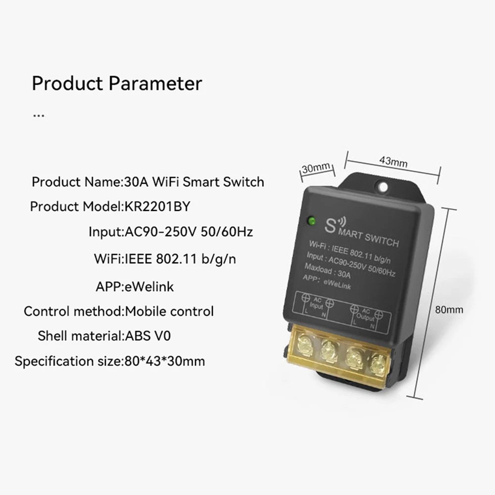 [ Voice Task Control ] Smart Relay WiFi Switch can turn on or off the lights by voice task, freeing you from the hassle of turning on the lights at night, useful to keep your baby away from your phone. [ High-power Appliances Switch ] Wifi Switch Module is suitable for high-power electrical appliances, such as swimming pool pumps, and the maximum current can reach 30A, effective to realize life. [ Automatic Timer Schedule ] Smart Wifi Light Switch is automatic to turn on or off home appliances according to your preference, setting countdown, scheduled, and recurring timer, effective to create your love life. [ Remote Connection ] Wifi Relay Switch is remote to control your connected device, no matter where you are, easy to control your connected devices from your smartphone. [ Dual-mode Control ] Wifi Relay Module is featured with WiFi and BLE two control modes, providing you with smart home mode without adding new configurations, used for BT mode required a wireless gateway for remote control. Description: Wireless Relay Switch Module can use voice to turn on or off and set countdown, scheduled, and recurring timer. It can be suitable for high-power electricity appliances and remote to control for connection. It has two controlling mode for a better life. Specifications: Product Name: Smart Wifi Light Switch Wireless connection method: WiFi+BT Current: 30A Net weight: about 93g Packing List: Smart Wifi Switch Module*1pcs Notes: 1. Due to the lighting effects and filming angles, there is a color difference in the product, please understand. 2. Due to manual measurement, there is a tolerance in the product size.